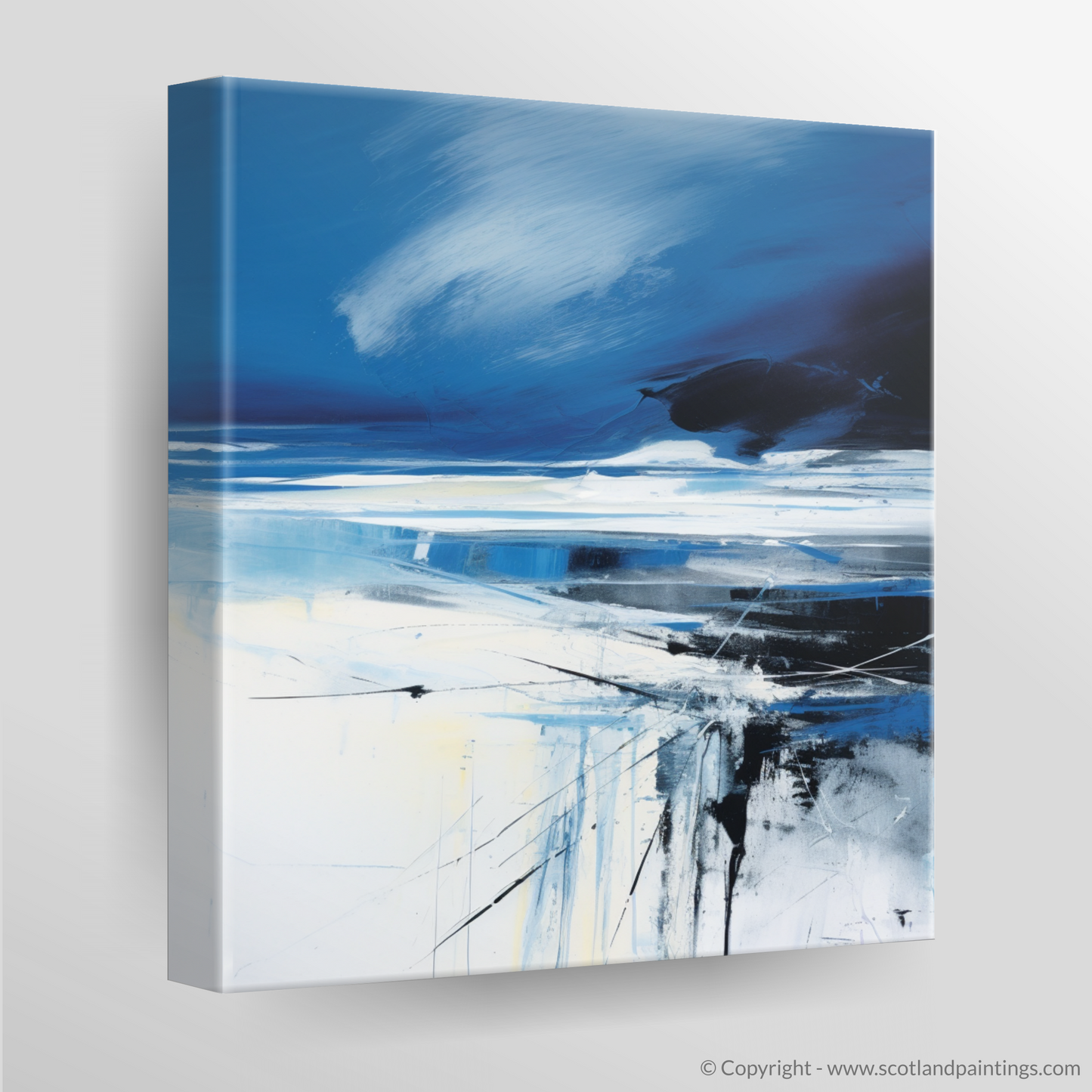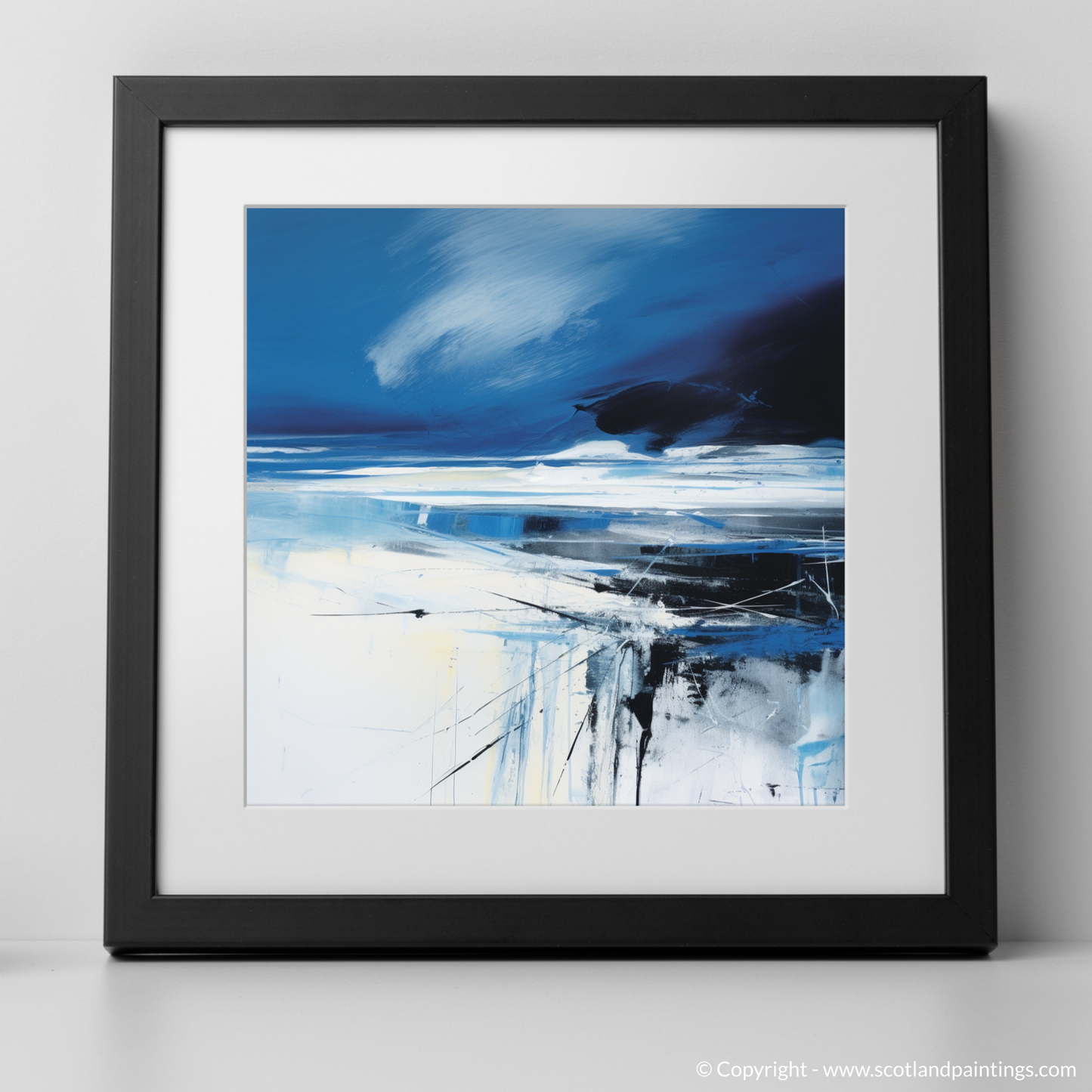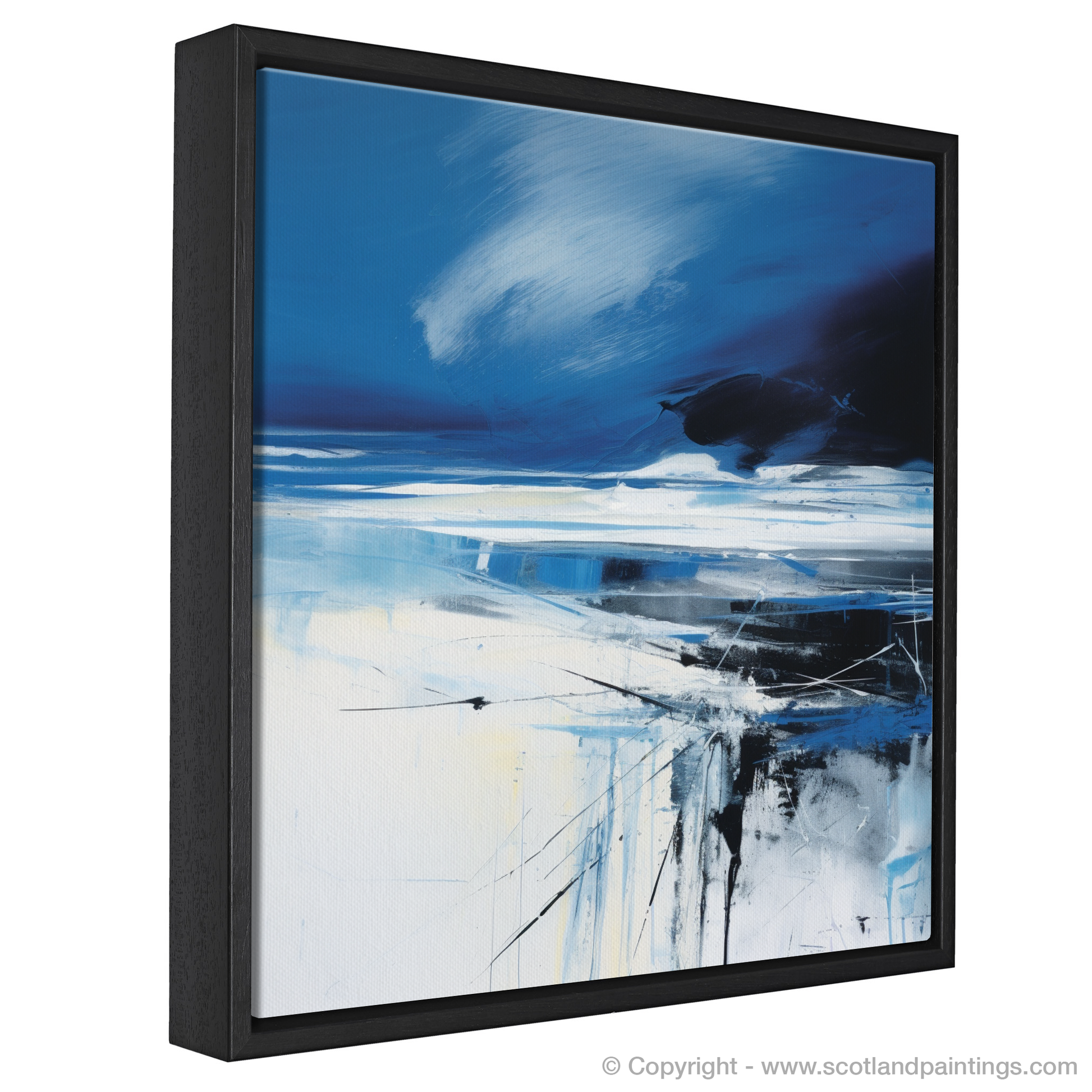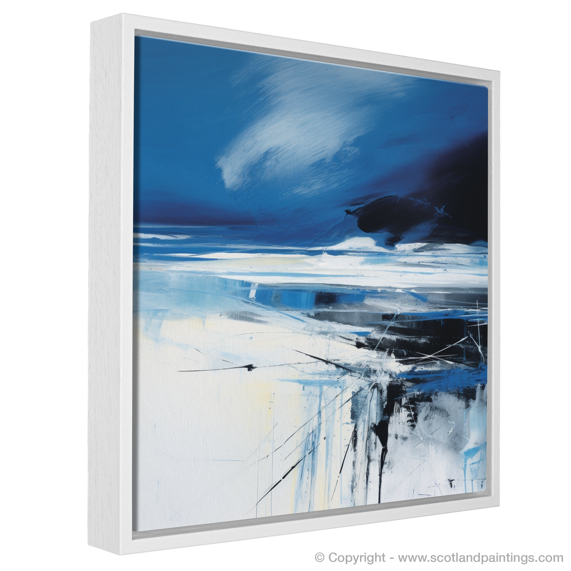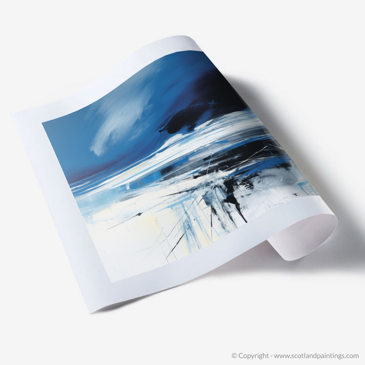 Capture the essence of Scotland's rugged coastal beauty with this evocative abstract interpretation of Camusdarach Beach. Bold, sweeping strokes of deep blue and white conjure a vision of tempestuous skies rolling over the shoreline, while the horizon is etched with the faintest hint of tumultuous weather ahead. This piece masterfully evokes the stark contrasts inherent in Scotland's natural landscape, with the moody blues and black embodying the storm's might against the serene light blues and whites, representing the calm before the storm.