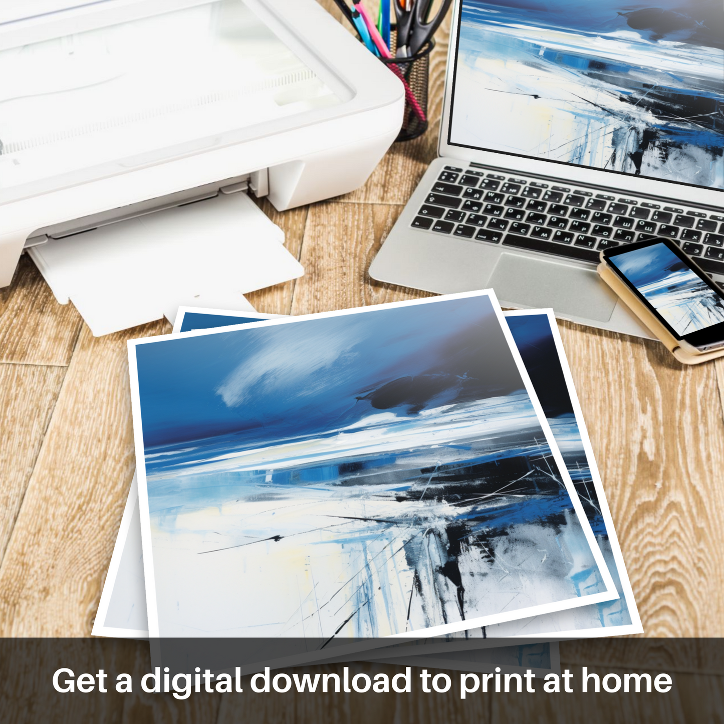 The artwork encapsulates the untamed spirit of Scottish Beaches, mirroring the dynamic dance between land, sea, and sky that characterises the country's beautiful, windswept coastlines. Its abstract nature invites the viewer to delve into their imagination, to hear the roar of the waves and feel the bluster of the wind against their skin.