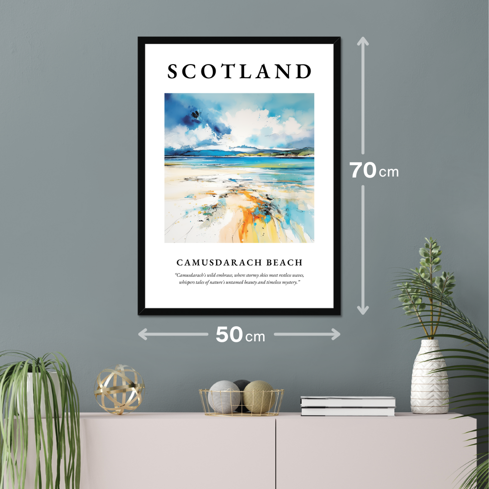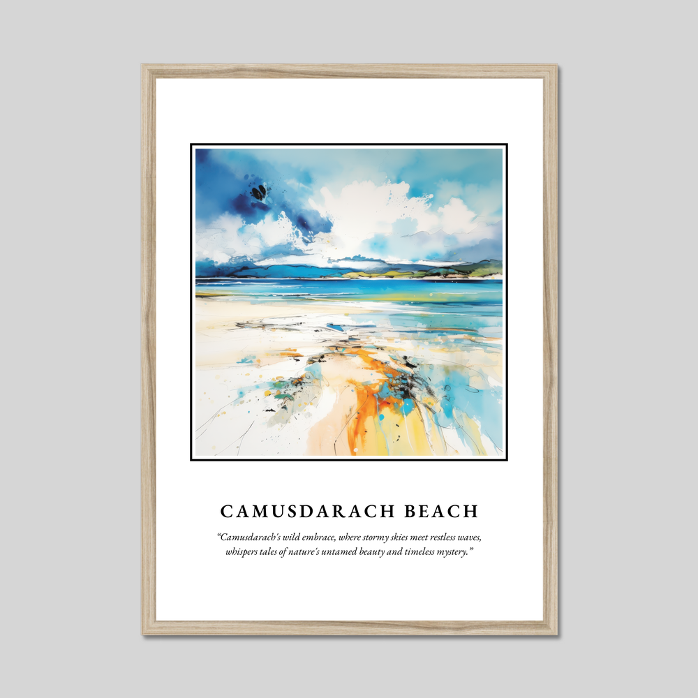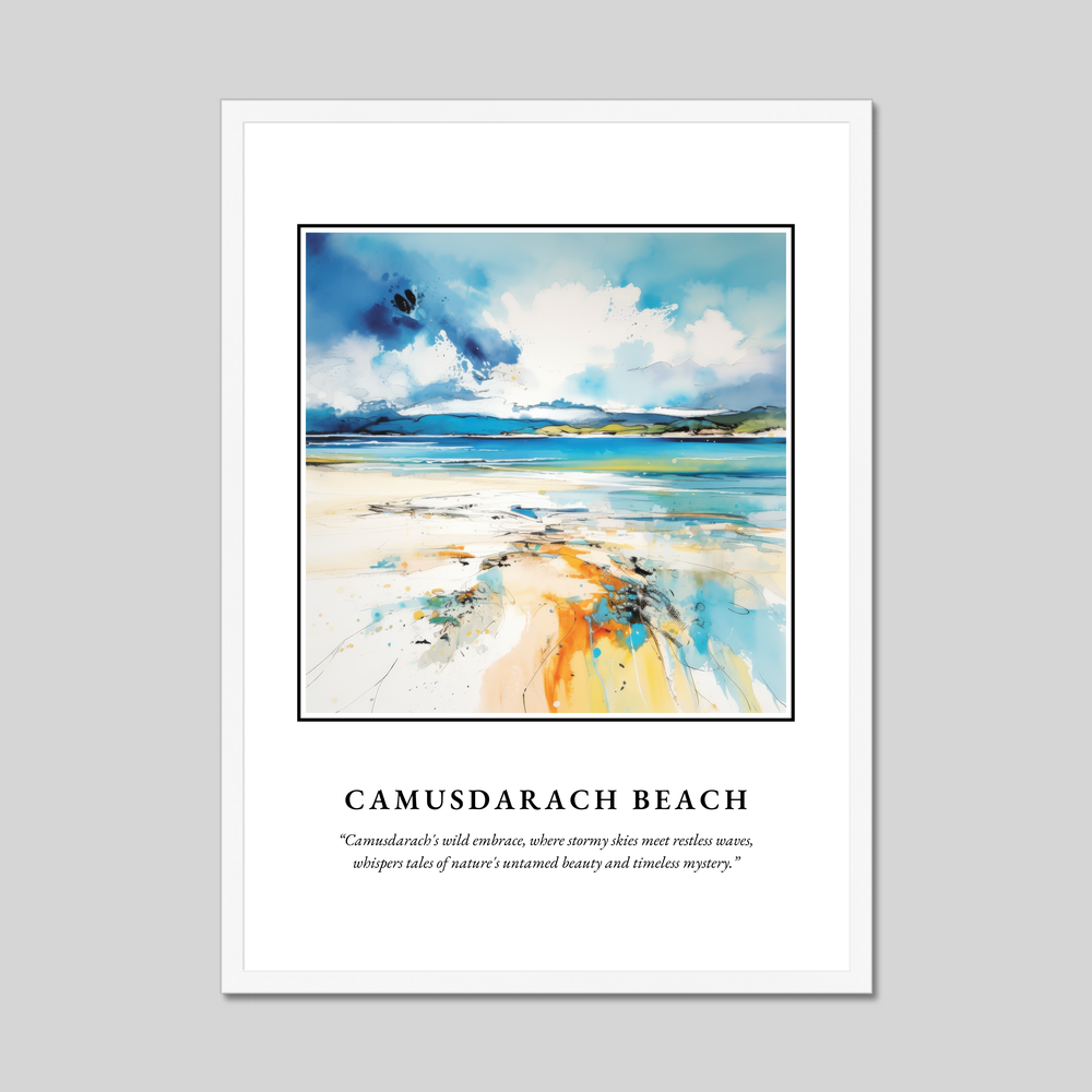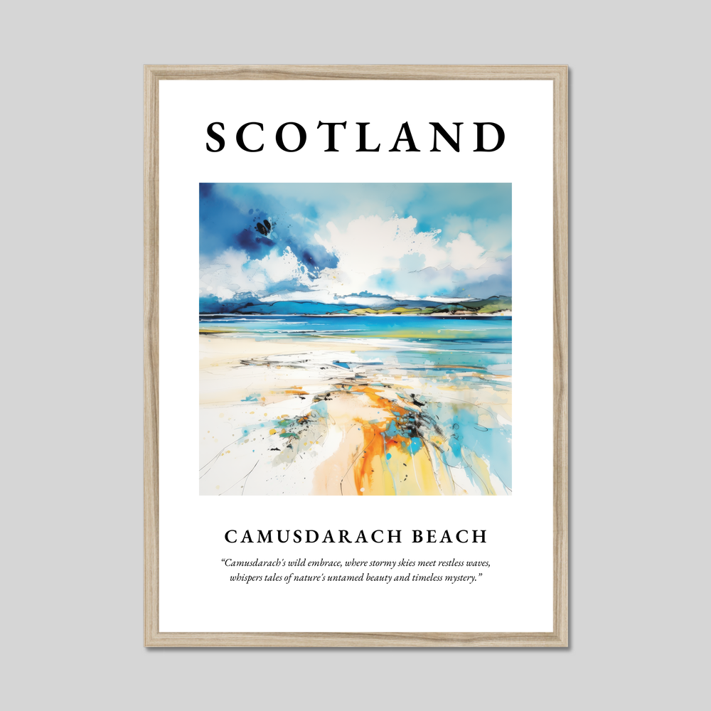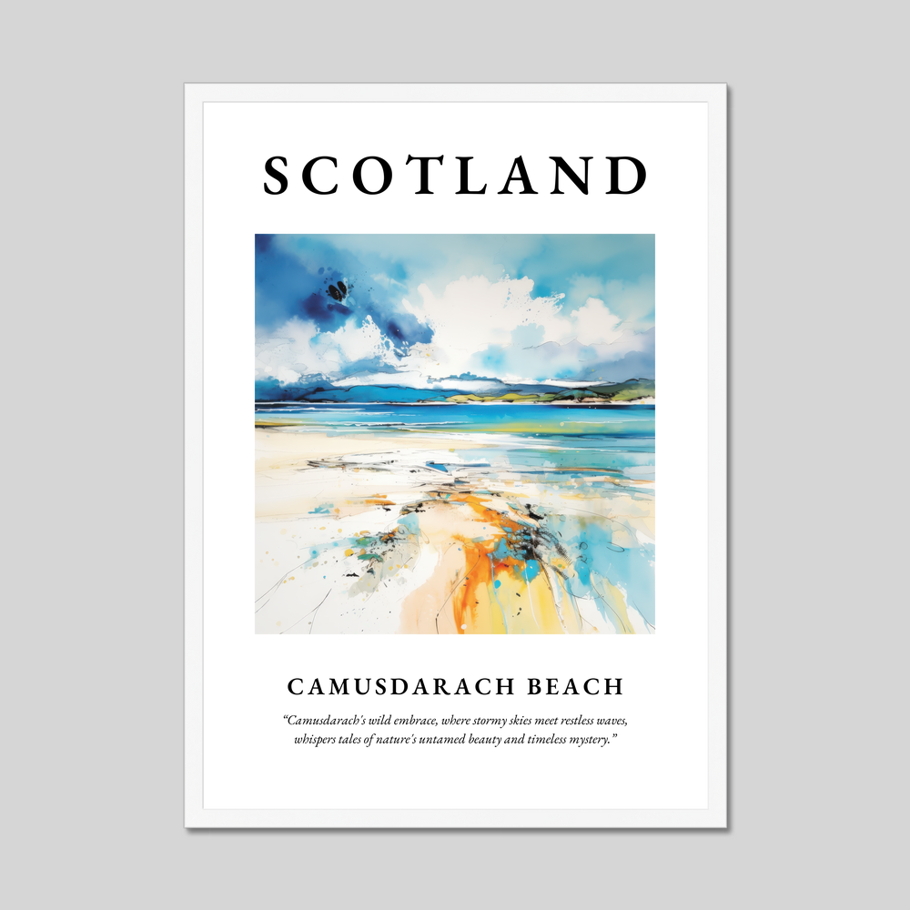 Embrace the raw beauty of Scotland with this captivating 50cm x 70cm framed poster print, a perfect addition to any home or office space. Featuring an abstract painting of Camusdarach Beach, it captures the windswept allure and mysterious charm of this iconic Scottish location. The poster begins with the word "SCOTLAND" in bold, commanding attention, and underneath, a thought-provoking quote: "Camusdarach's wild embrace, where stormy skies meet restless waves, whispers tales of nature's untamed beauty and timeless mystery."