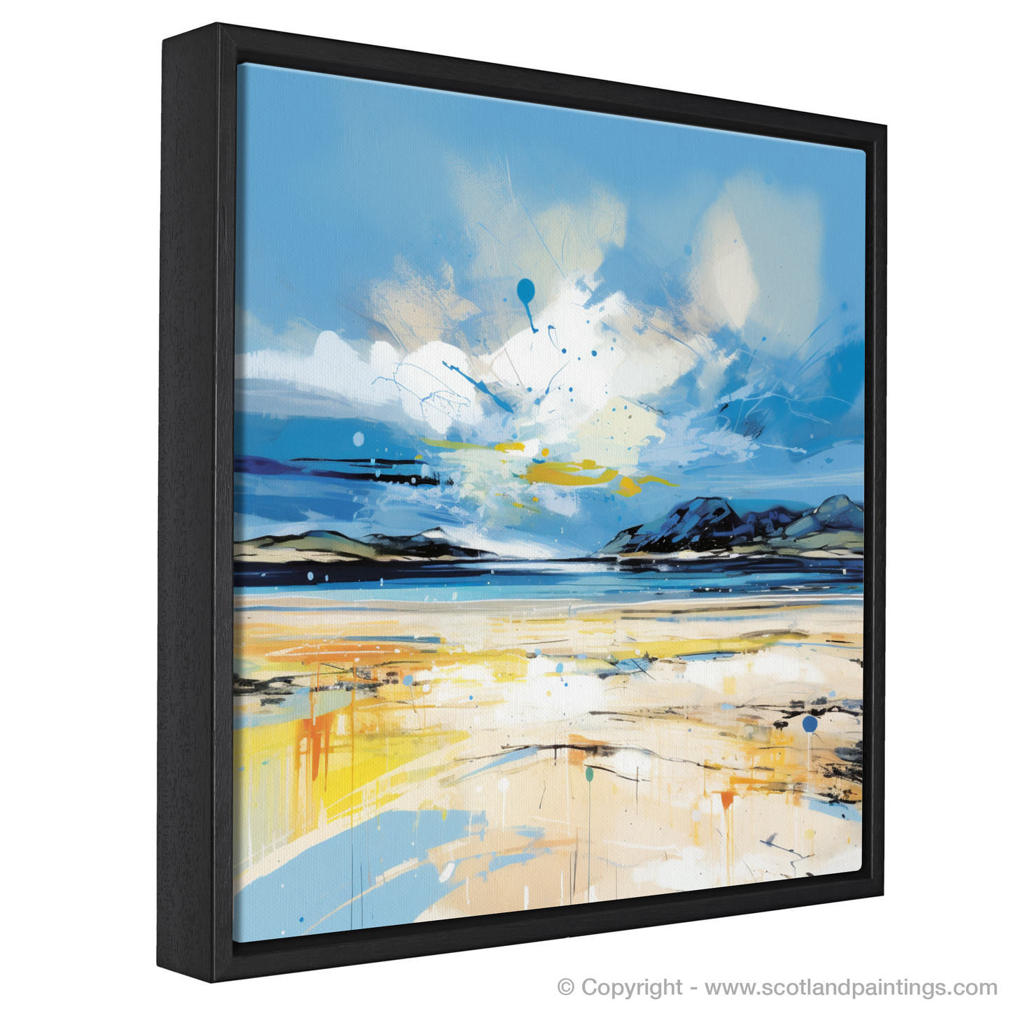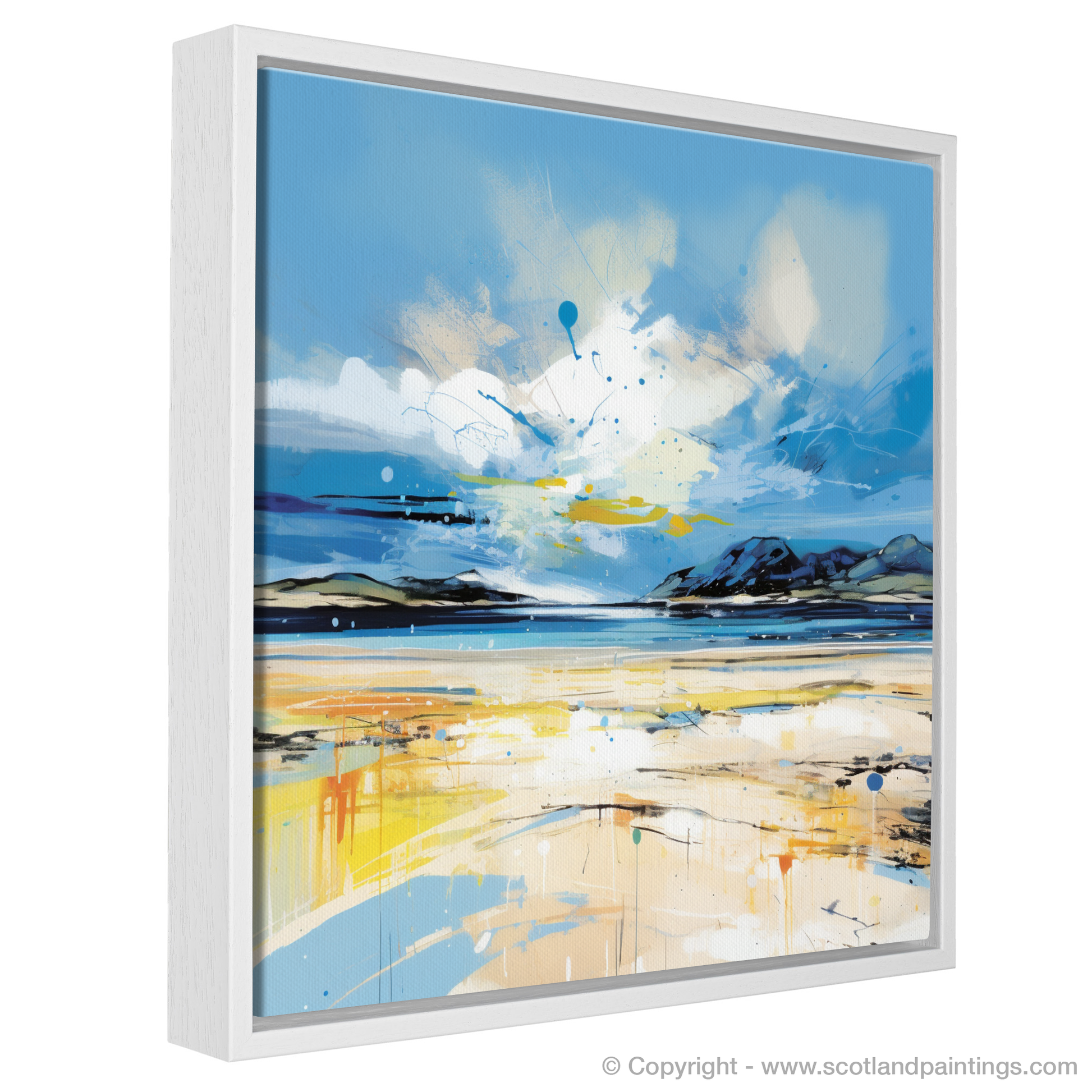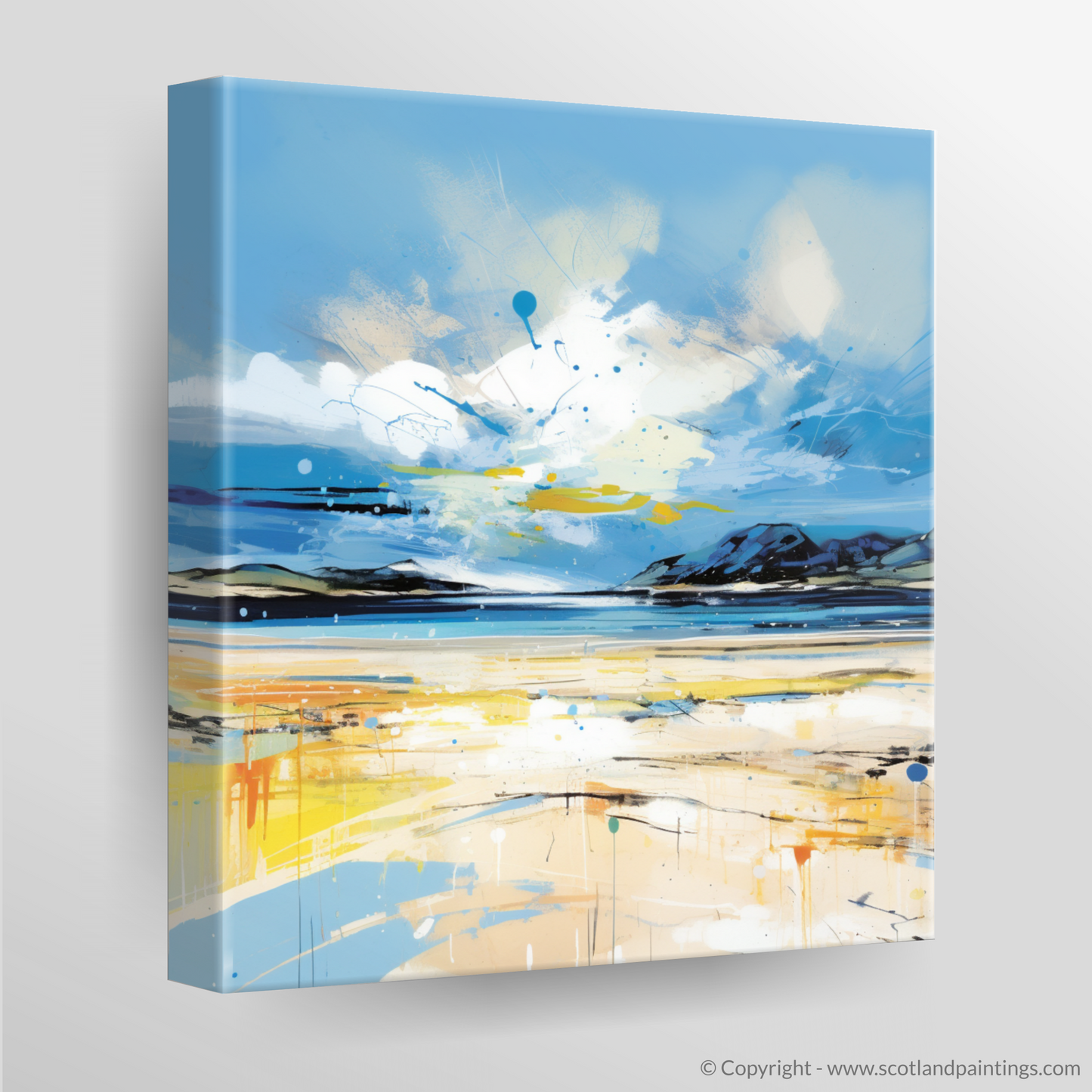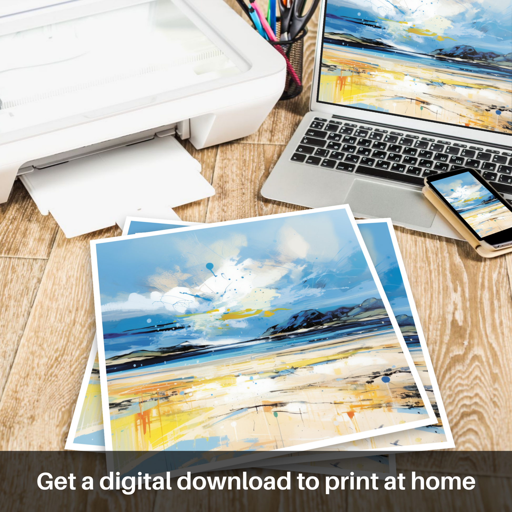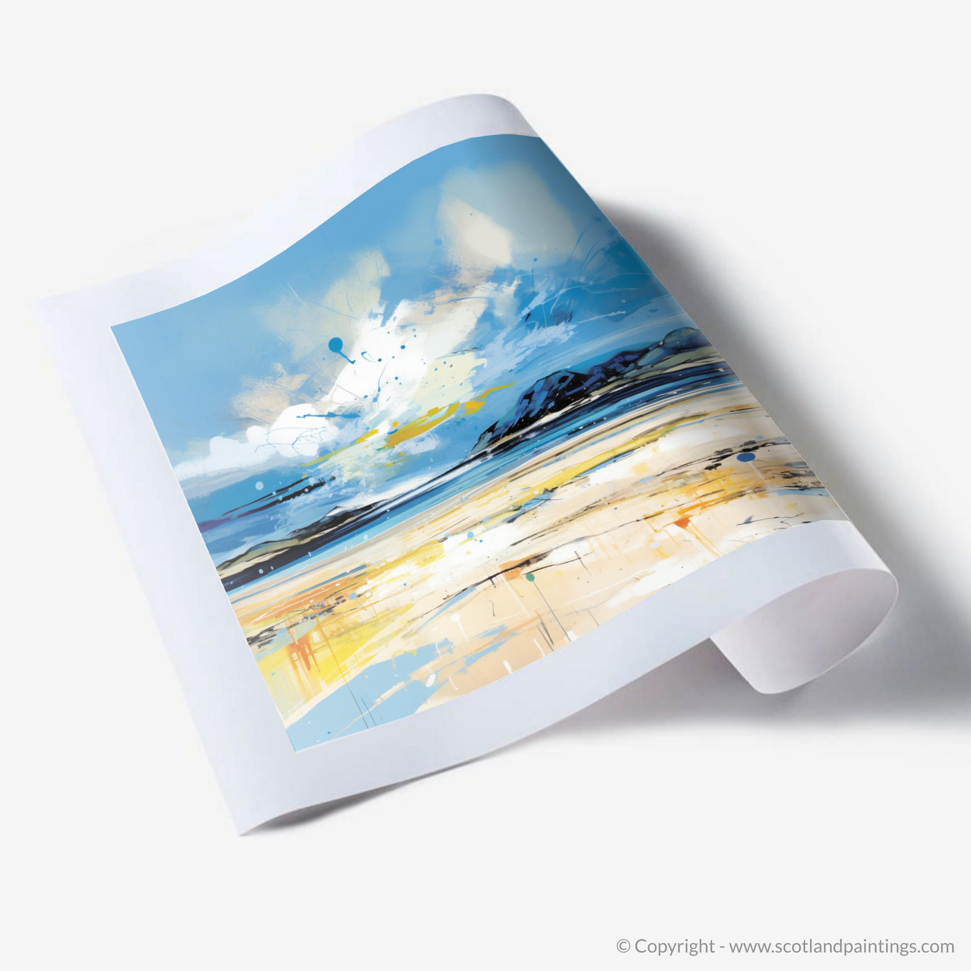 Immerse yourself in the tumultuous beauty of Camusdarach Beach as interpreted by the daring strokes of abstract artistry. This stunning print captures the extraordinary beauty of the Scottish coast through an explosion of colour and form. Bold azure blues blend with the glowering grays and stark whites of a stormy sky, while the sun peeks through in bright, hopeful yellows, suggesting a break in the weather.