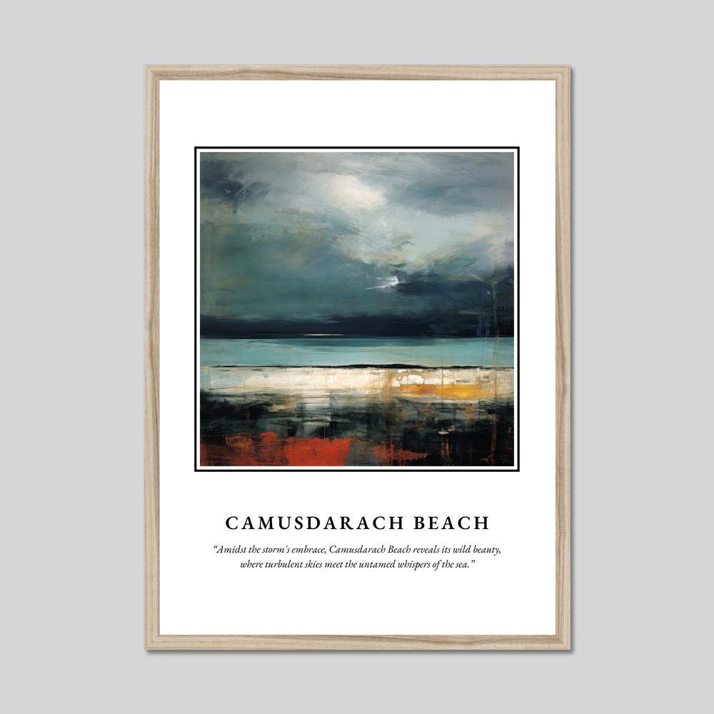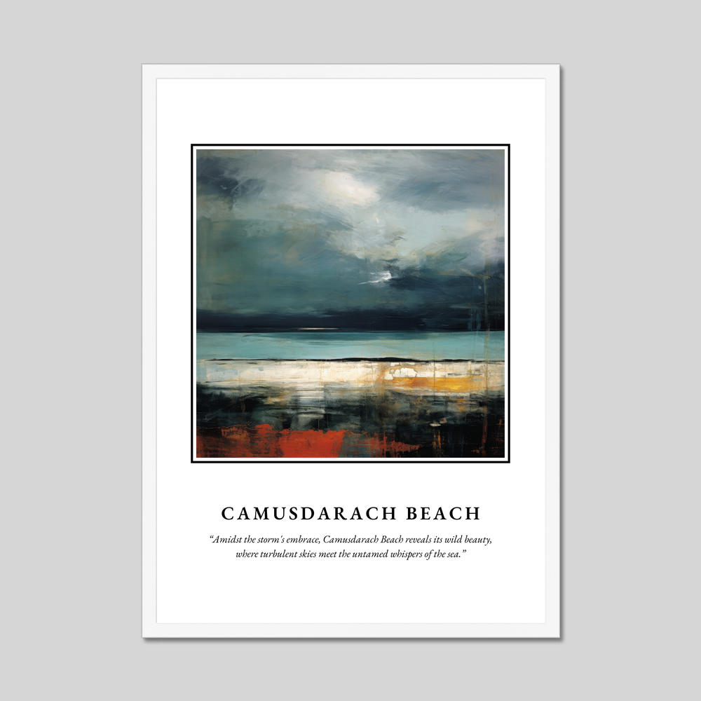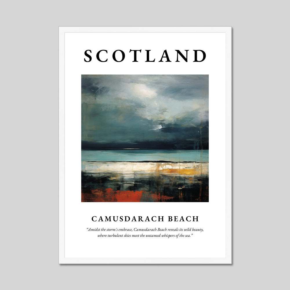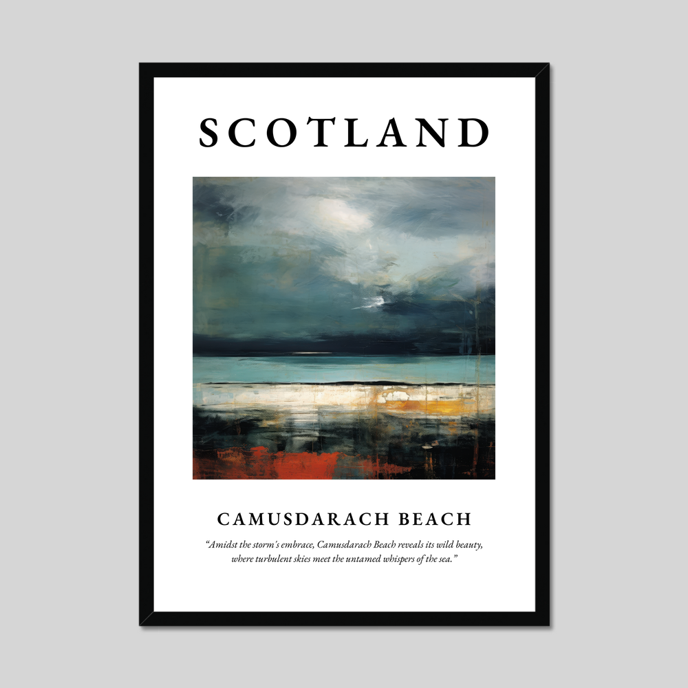 Choose from a selection of elegant frames: classic black for a modern touch, serene white for simplicity, or a natural wood-effect to echo the rustic charm of Scotland's landscapes. Beneath the painting, a poetic quote evokes the scene: “Amidst the storm's embrace, Camusdarach Beach reveals its wild beauty, where turbulent skies meet the untamed whispers of the sea.”