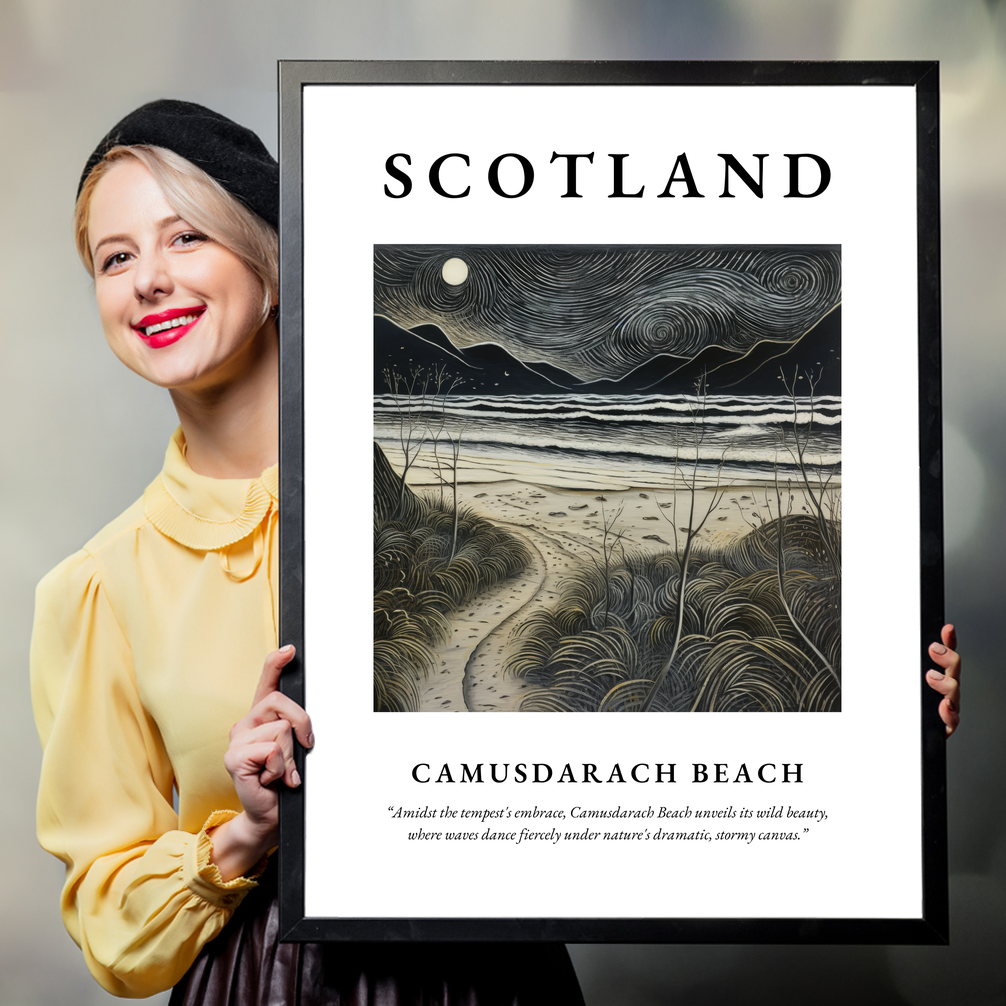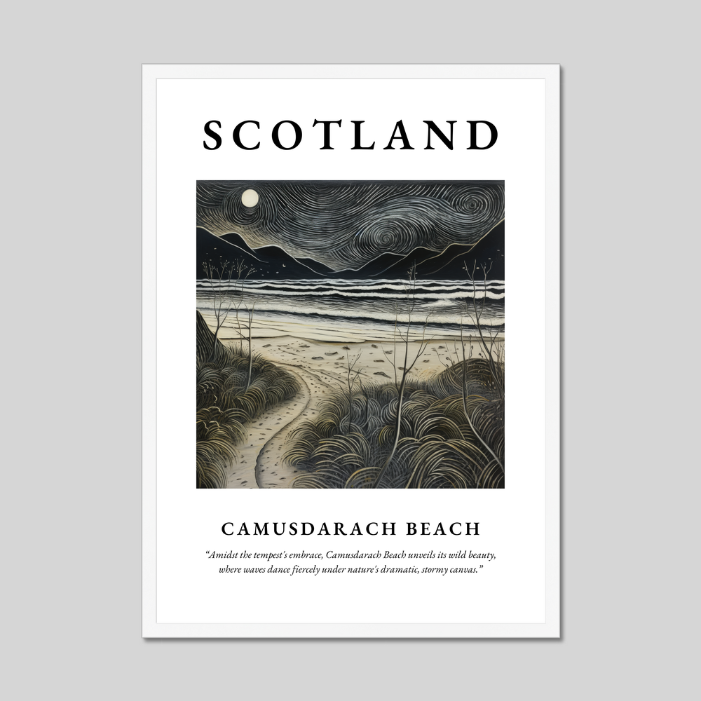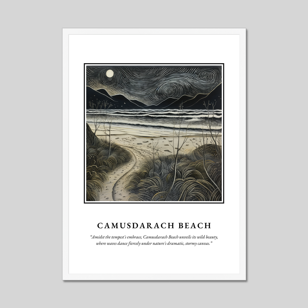 At the heart of this poster is an abstract expressionist portrayal of Camusdarach Beach. Swirling brushstrokes depict a dramatic, stormy landscape where waves clash and dance with fierce determination. The interplay of light and shadow invites the viewer to immerse themselves in the wild beauty of Scotland’s coastal treasures. Beneath this evocative painting, the poetic quote captures the essence of the scene: “Amidst the tempest's embrace, Camusdarach Beach unveils its wild beauty, where waves dance fiercely under nature's dramatic, stormy canvas.”