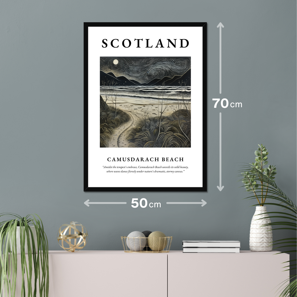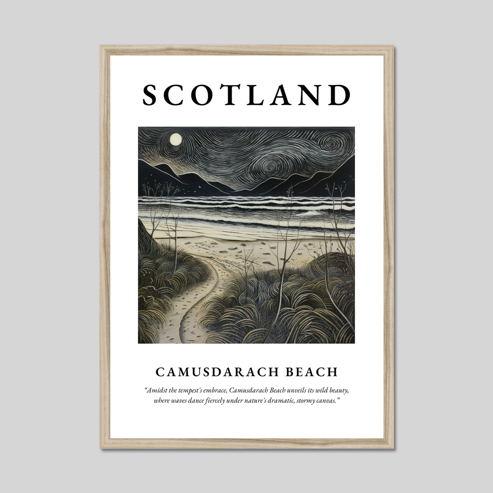 Bring home a piece of Scotland’s majestic wilderness with this framed poster. It serves as both a window to the captivating Camusdarach Beach and a bold statement about nature’s untamed beauty, perfect for any art lover or admirer of Scotland’s scenic wonders.