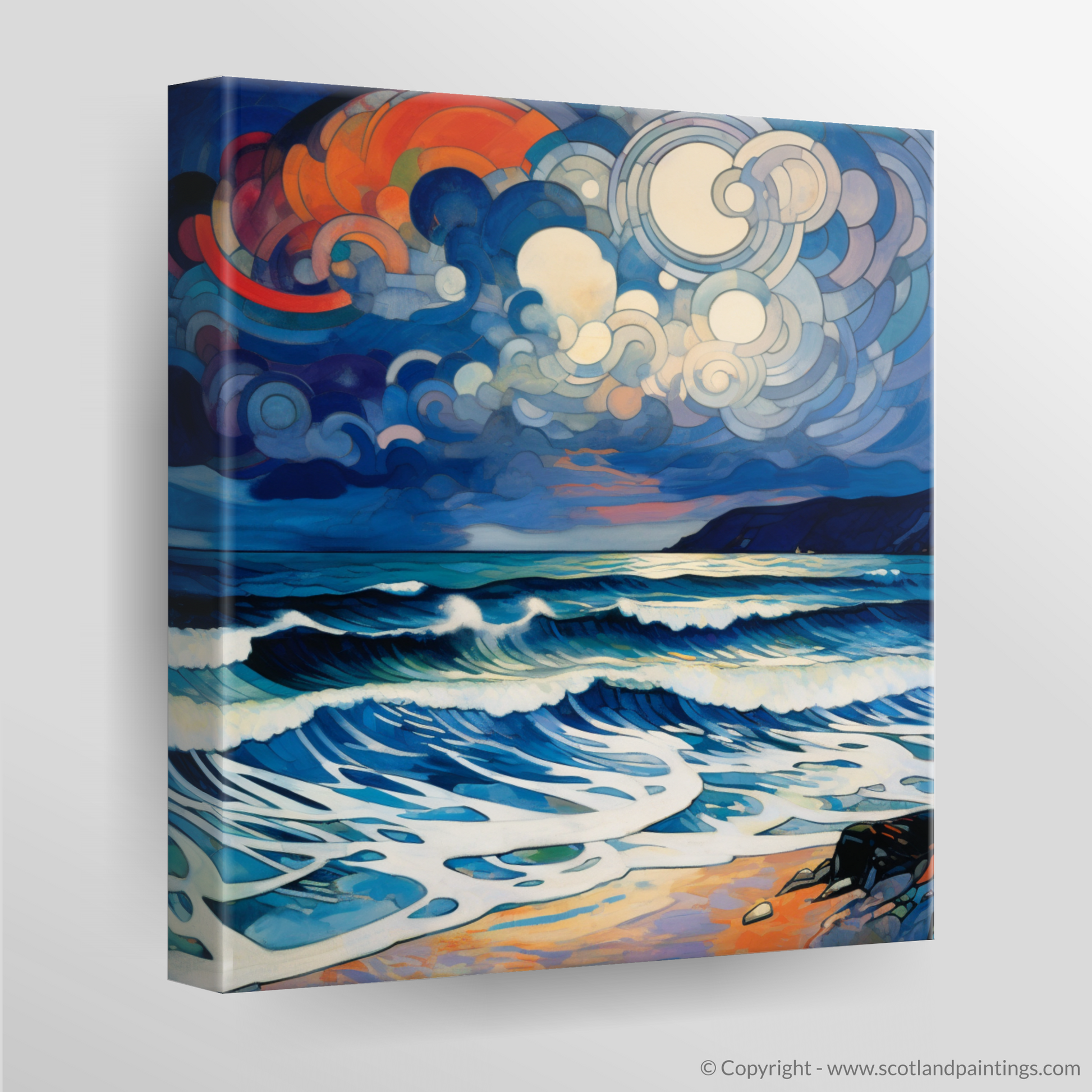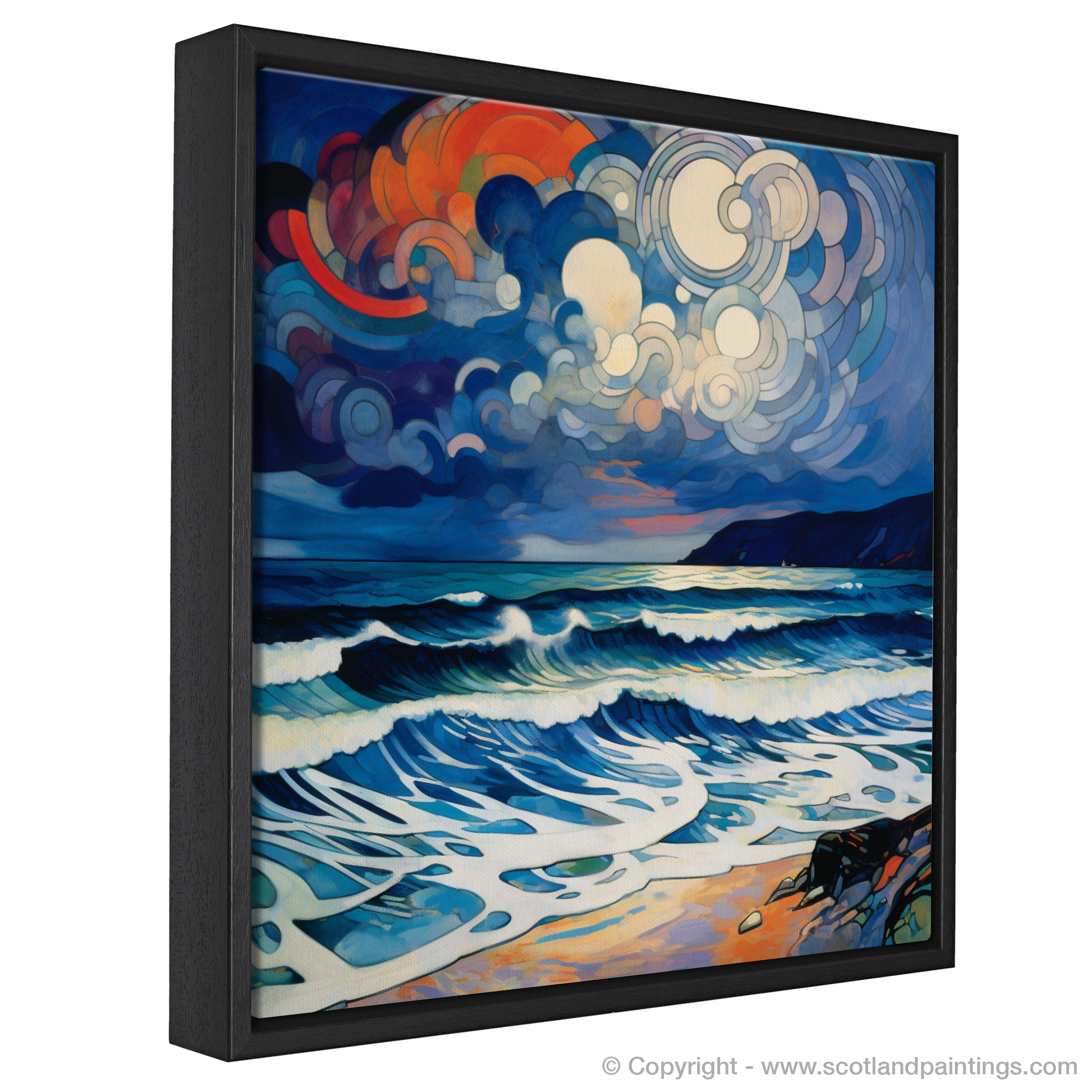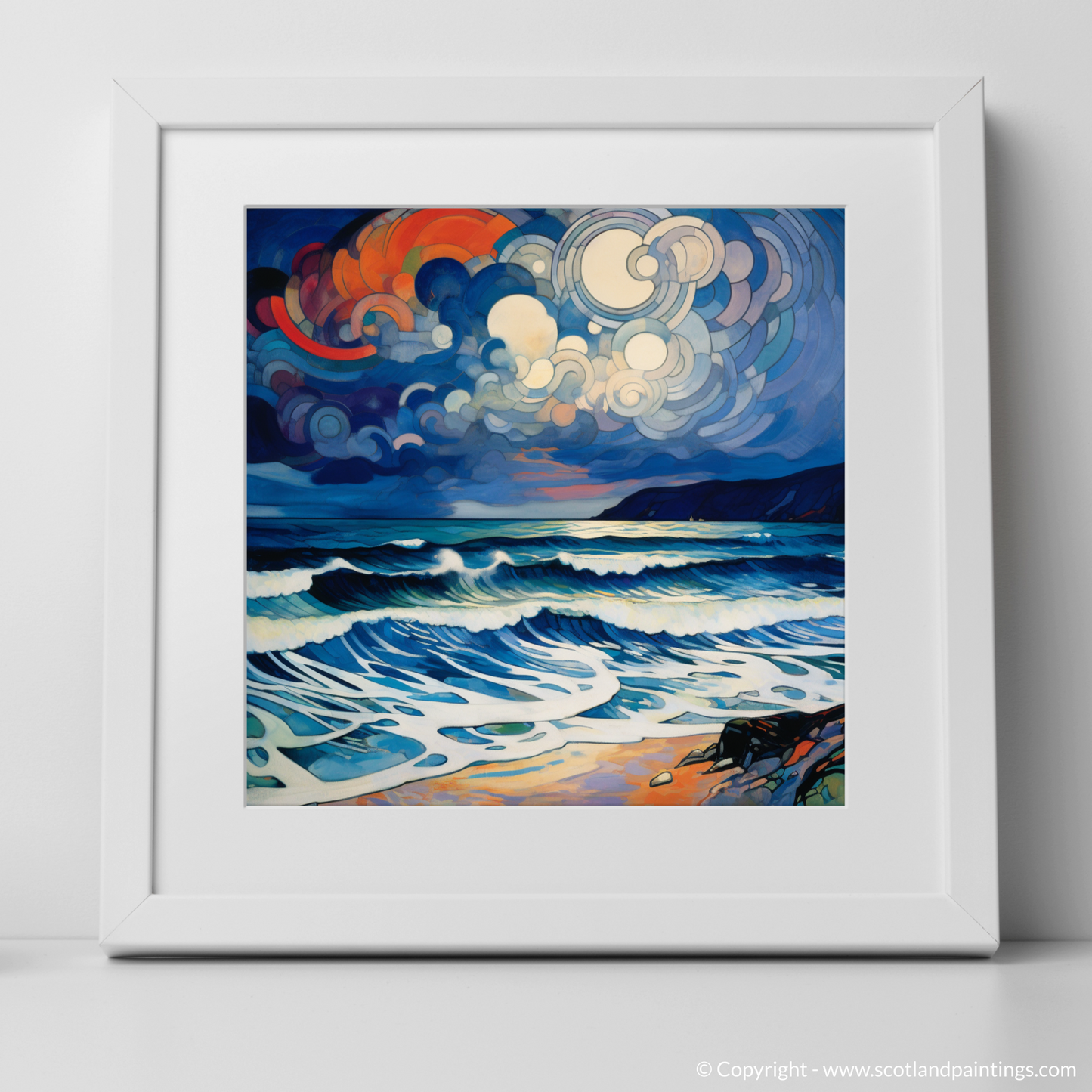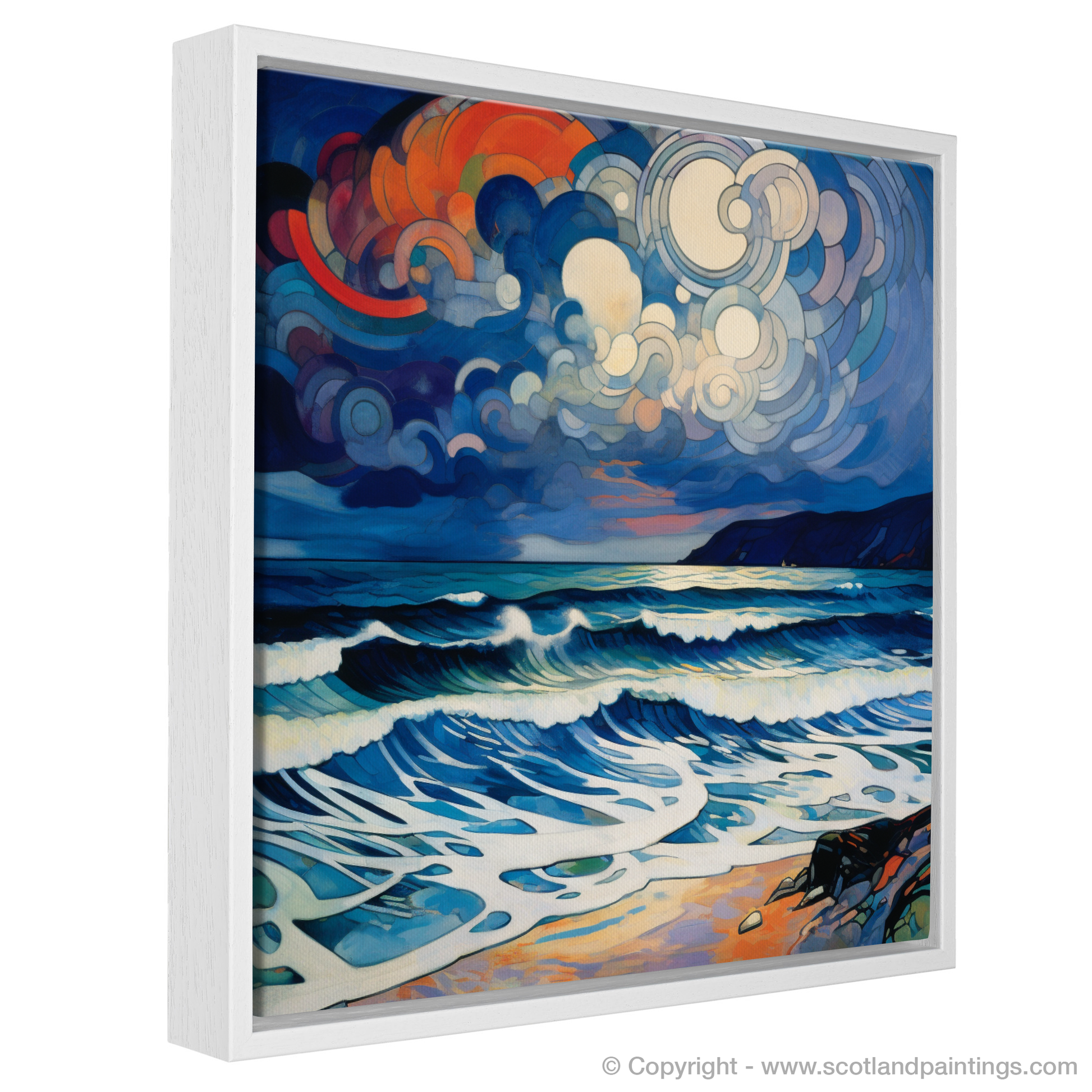 Immerse yourself in the tempestuous beauty of Scotland's seascapes with this captivating abstract print, inspired by the storied shores of Camusdarach Beach. A visual symphony of colour and motion, this piece encapsulates the tumultuous spirit of a storm brooding over one of Scotland's most cherished coastlines.