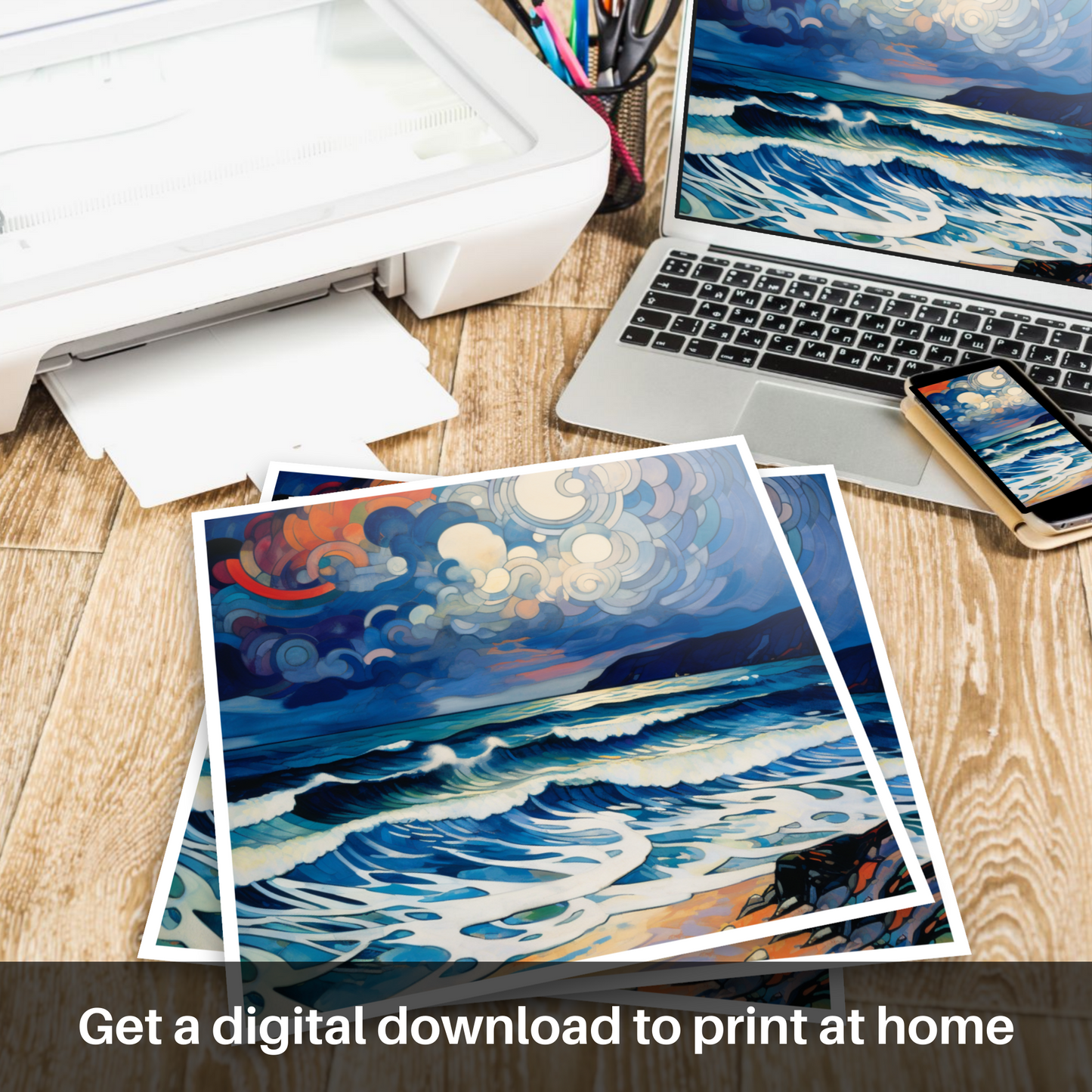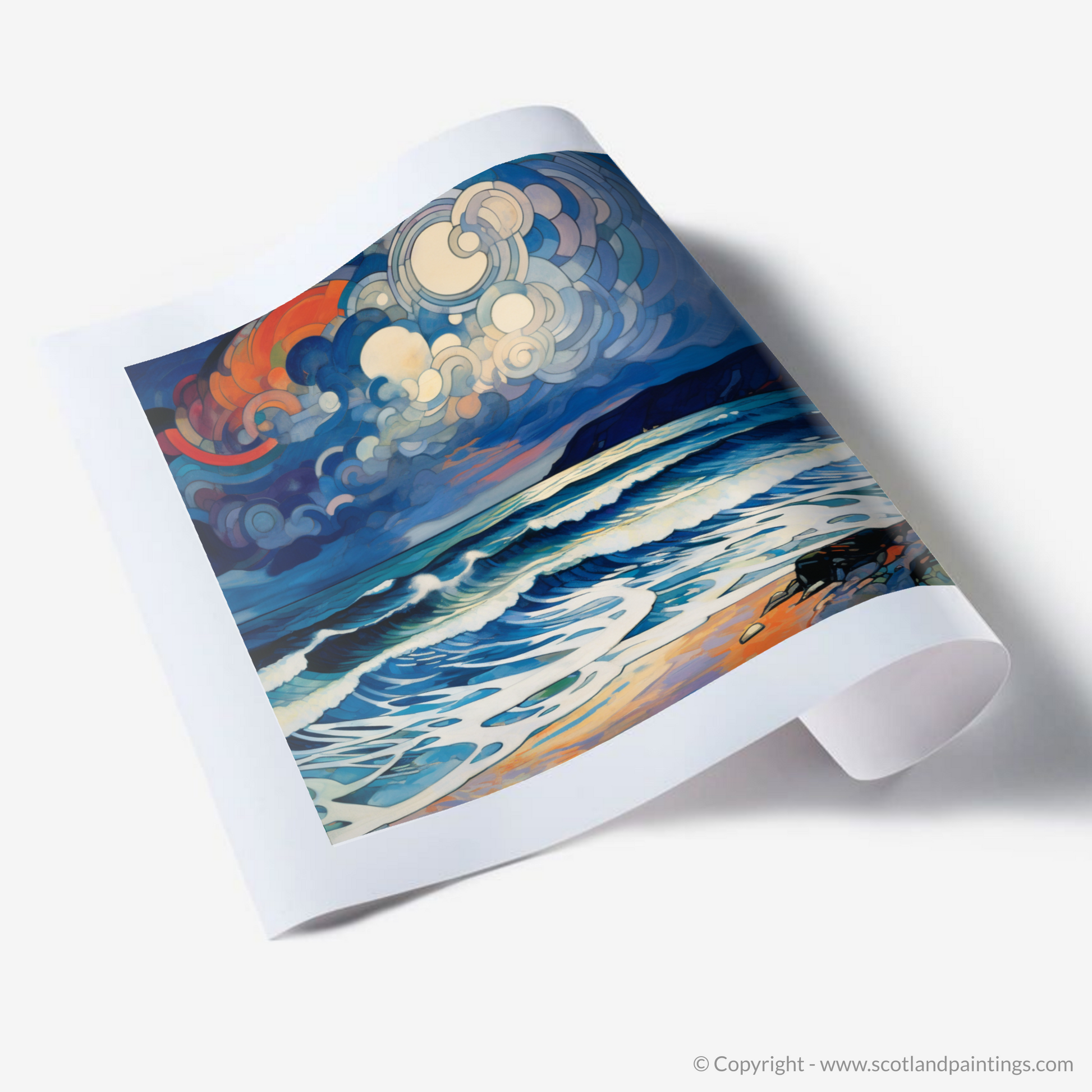 This print of abstract interpretation not only pays homage to the indomitable essence of Camusdarach Beach but also captures the imagination with its vivid palette and the mesmerising interplay of sea and sky. Perfect for aficionados of the abstract and lovers of the Scottish coastline alike, this piece promises to be a stunning focal point in any room, inviting contemplation and conversation about the forces that have sculpted Scotland's natural beauty.