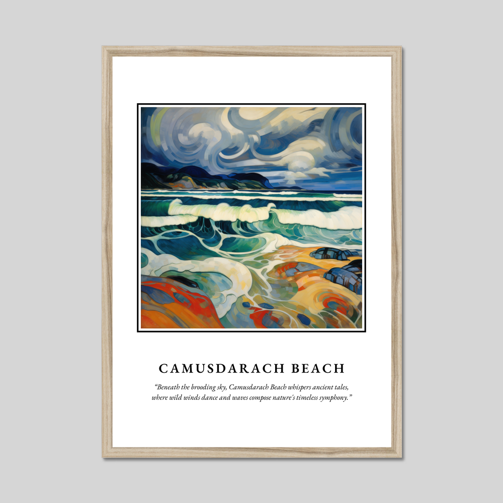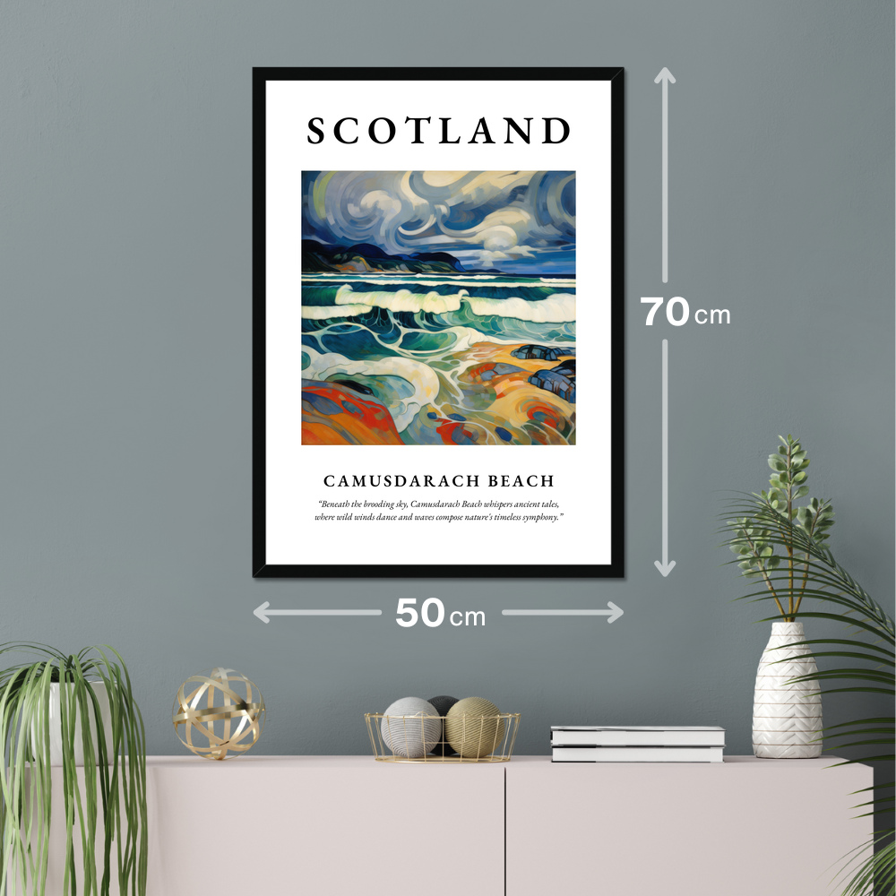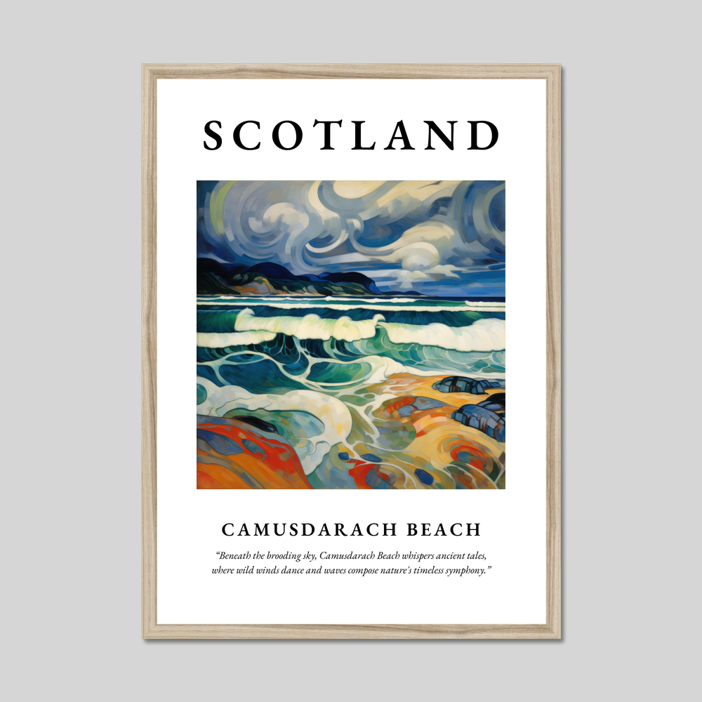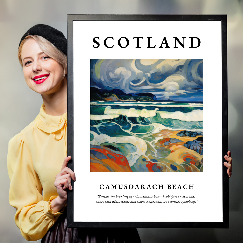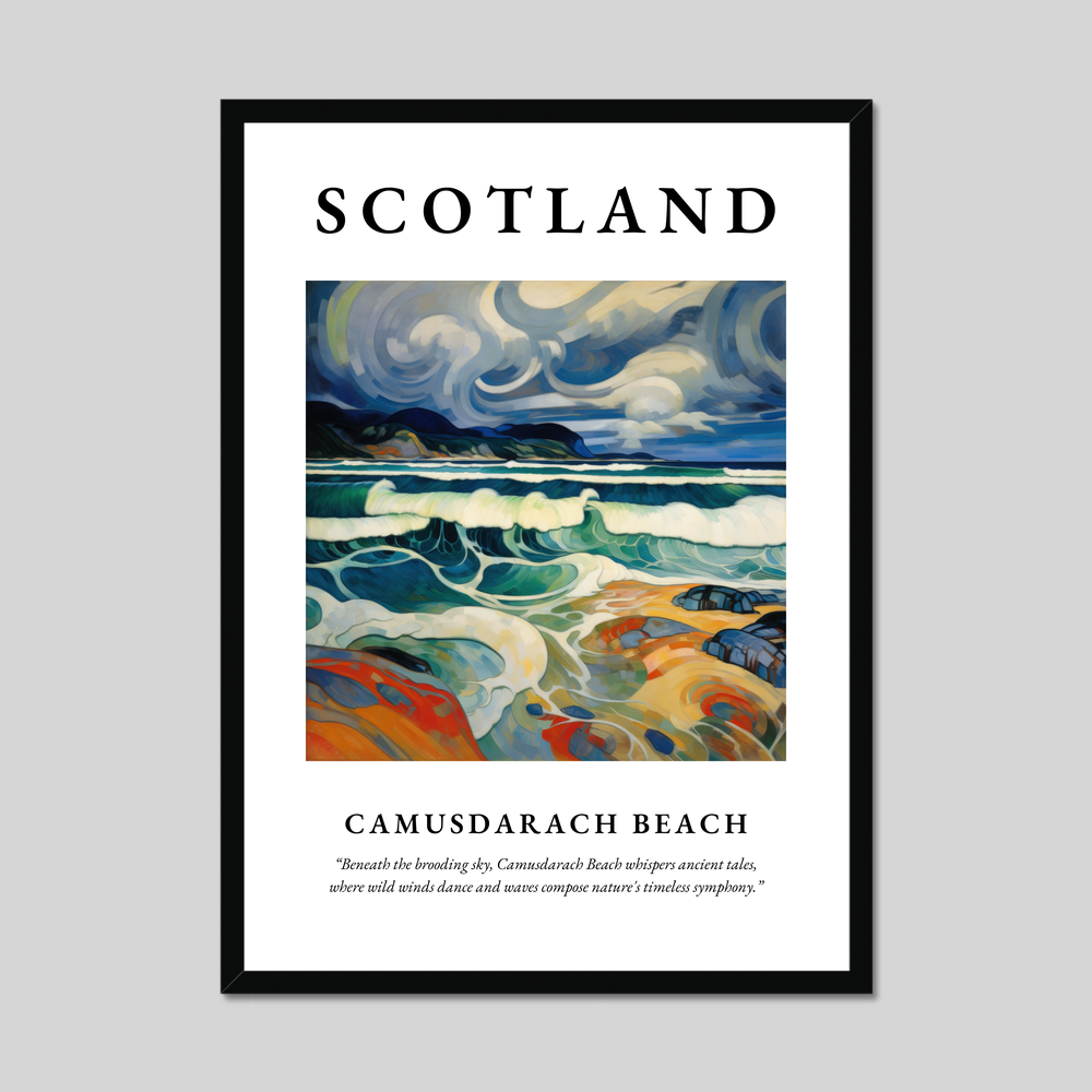 Situated on Scotland's west coast, Camusdarach Beach is renowned for its pristine white sands and crystal-clear waters, making it a beloved destination for both locals and travellers alike. The unique atmosphere of the beach—captured so beautifully in the poster’s artwork—invites visitors to pause and reflect, listening to the stories told by the wind and waves.