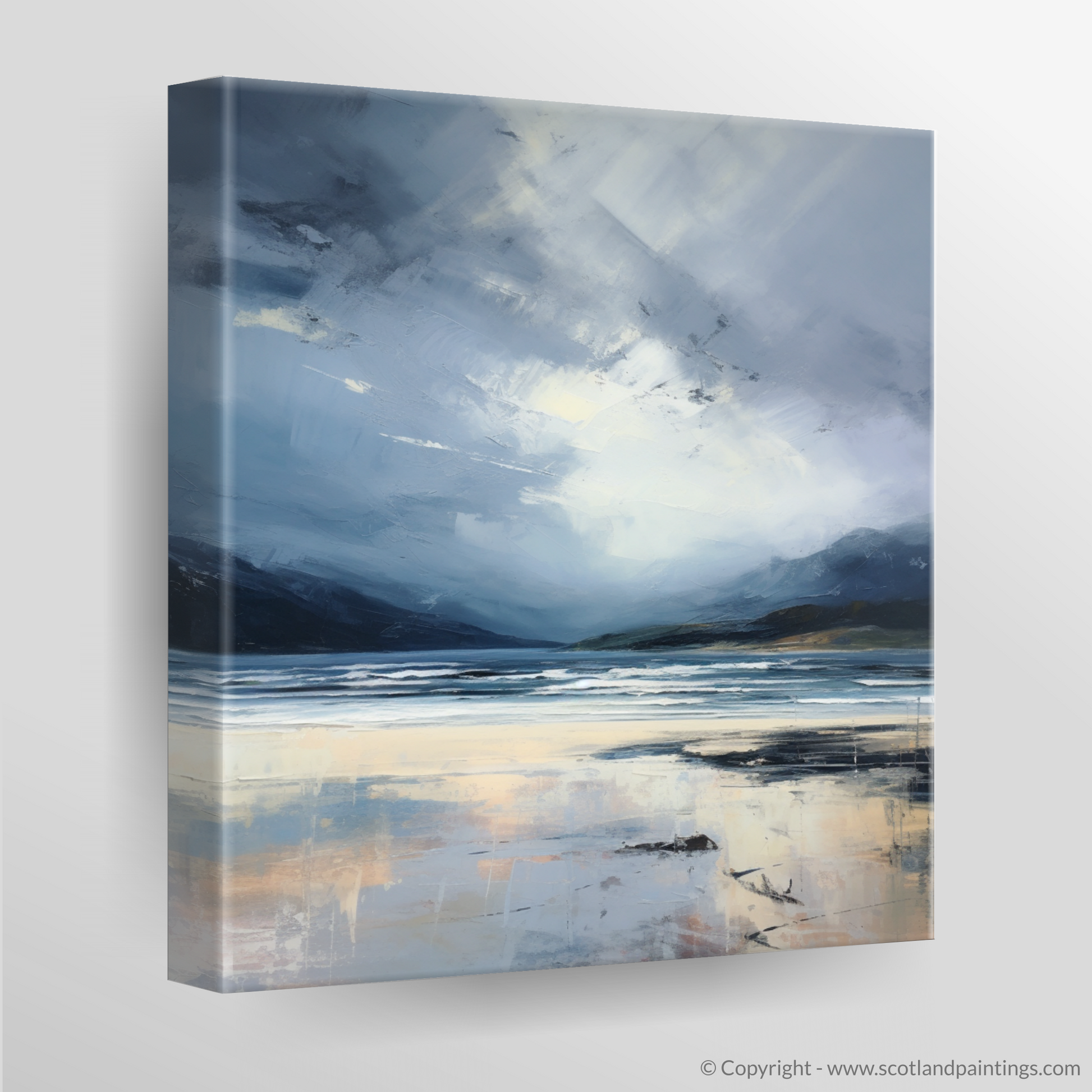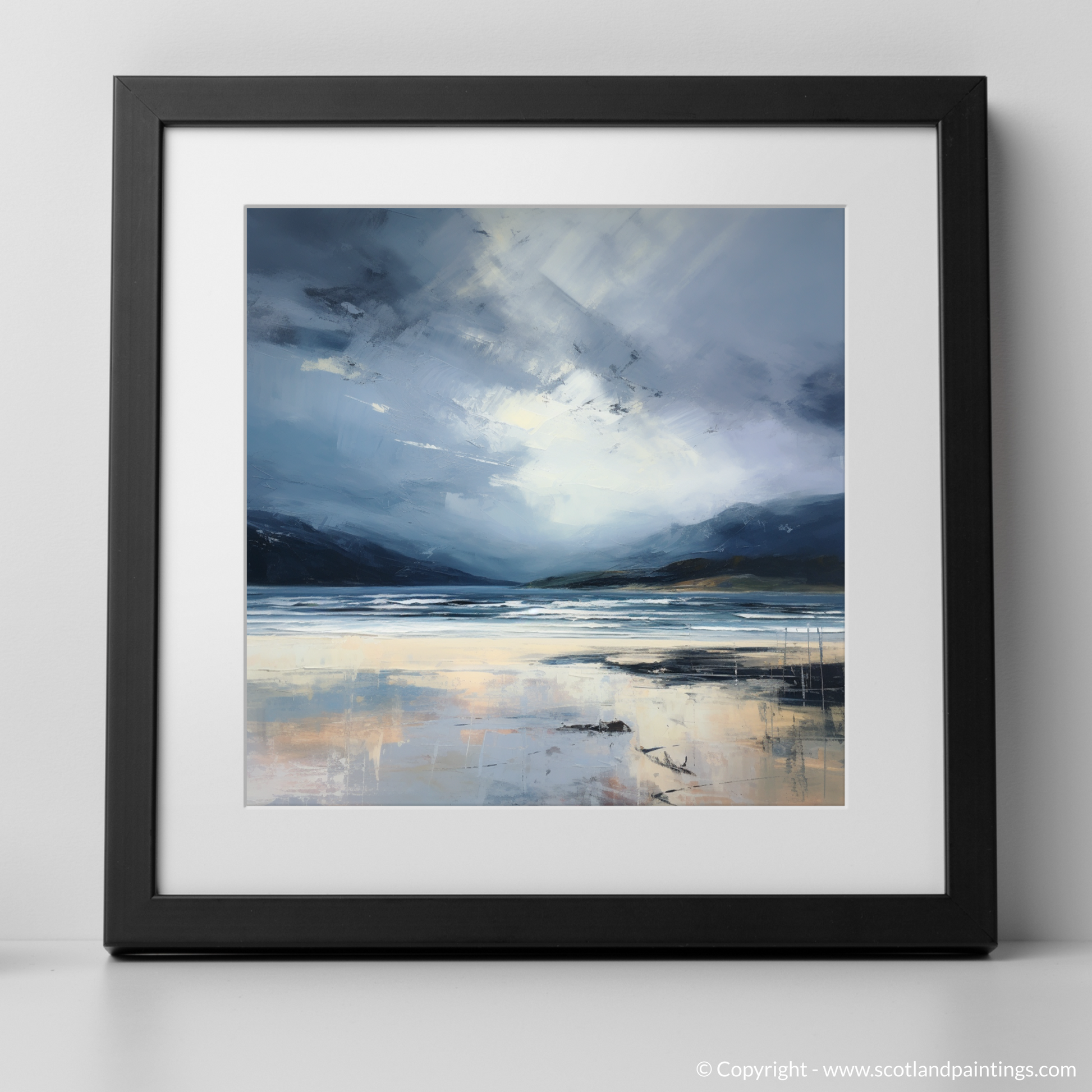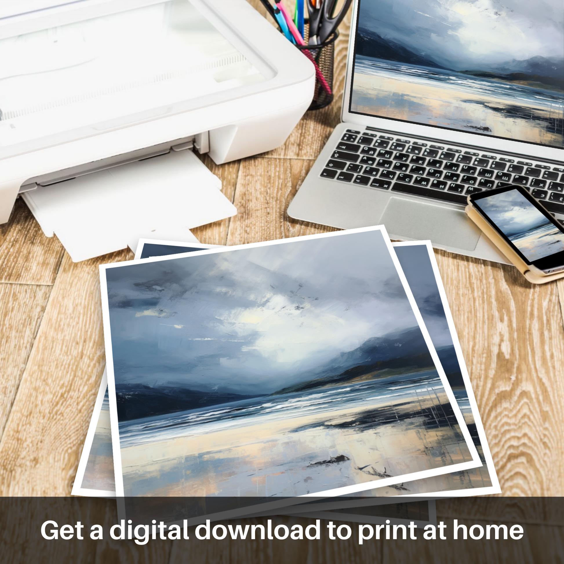 Experience the formidable beauty of Camusdarach Beach reimagined through an abstract lens. This striking print captures the untamed essence of one of Scotland's most scenic shores under a tumultuous sky. Broad, expressive brushstrokes coalesce to form an atmospheric vista where land, sea, and sky converge in a symphony of colour and texture.