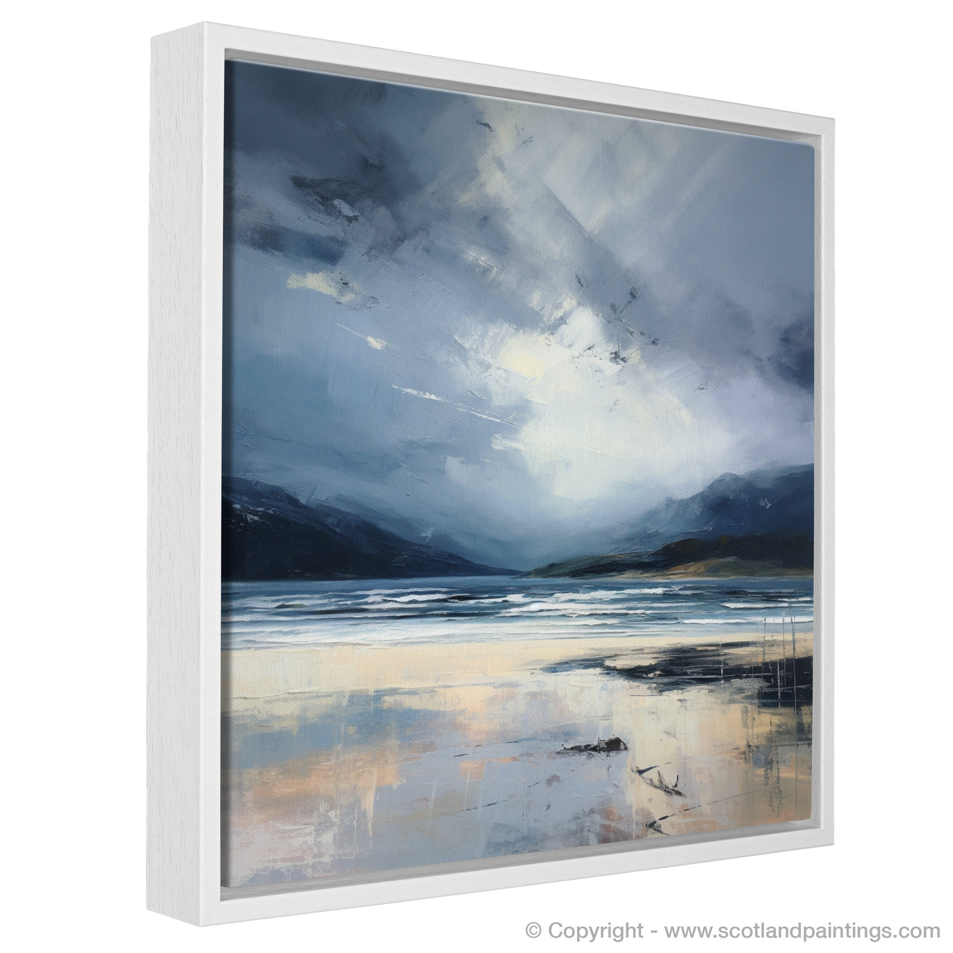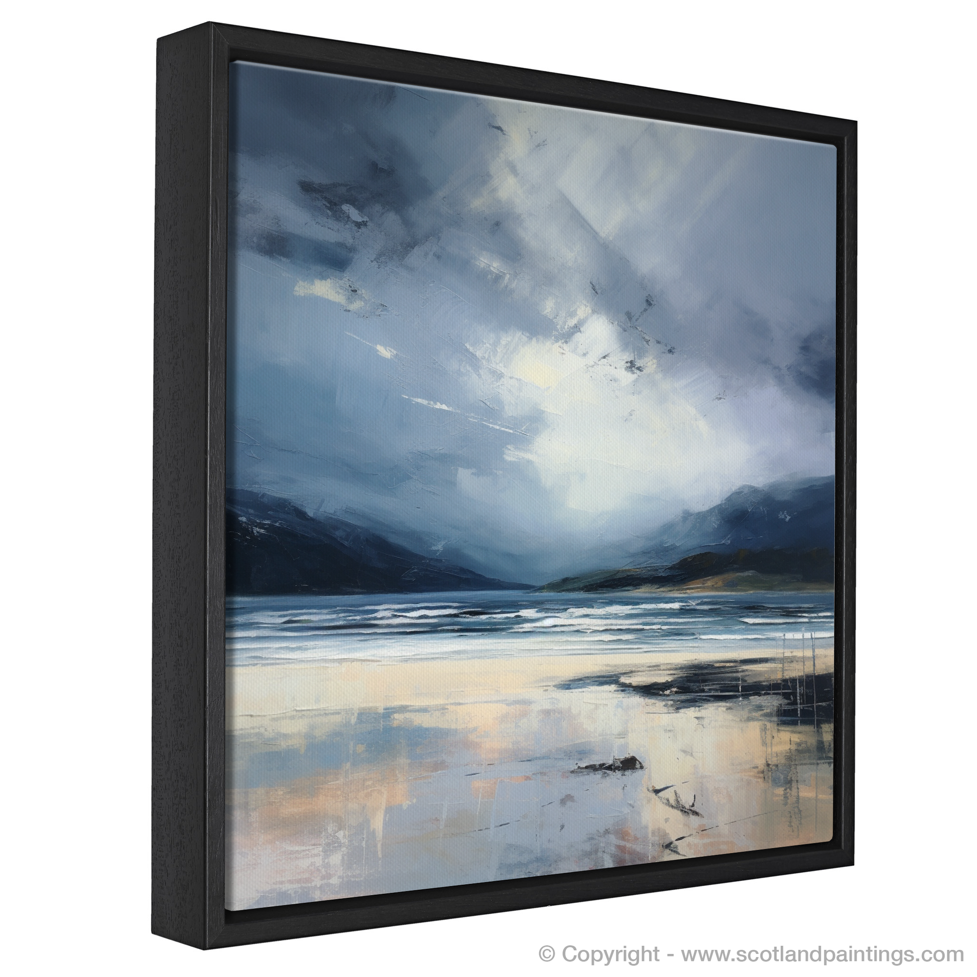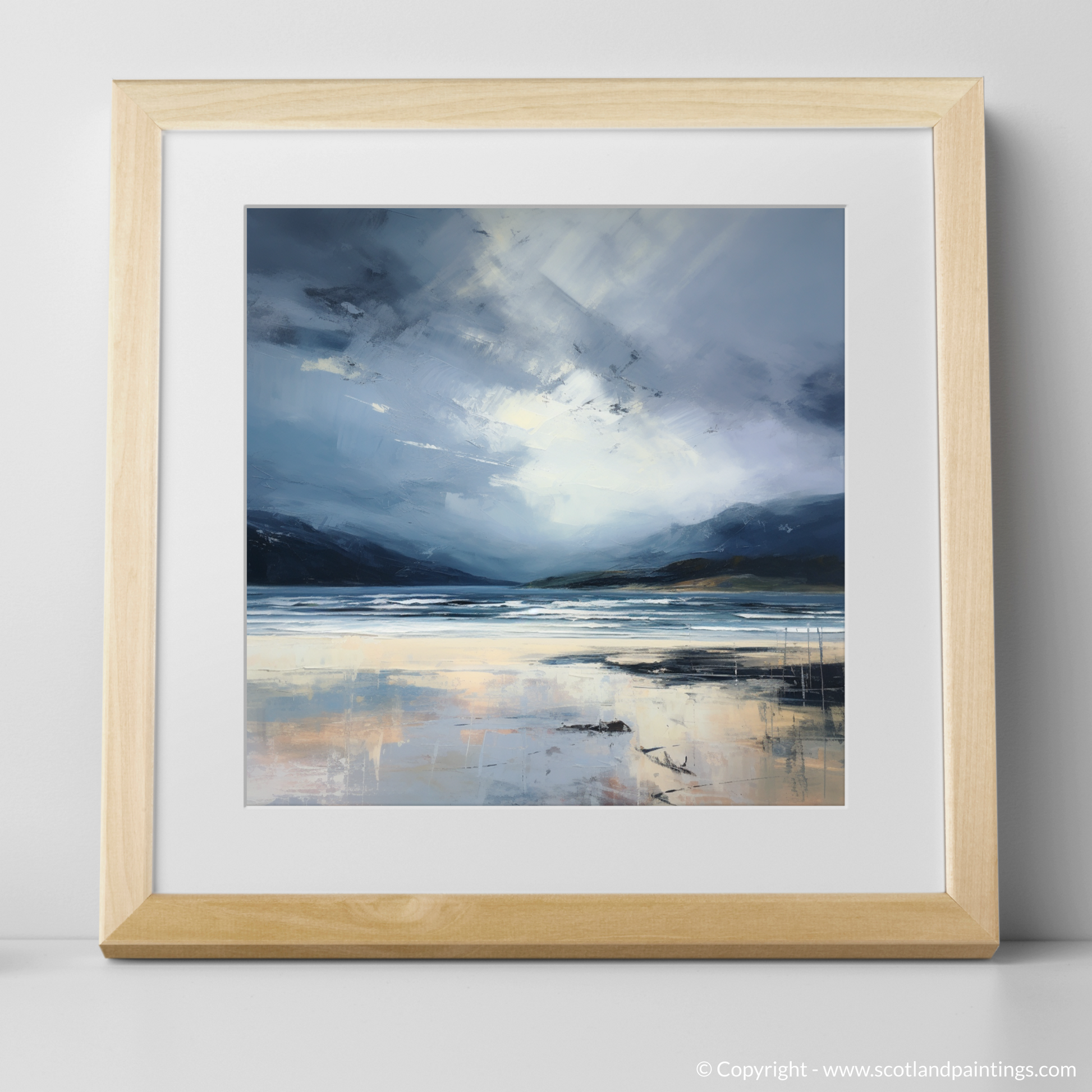 Experience the formidable beauty of Camusdarach Beach reimagined through an abstract lens. This striking print captures the untamed essence of one of Scotland's most scenic shores under a tumultuous sky. Broad, expressive brushstrokes coalesce to form an atmospheric vista where land, sea, and sky converge in a symphony of colour and texture.
