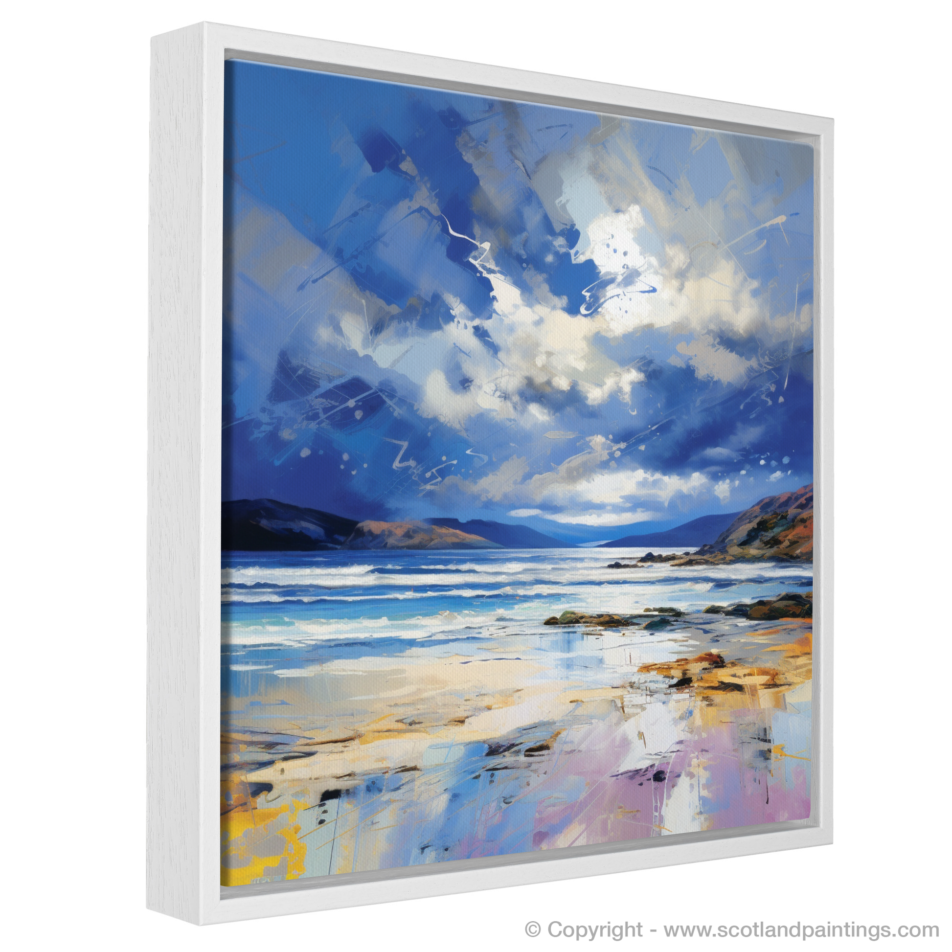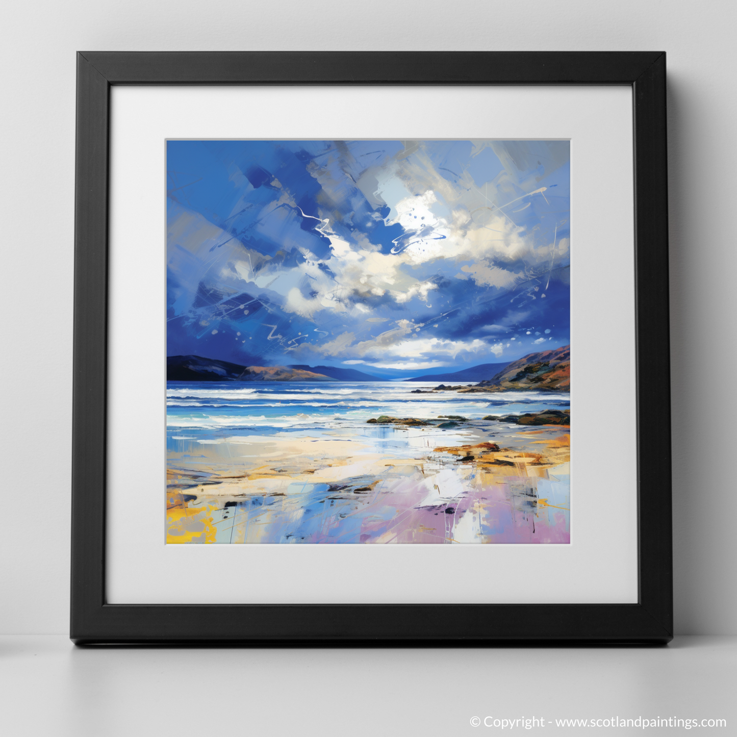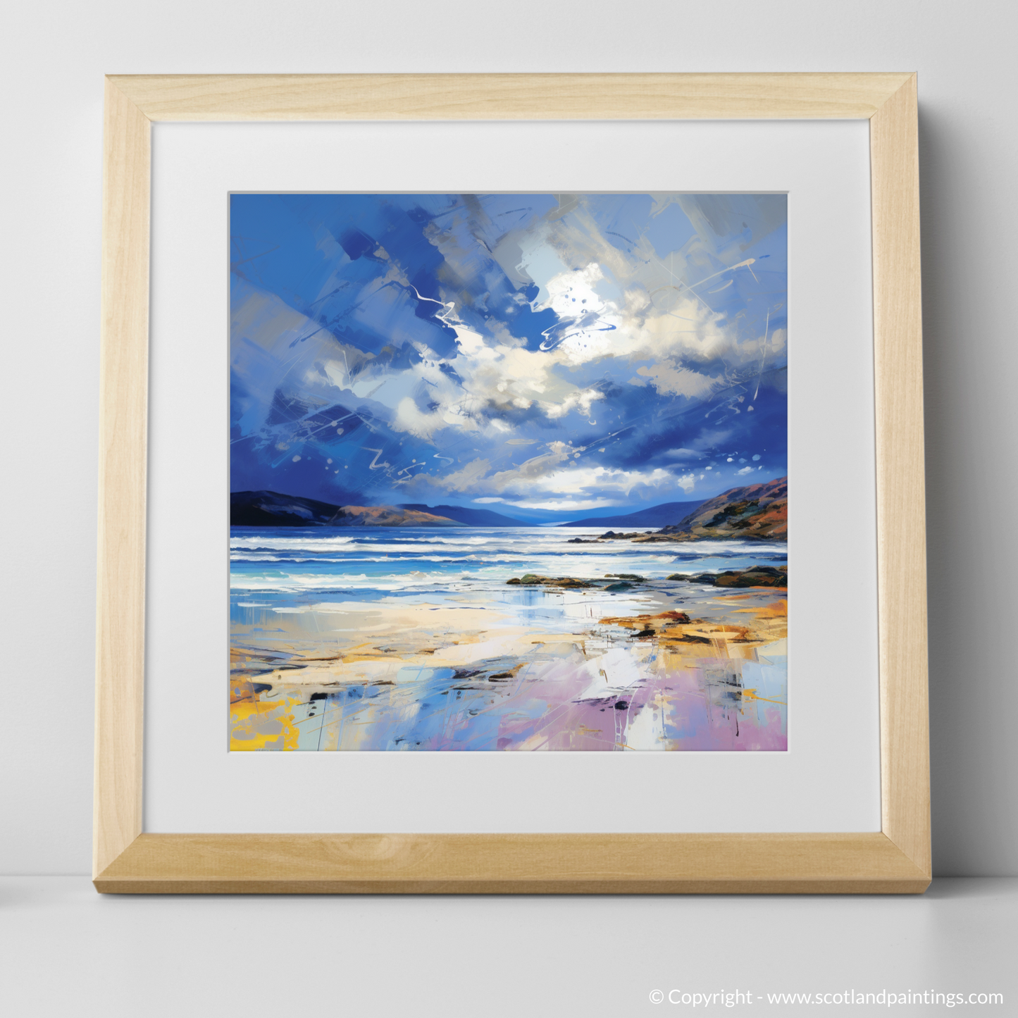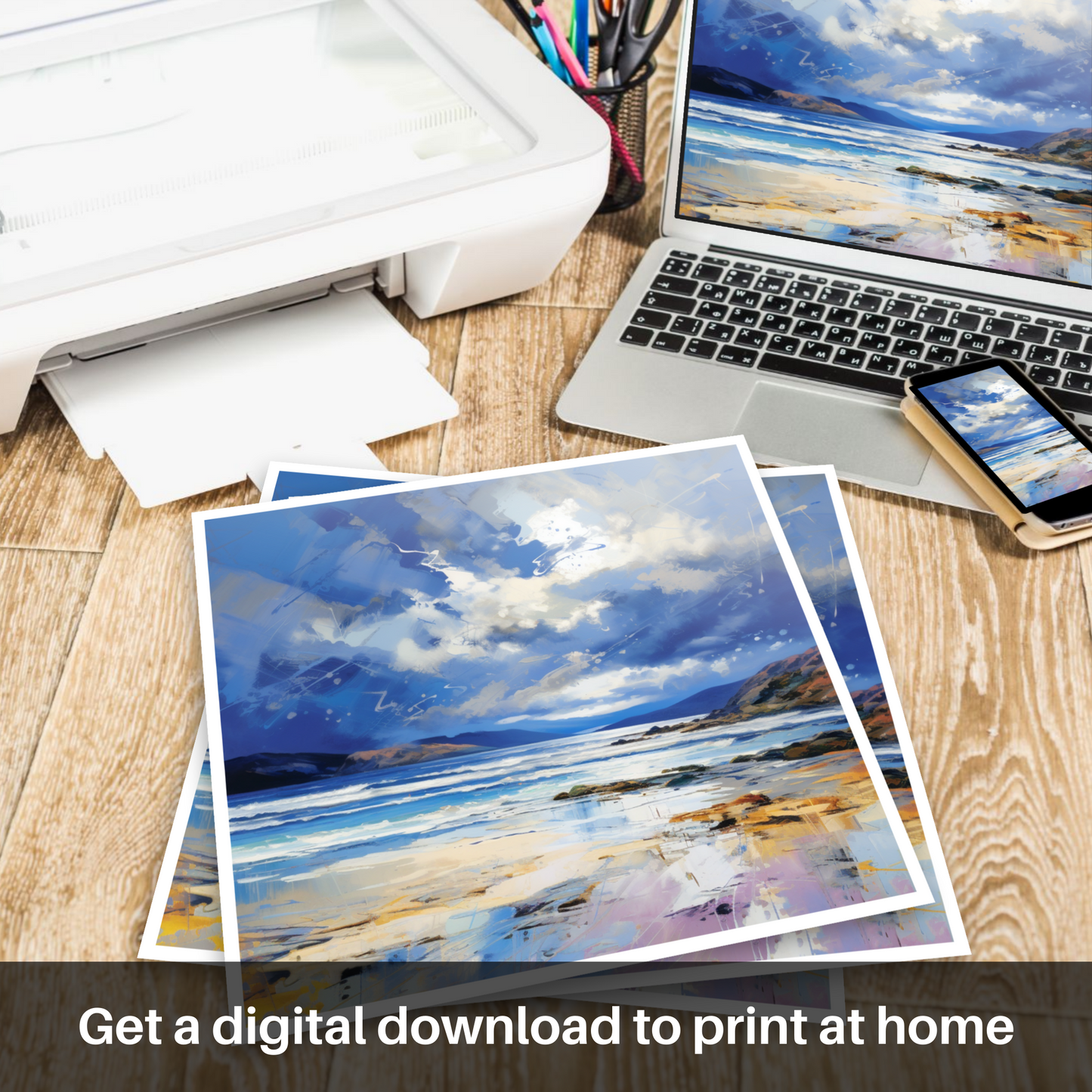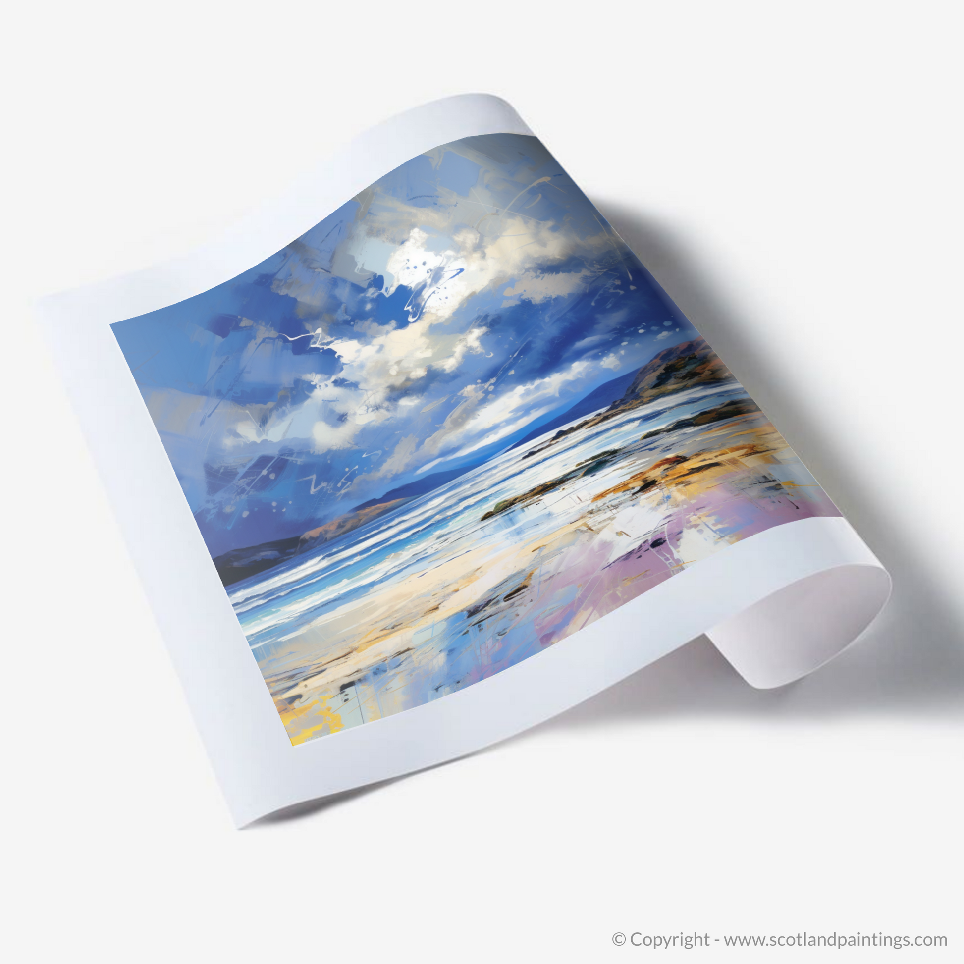 Capturing the untamed spirit of Camusdarach Beach, this vivid print is a visual symphony of colour and motion. The piece presents a dramatic and stormy sky, with tumultuous clouds painted in broad, assertive strokes that conjure images of a maelstrom above. Shades of blue, from the deepest navy to the softest periwinkle, clash and swirl in a chaotic yet harmonious sky, while hints of white and grey cut through like shards of light, offering a stark contrast to the brooding atmosphere.
