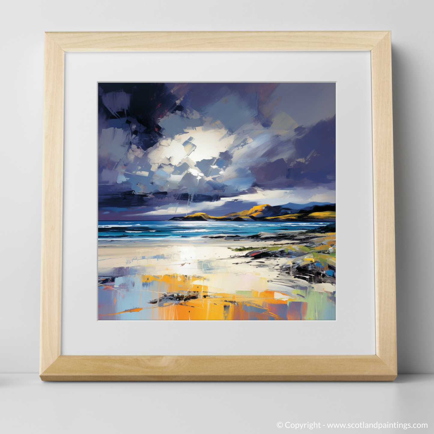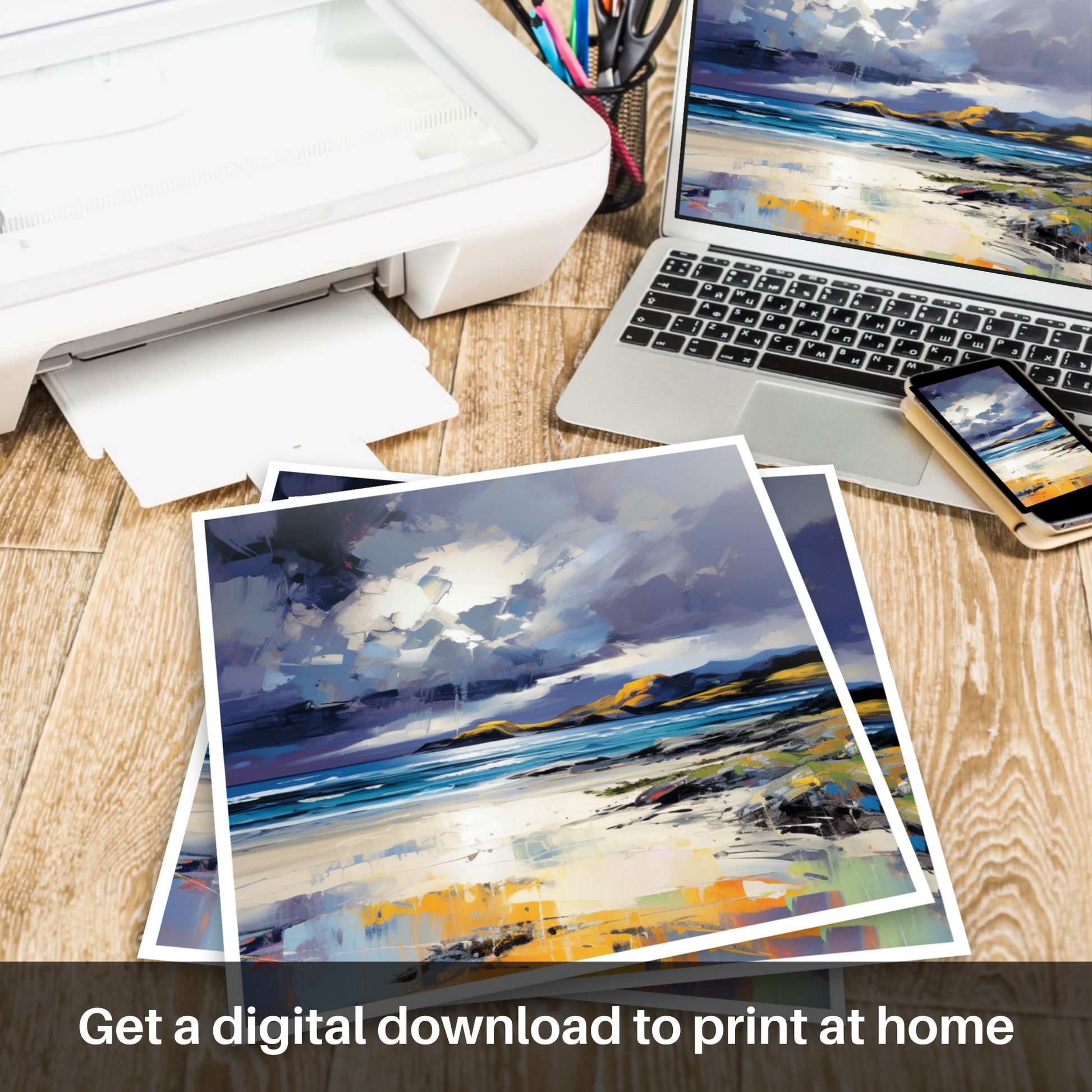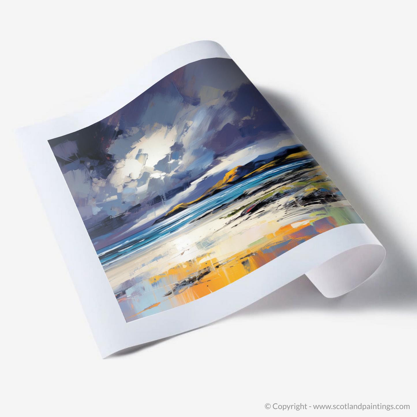 Immerse yourself in the dramatic essence of Scotland's natural beauty with this evocative abstract print inspired by the tempestuous skies and ever-changing waters of Camusdarach Beach. Capturing the raw and rugged landscape, this piece bursts with the intensity of a stormy Scottish sky, expertly conveyed through a symphony of brushstrokes that dance across the canvas in moody hues of grey, white, and deep blue.