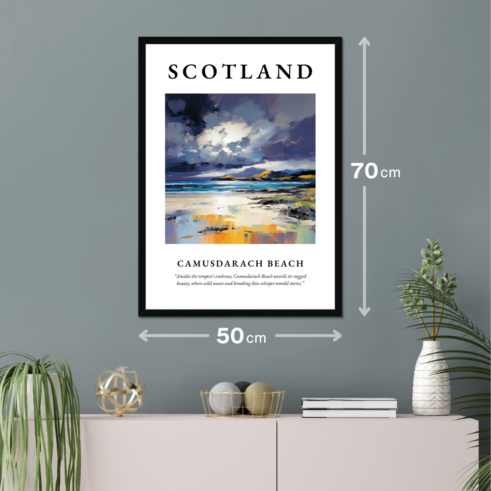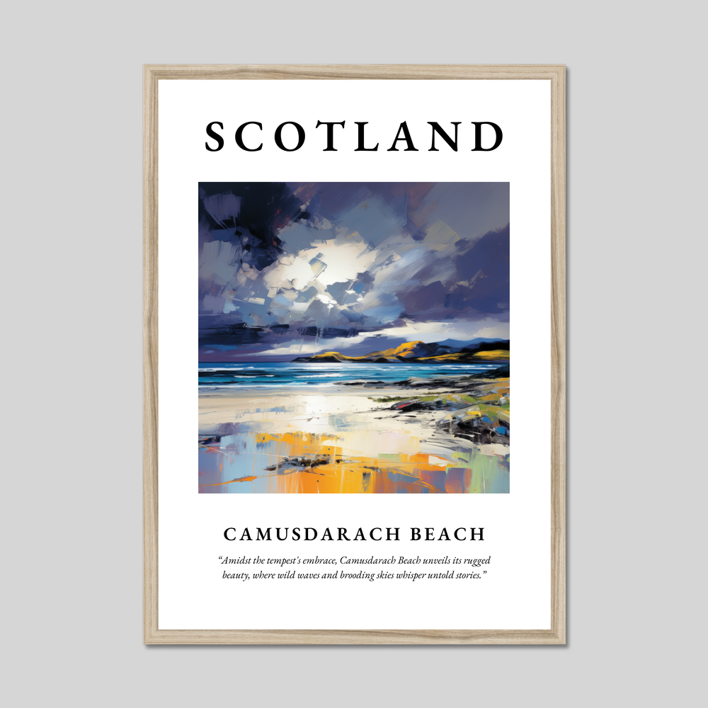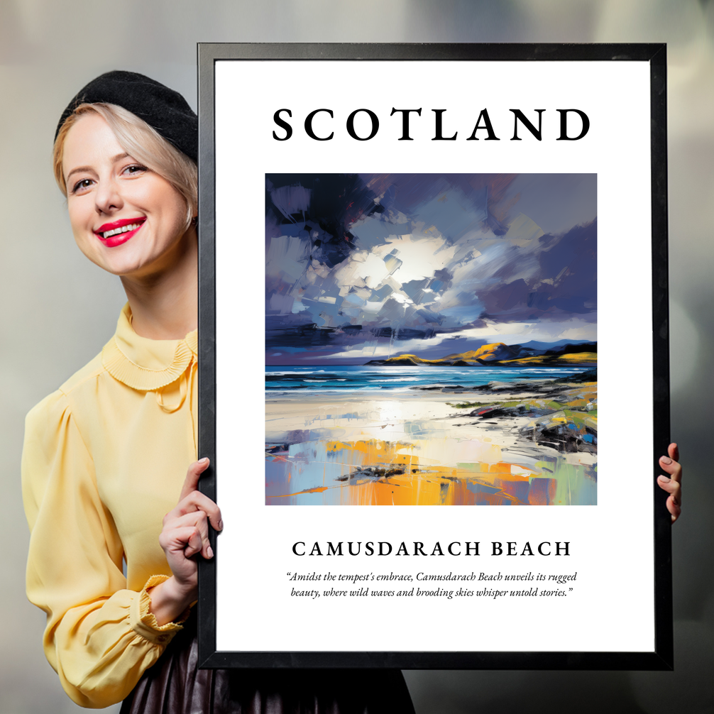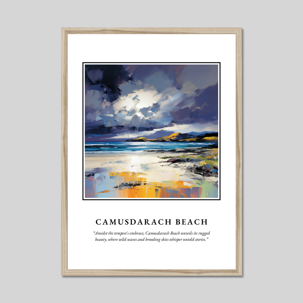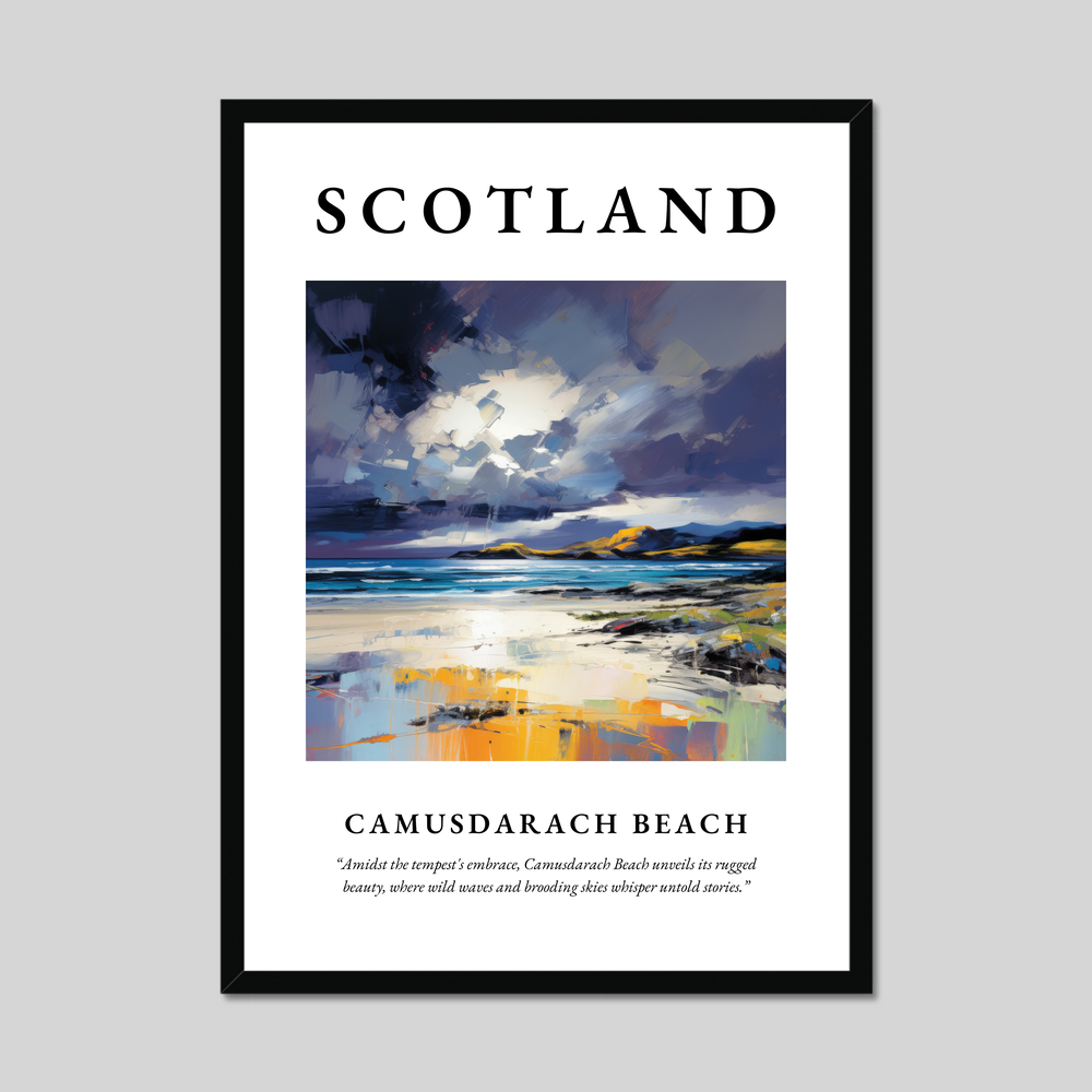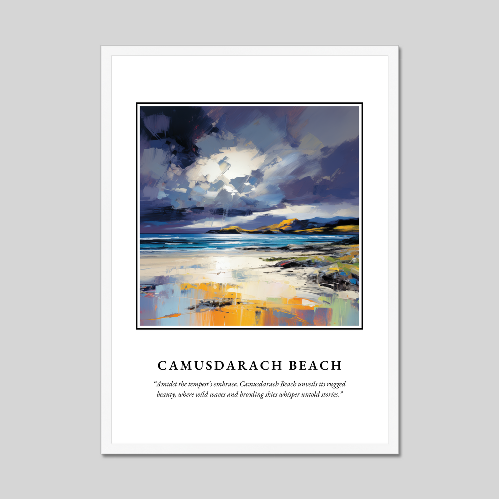 Below the painting, in smaller text, a poignant quote captures the spirit of Camusdarach: “Amidst the tempest's embrace, Camusdarach Beach unveils its rugged beauty, where wild waves and brooding skies whisper untold stories.” This evocative addition invites you to delve deeper into the scene, perfect for anyone who cherishes memories of the place or dreams of visiting.