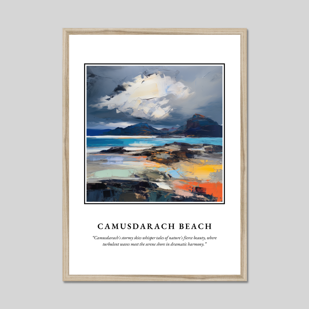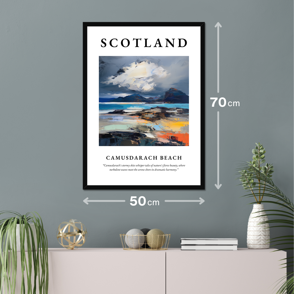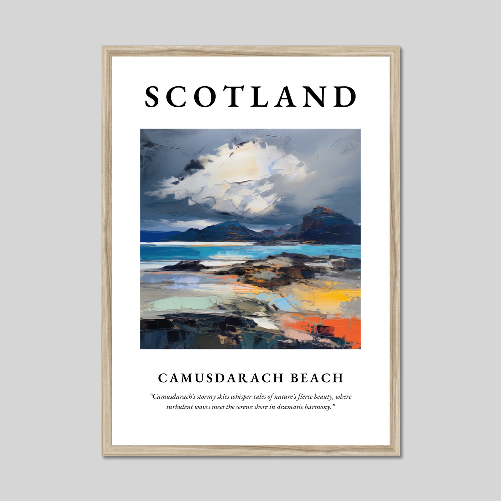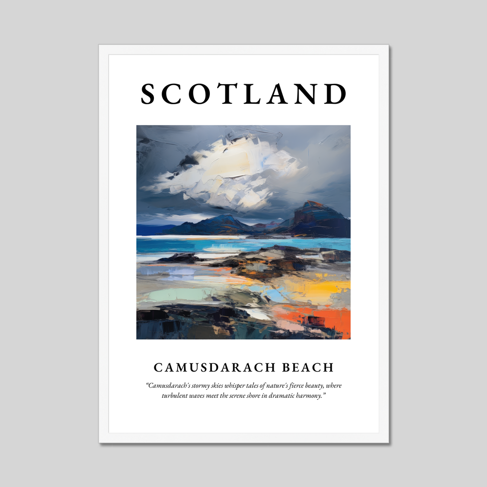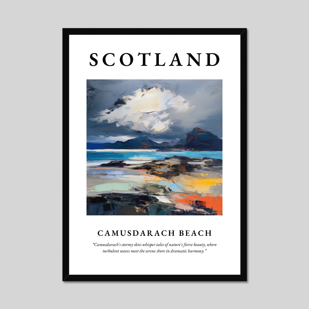 Transform your living space with the captivating allure of our Camusdarach Beach framed poster. Standing at an impressive 50cm x 70cm, this abstract expressionist masterpiece is a bold addition to your art collection, casting an evocative spell that transcends mere decoration. It graciously covers large wall areas, offering an expansive view into Scotland's rugged beauty without breaking the bank. The poster is elegantly encased in your choice of a sleek black, classic white, or rustic natural wood-effect frame, complementing any interior décor with effortless style.