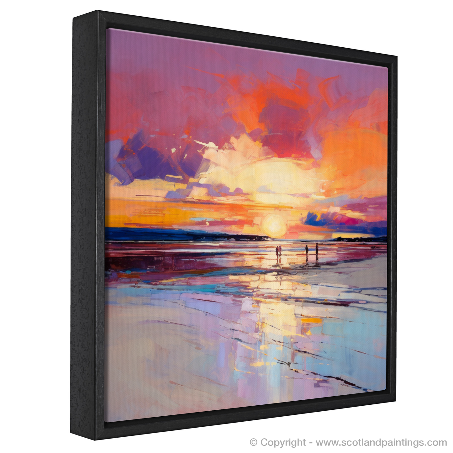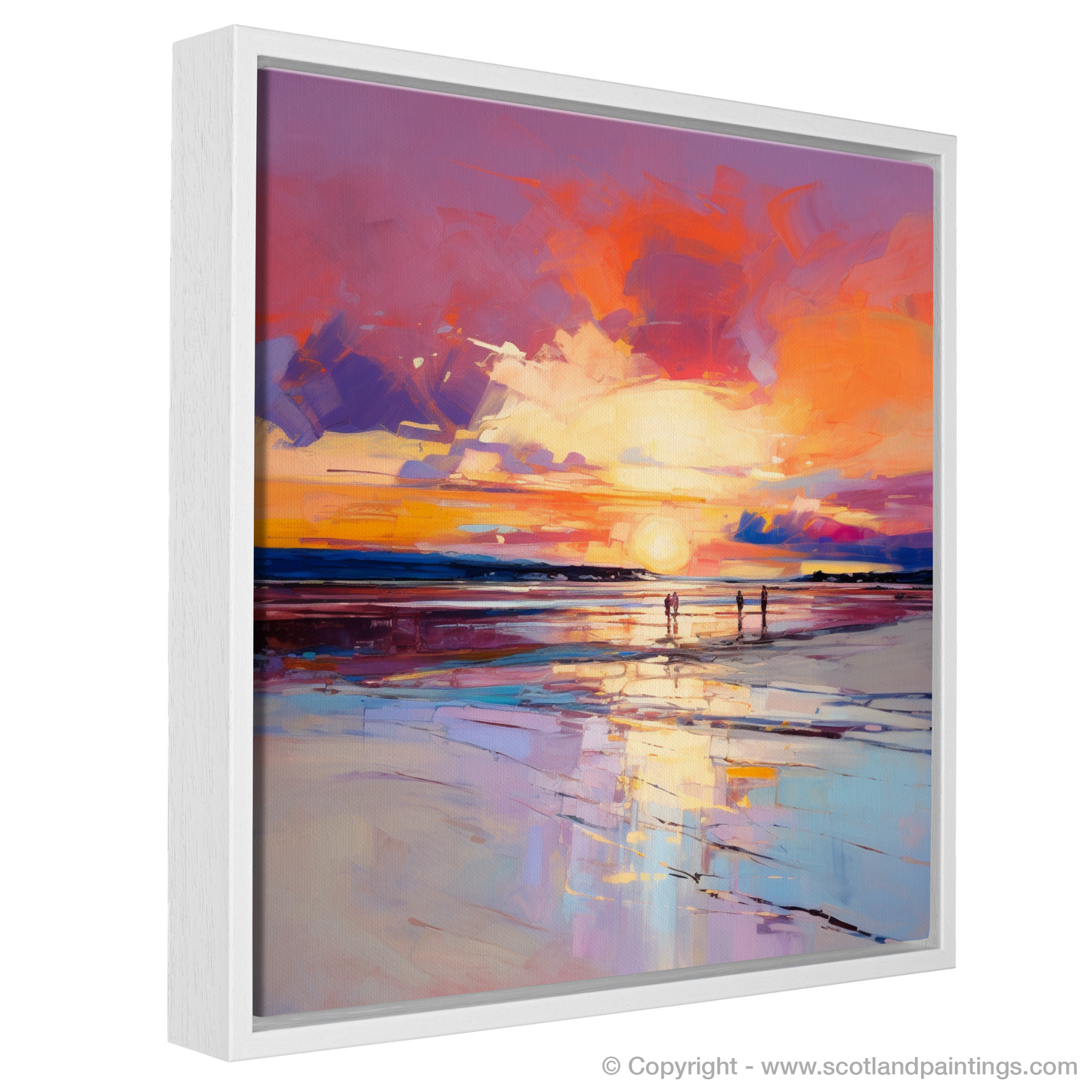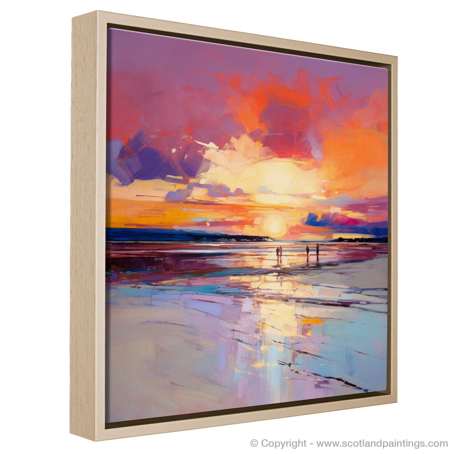 Figures feature in silhouette against the luminous backdrop, their presence offering a grounding contrast to the abstract dance of colours and forms that celebrate the untamed spirit of Scotland's coastal vistas. Each stroke embodies the chill of the sea breeze, the whisper of waves, and the quietude of moments spent on the shore's edge, making the print a dynamic homage to the sensory experiences found at Nairn Beach.