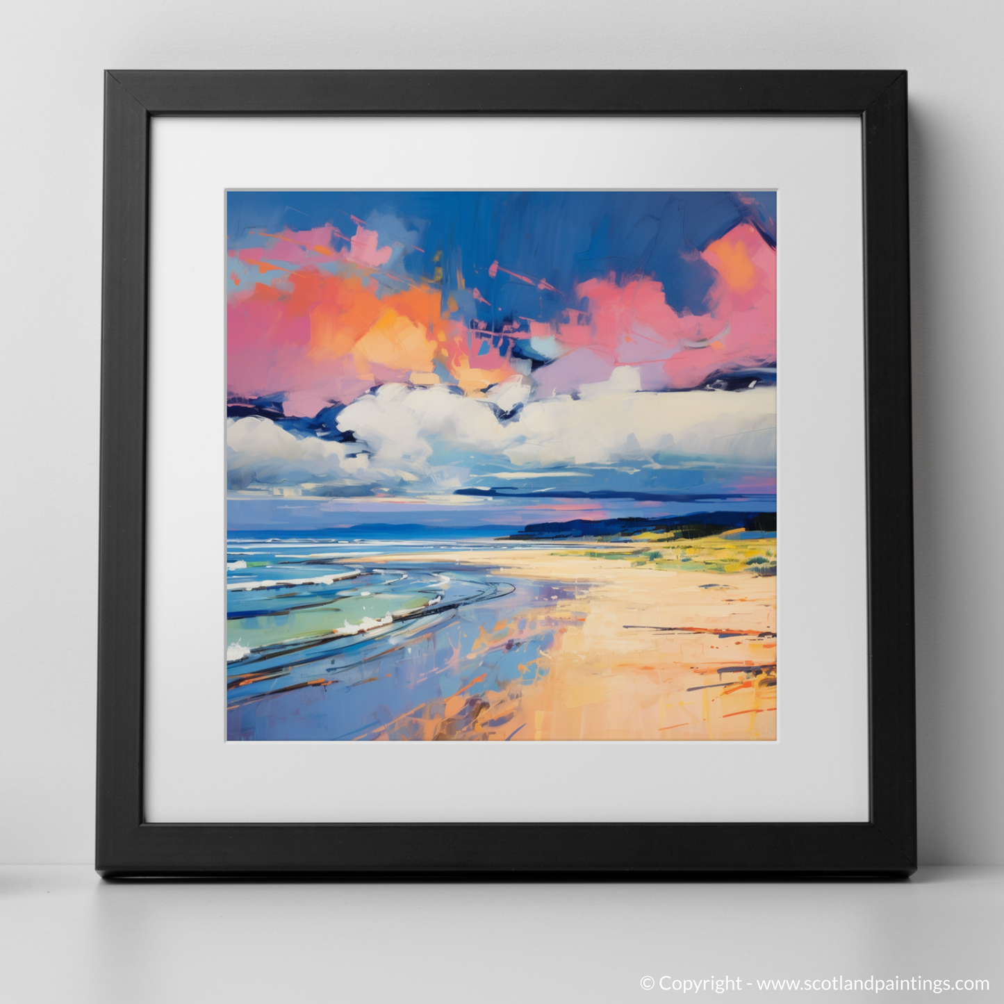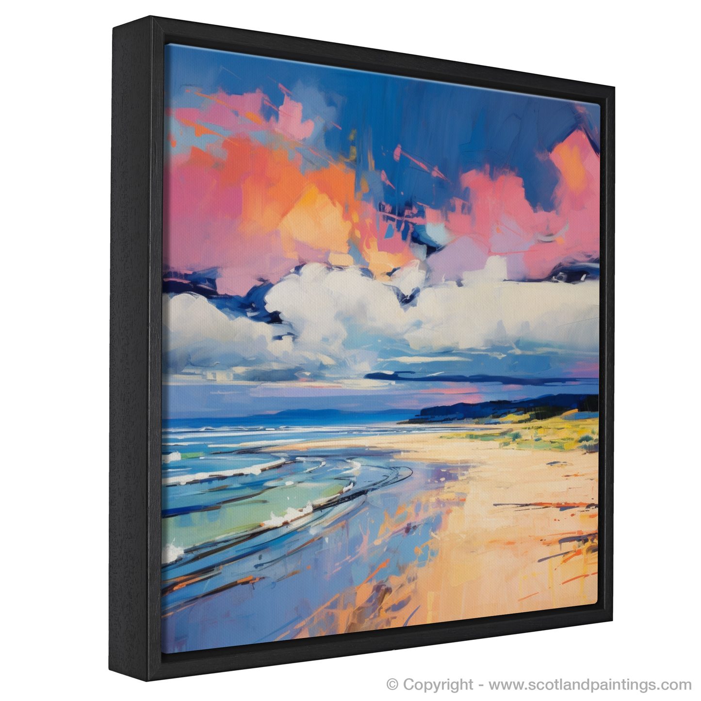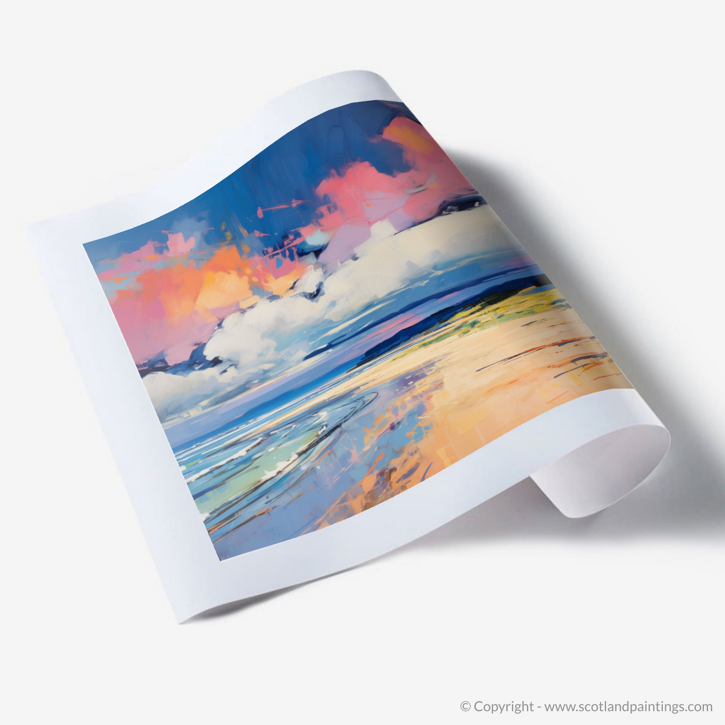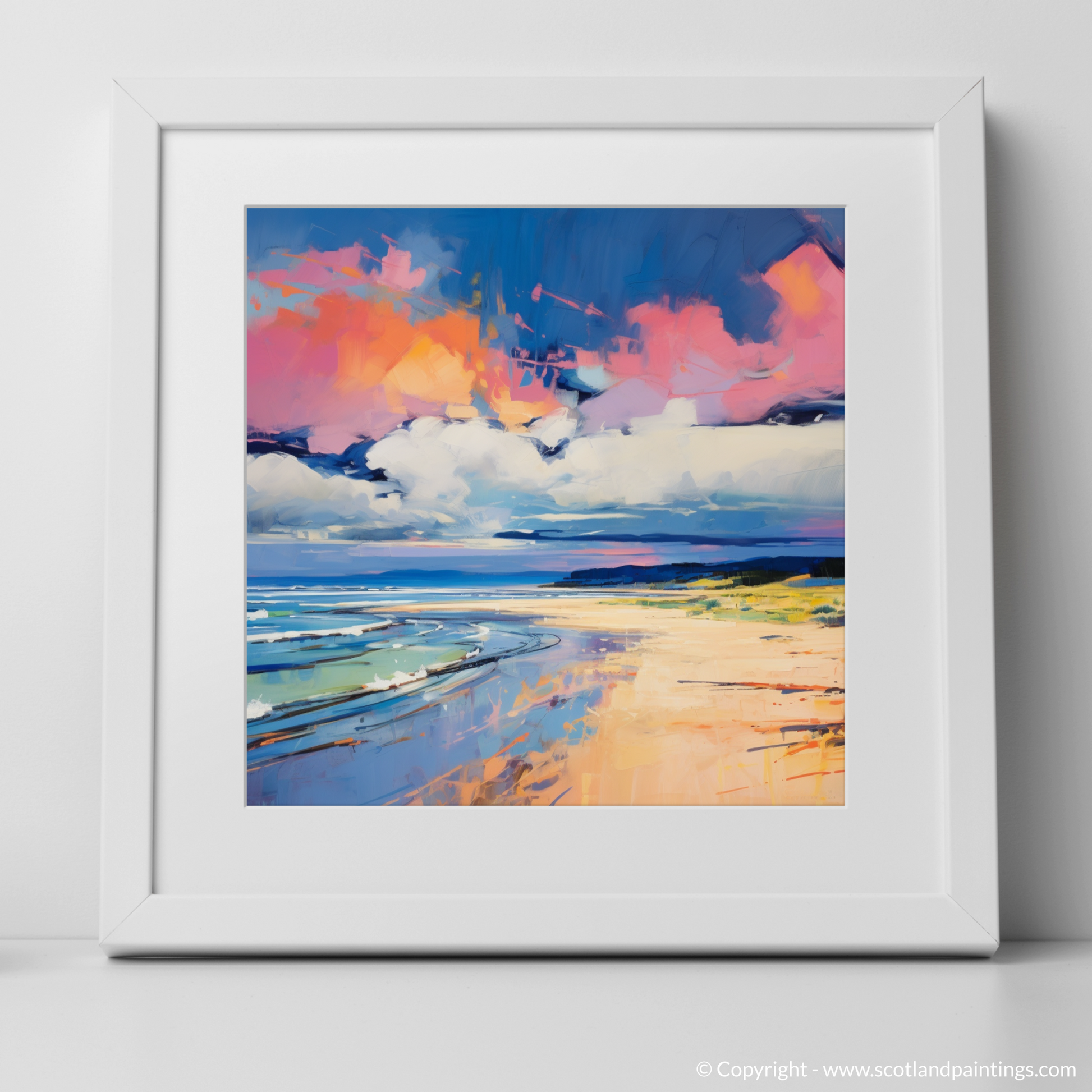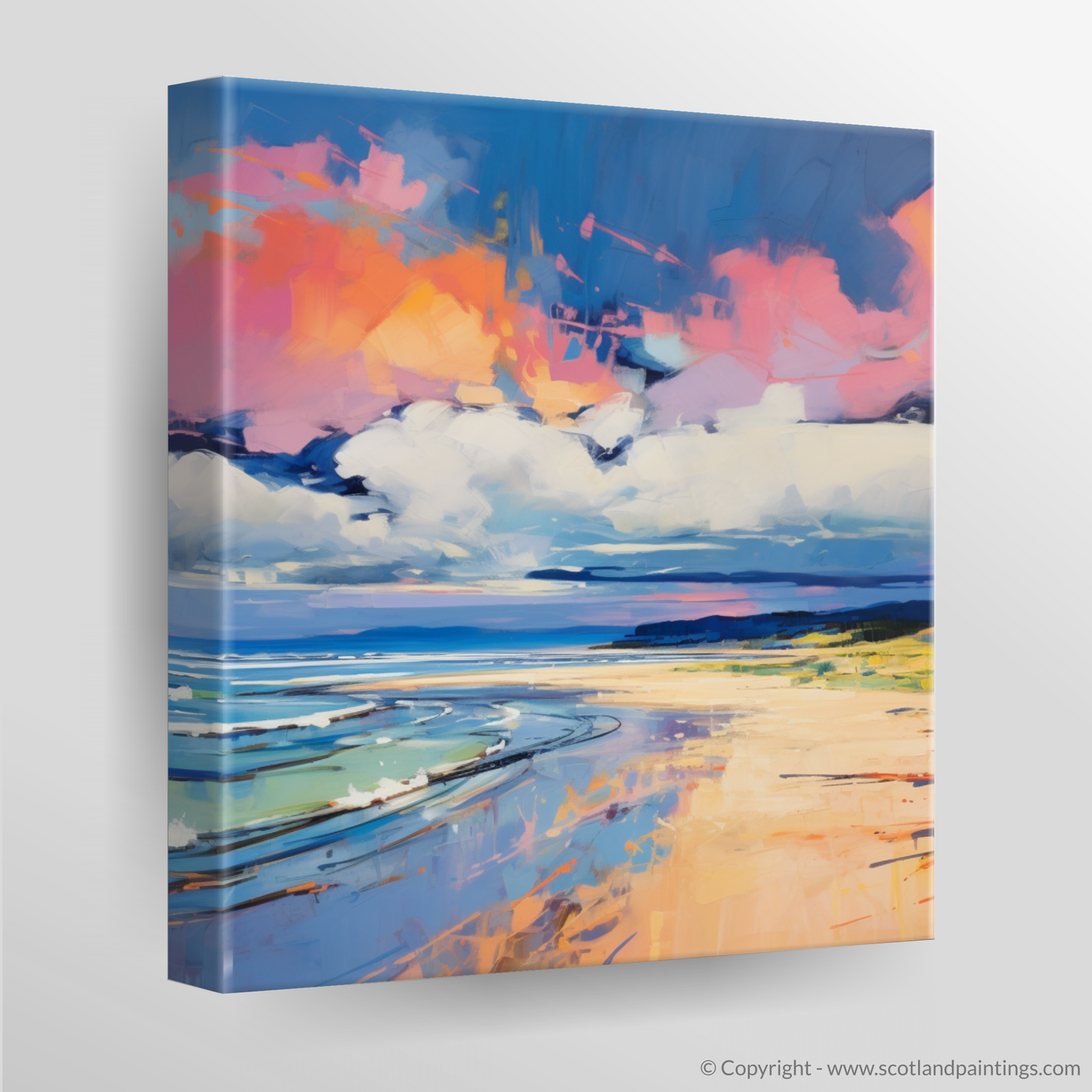 Vivid swatches of colour bring this artwork alive, mirroring the tumultuous emotions evoked by the beach's natural splendour. Explosive shades of pink and orange clash and combine in the heavens above, suggesting the volatile dance between sunset hues and the storm's foreboding greys and blues. Below, the cerulean blues and teal whispers of the churning sea contrast sharply with the amber and golden tones of the sandy beach, conjuring a visual feast that is as much an ode to colour as it is to the Scottish coastline.