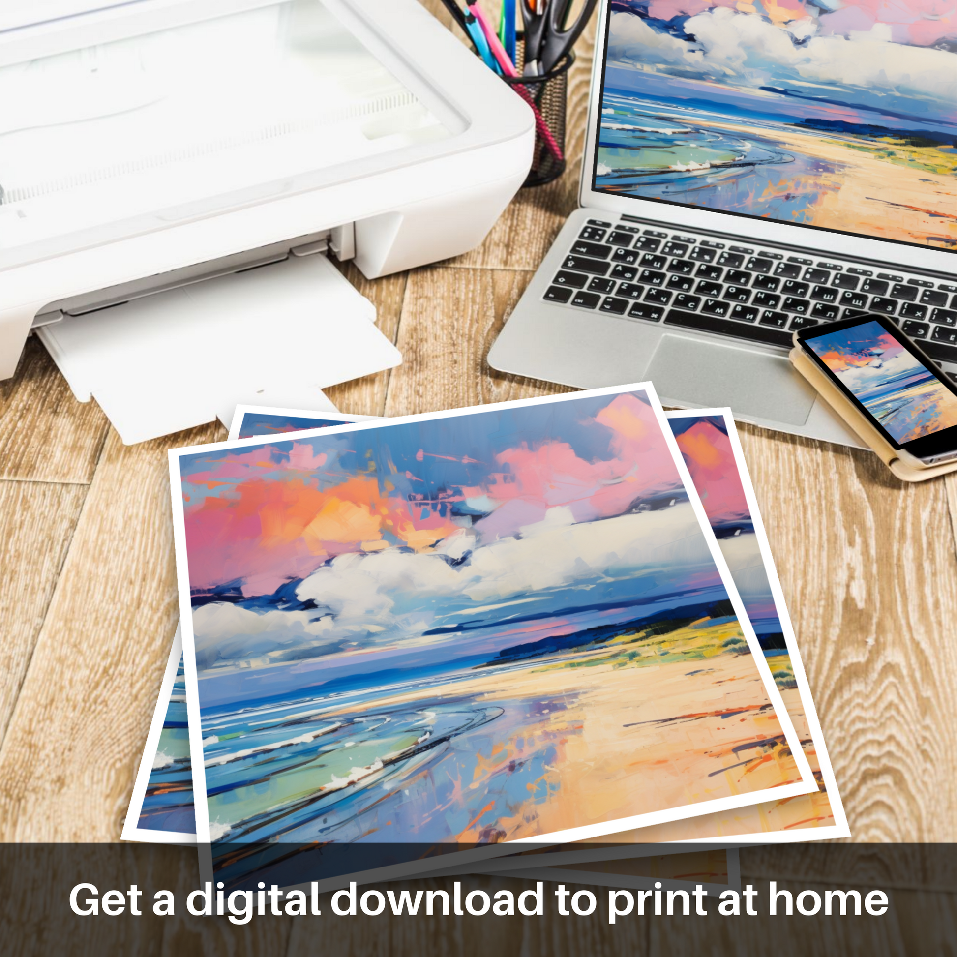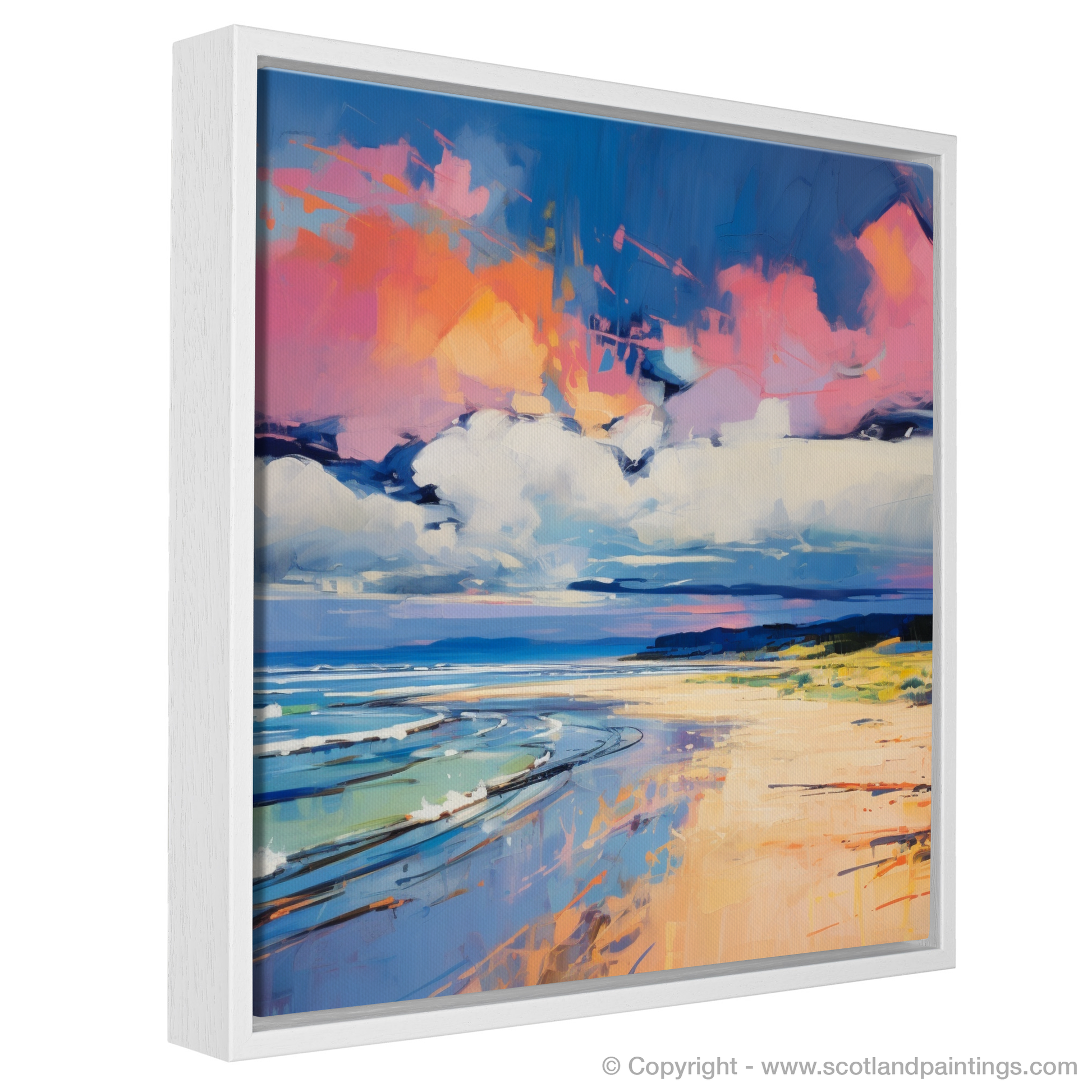 The composition invites the viewer to embrace the duality of nature's serenity and wildness, encapsulating the essence of Nairn Beach through a symphony of colour and form. This exuberant piece from our 'Scottish Beaches' collection promises to bestow a spirited and contemporary coastal ambience to any room it graces.