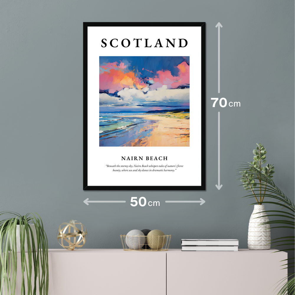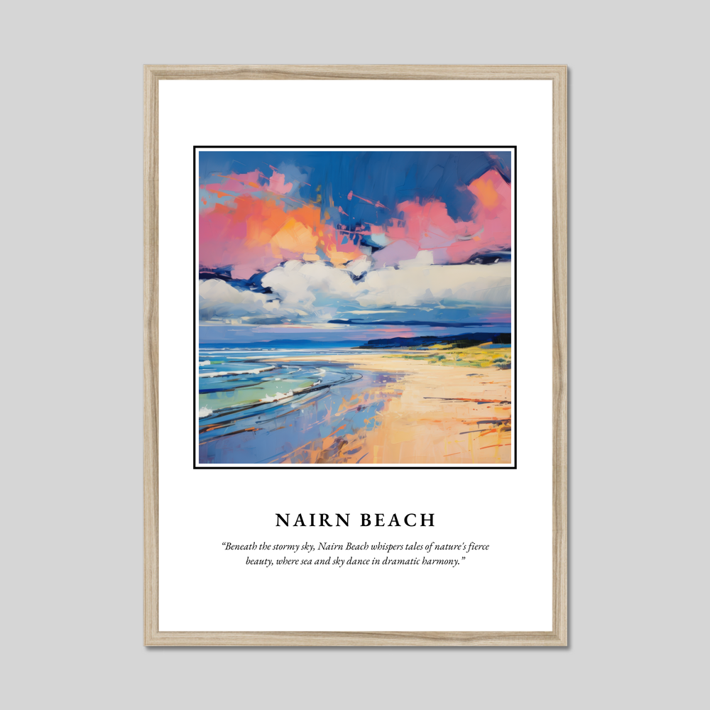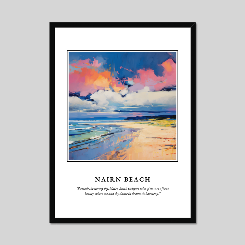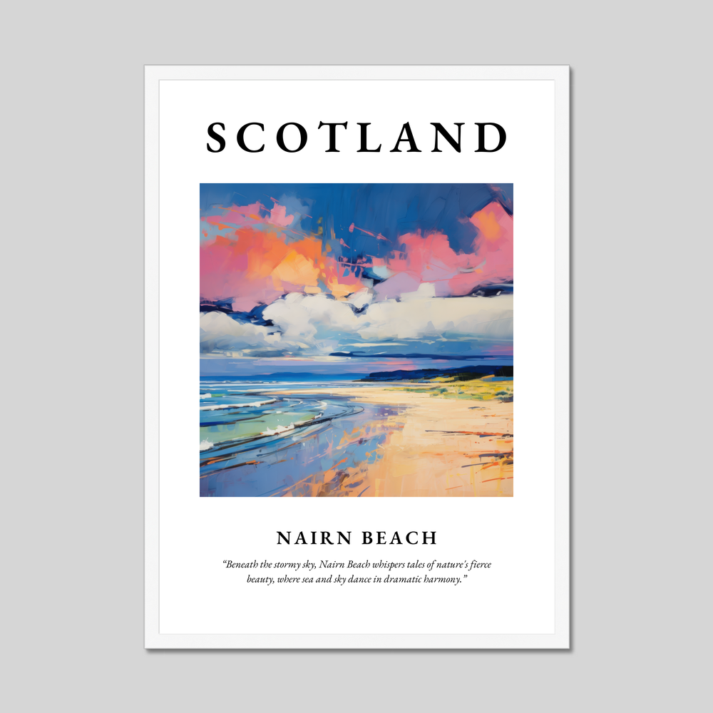 Prominently featuring the word “SCOTLAND” in bold lettering, this poster succinctly captures the spirit of the land. Below the title, the eye is drawn to the vivid portrayal of Nairn Beach—a symphony of colours and dynamic forms that encapsulates nature's majesty. The lower text adds a poetic touch with the quote, “Beneath the stormy sky, Nairn Beach whispers tales of nature's fierce beauty, where sea and sky dance in dramatic harmony.” This quote beautifully echoes the vibrancy and movement rendered in the painting, infusing your home with a sense of drama and vitality.