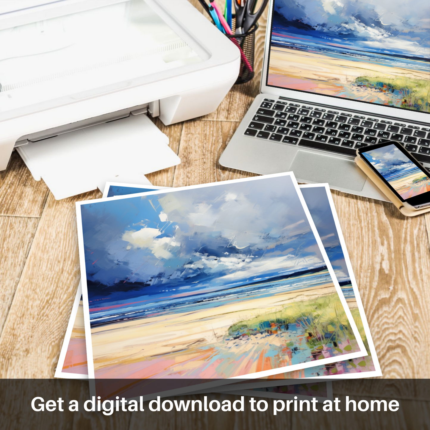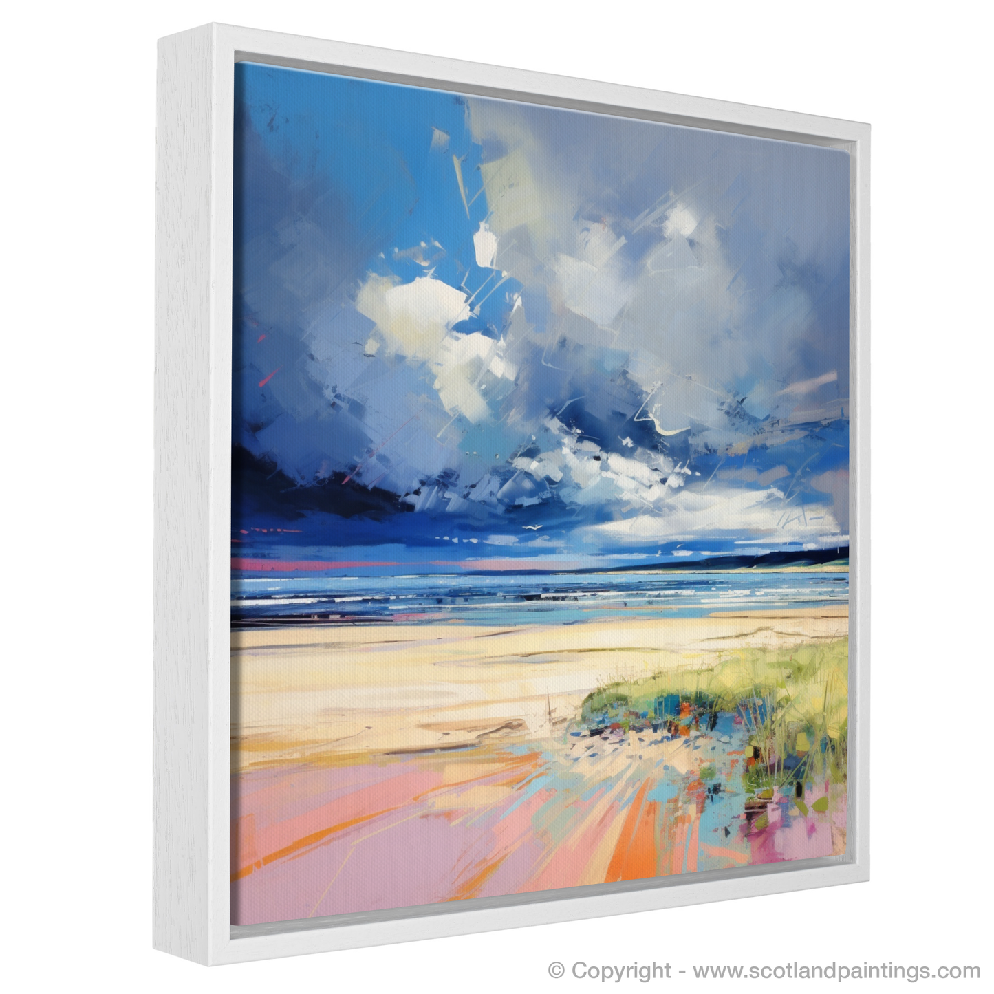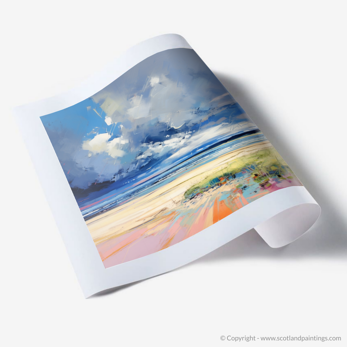 Capturing the untamed spirit of Nairn Beach under a turbulent canopy, this striking print brings the drama of the Scottish coastline into your living space with a bold, pop art twist. The palette sings with contrasts, marrying the cool hues of the brooding stormy sky with the warm tones of the sandy beach below. Bursts of vivid blues and whites in the heavens above suggest a bluster of movement, an energetic play between light and dark that ushers in the storm's approach.