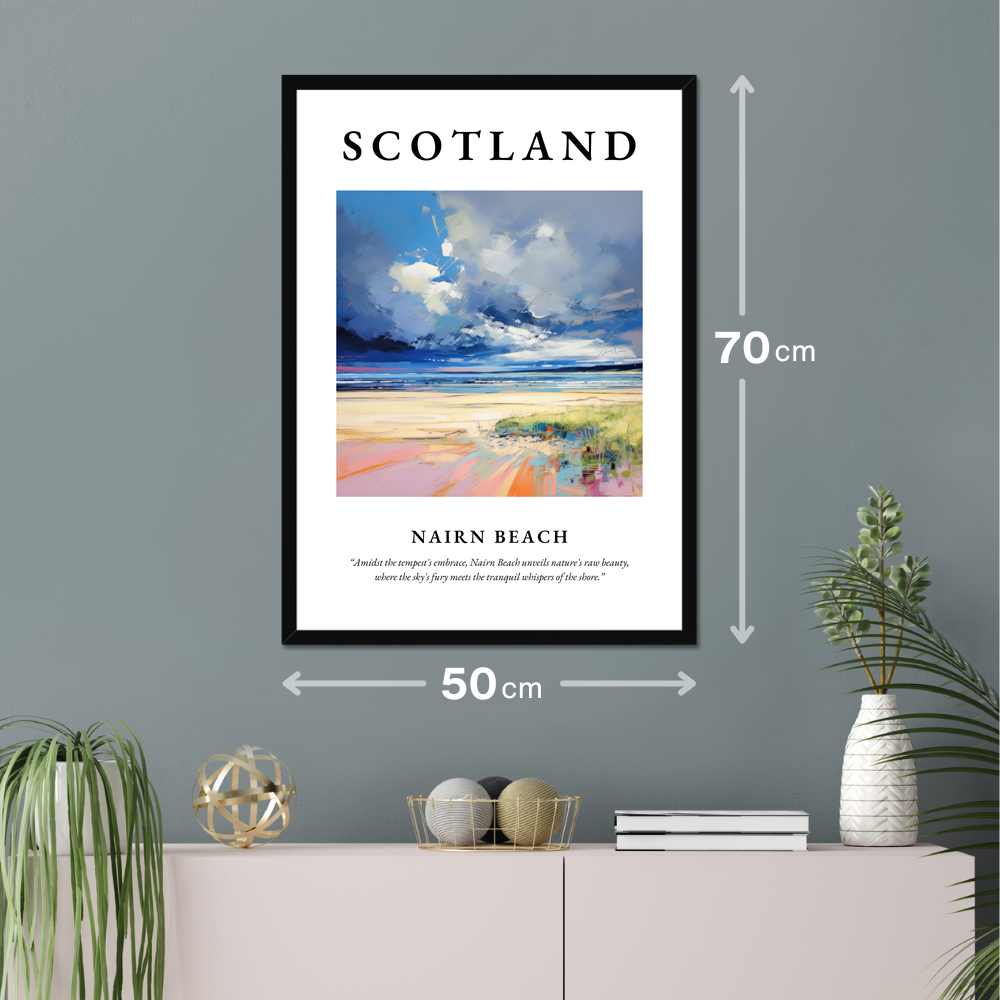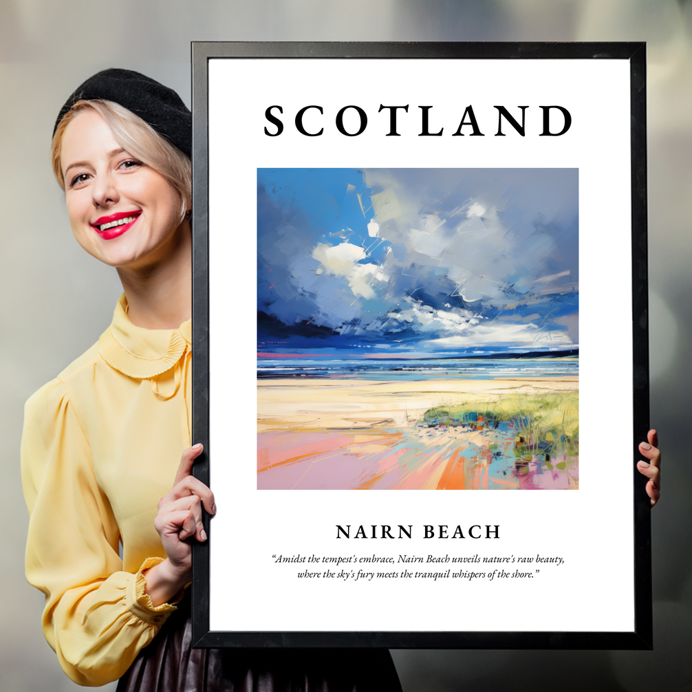 Located on the Moray Firth in Scotland, Nairn Beach is famed for its expansive views and unspoilt sands. It's a place where natural elements often clash, creating breathtaking moments of beauty—much like the scene preserved on our poster. As coastal winds whip across the golden sands, the beach’s ever-changing personality is mirrored in the artwork’s vibrant expression and dynamic style.