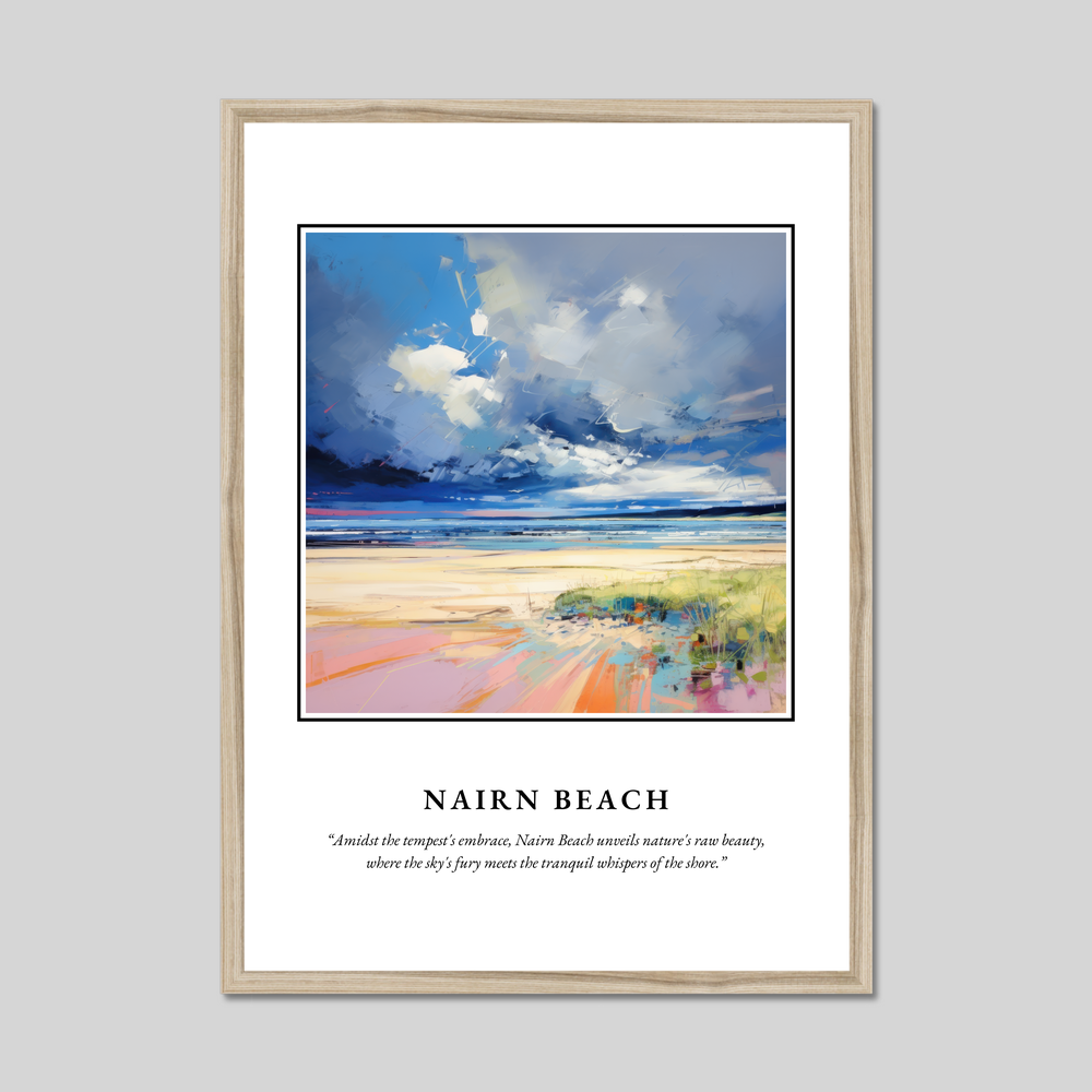 The main painting showcases Nairn Beach in an explosion of colour and energy. Broad, sweeping brushstrokes capture the dramatic skies as they clash with the tranquil whispers of the shore. The vivid palette brings the scene to life, allowing you to feel the pulse of the waves and the crisp sea breeze. Beneath the bold “SCOTLAND” header, the painting is accentuated with a quote that perfectly encapsulates the essence of this unique setting: “Amidst the tempest's embrace, Nairn Beach unveils nature's raw beauty, where the sky's fury meets the tranquil whispers of the shore.”