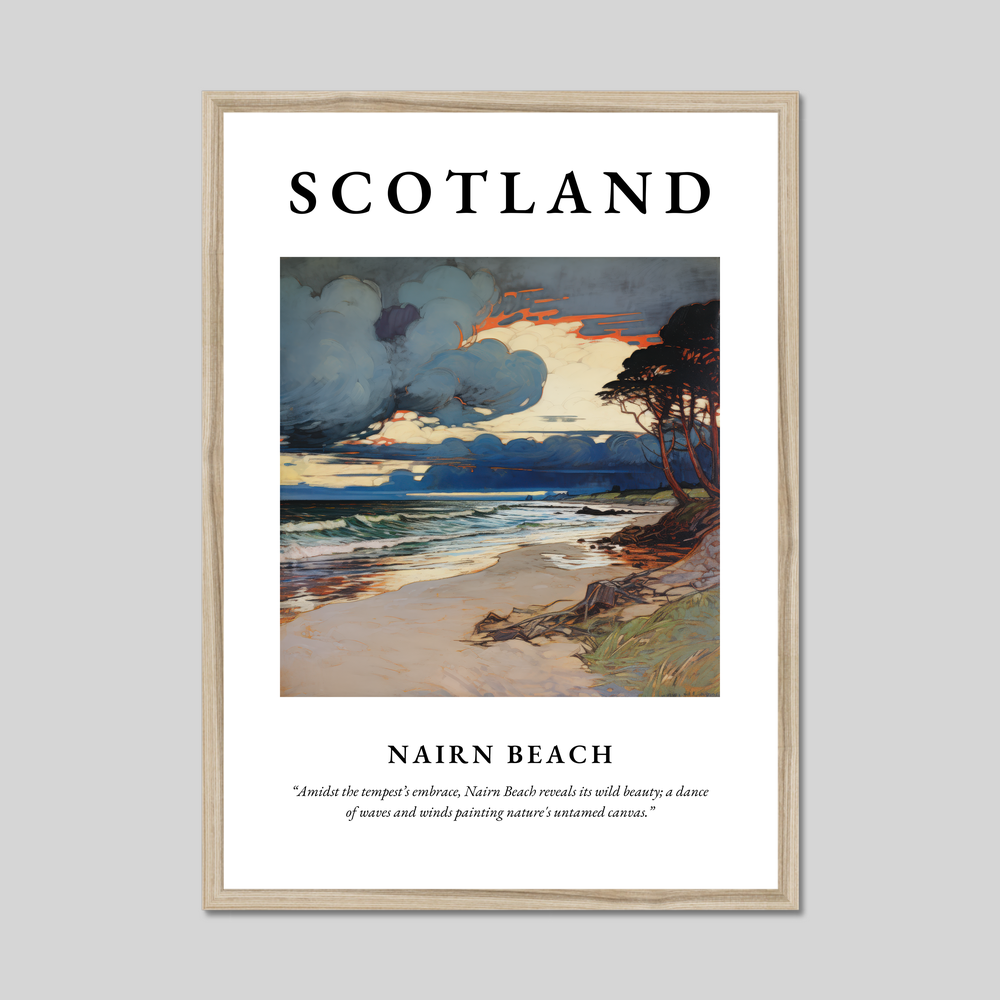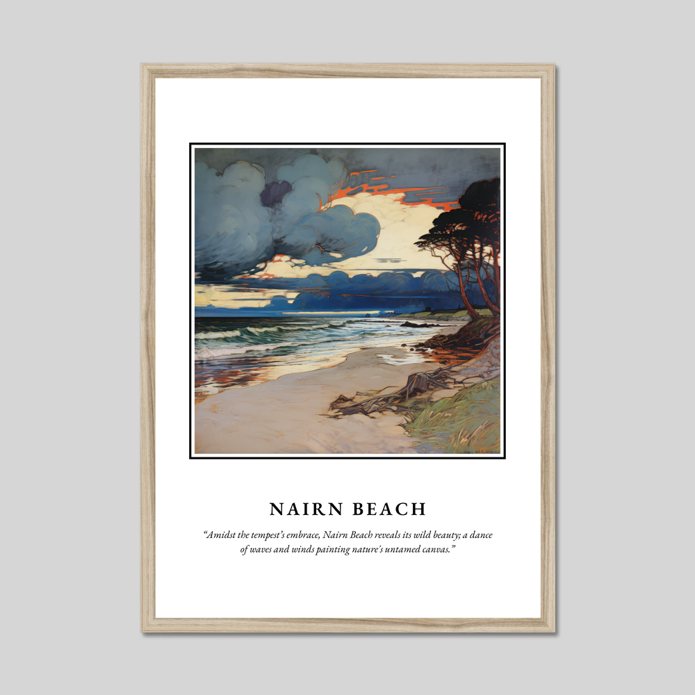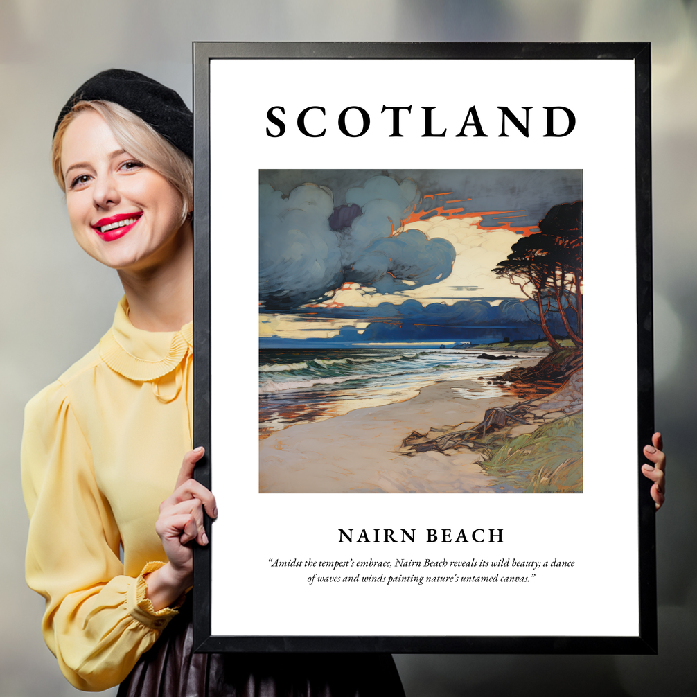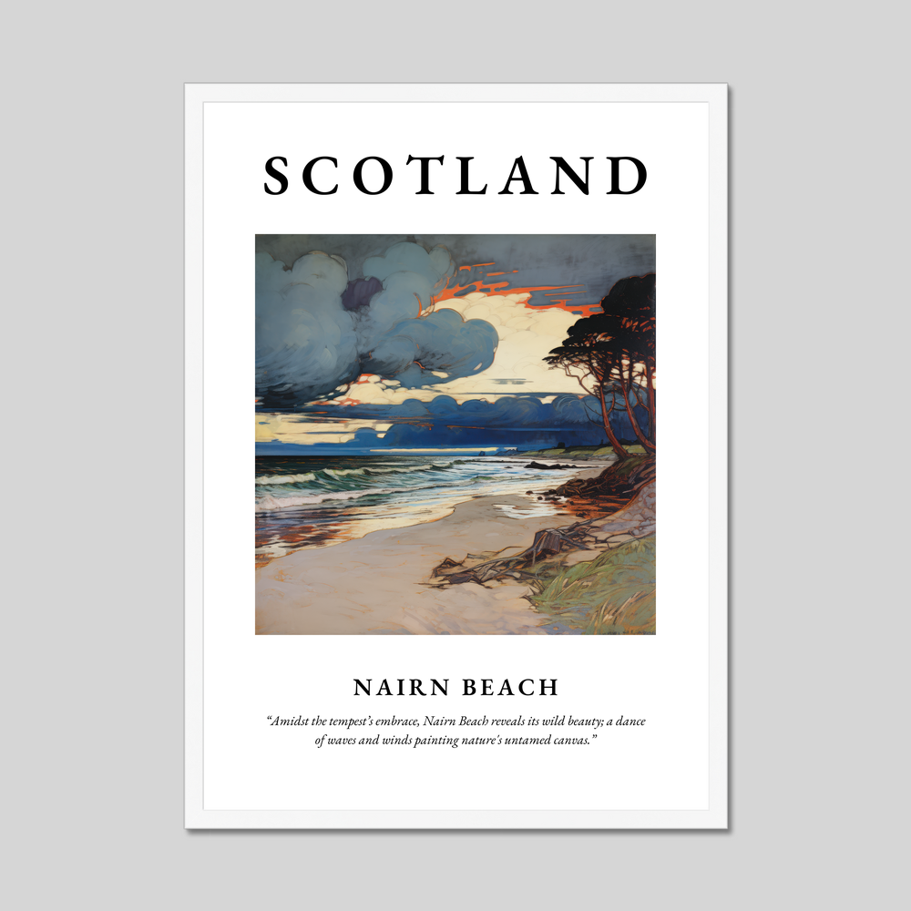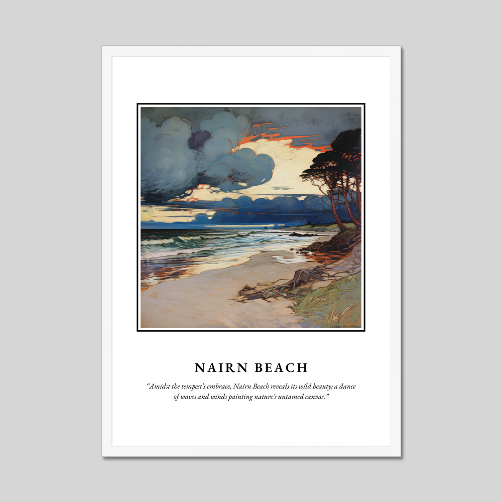 Below the captivating artwork, you'll find the evocative quote: “Amidst the tempest’s embrace, Nairn Beach reveals its wild beauty; a dance of waves and winds painting nature's untamed canvas.” The painting itself masterfully captures the dramatic interplay of storm clouds, crashing waves, and serene sandy shorelines, reminiscent of nature’s own masterpiece. The flowing lines and intricate details of the Art Nouveau style offer a unique blend of elegance and nature, making it a must-have for art lovers and admirers of this aesthetic.