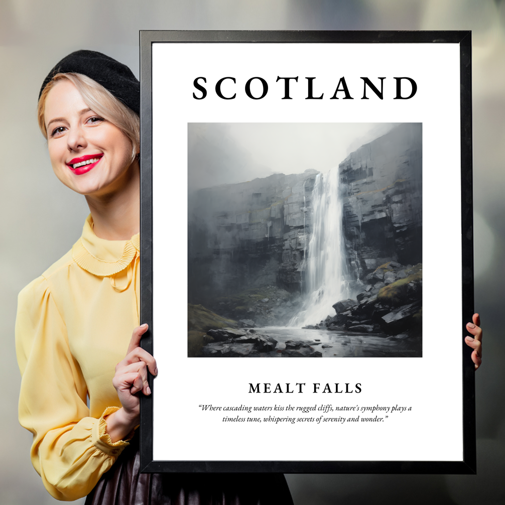 At the forefront, the word “SCOTLAND” stands boldly, inviting you to delve into the natural beauty depicted below. The minimalistic painting captures the essence of Mealt Falls with its serene and understated elegance. Soft hues and simplified forms highlight the waterfall's majestic descent, conveying a sense of peace and awe. Beneath this evocative scene, a poetic quote whispers secrets of tranquility, perfectly encapsulating the artwork's mood.