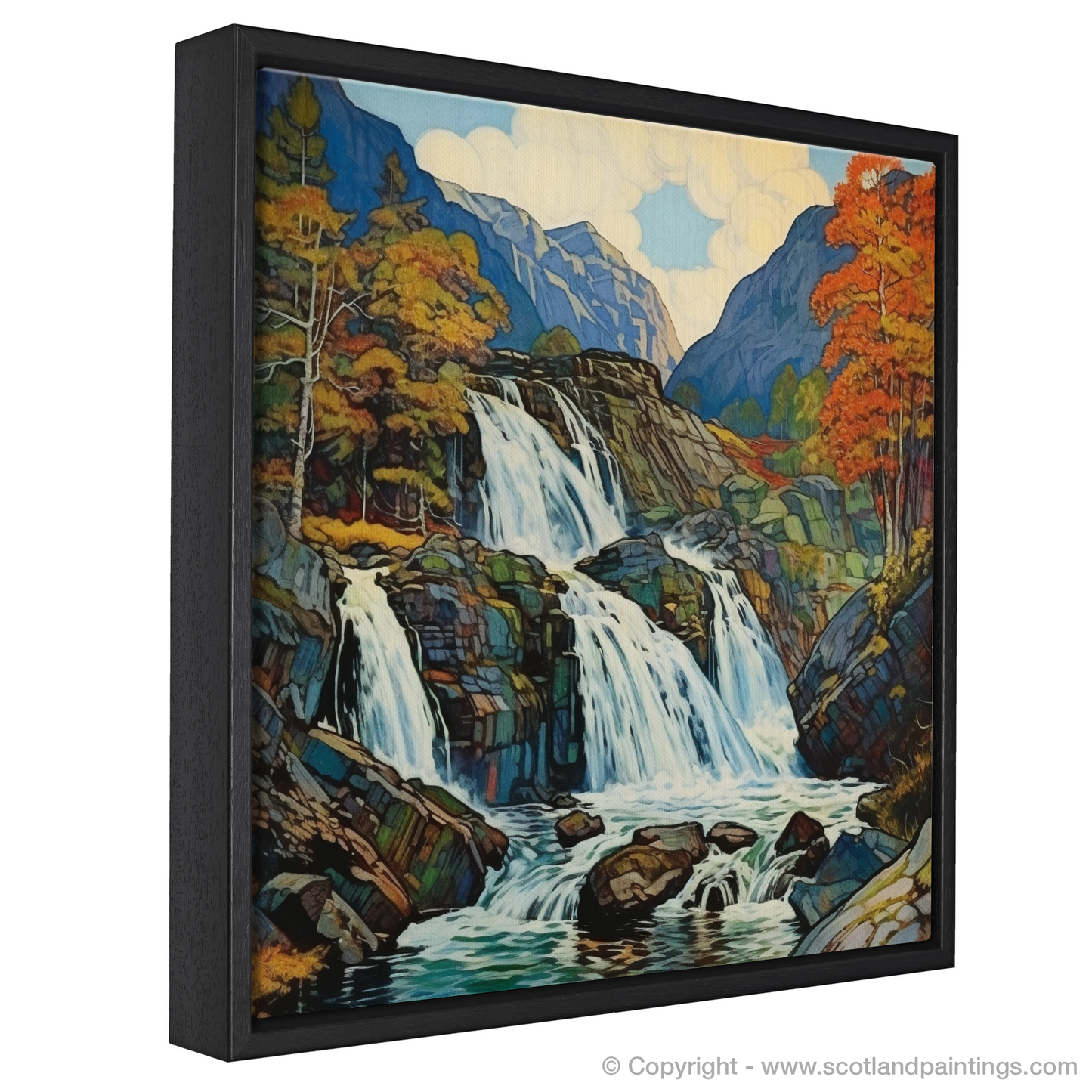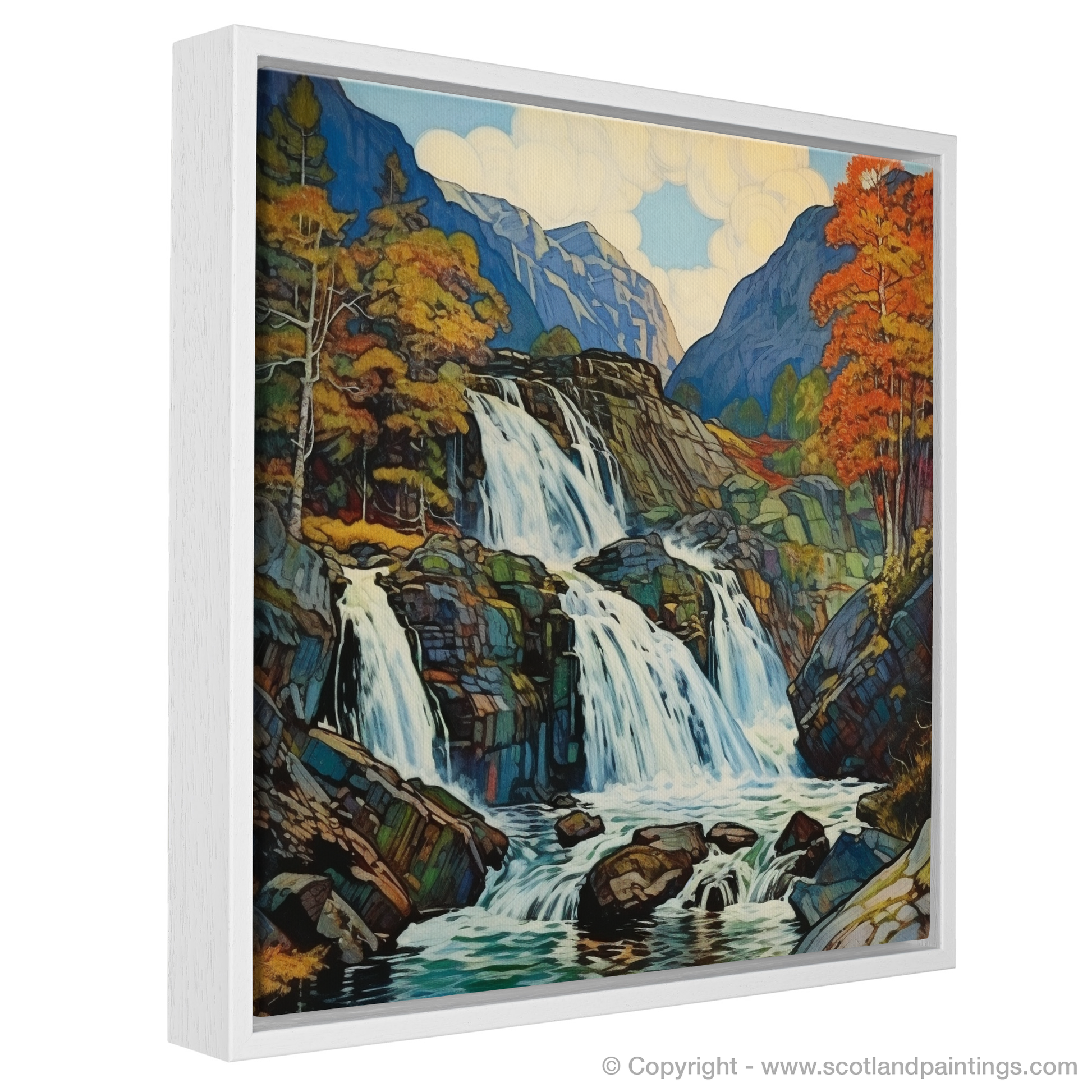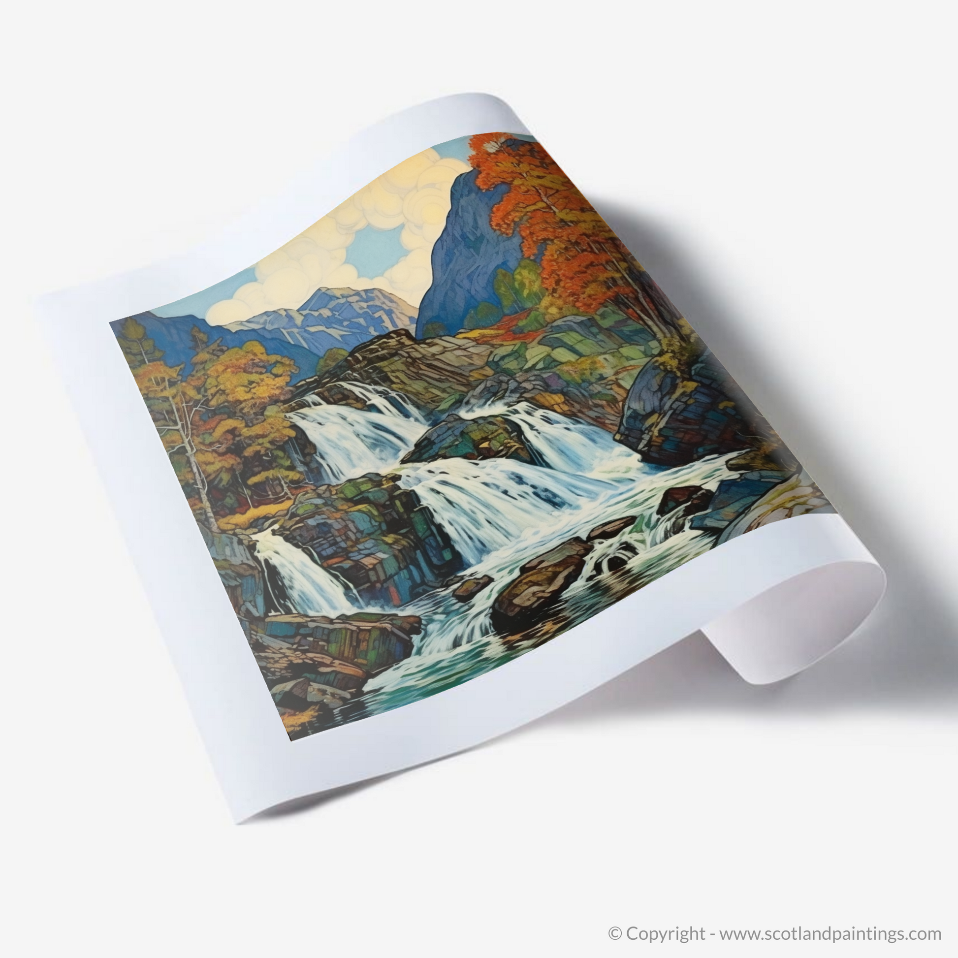 The artwork presents a delightful visual symphony, where cascading waters dance amidst a rugged ballet of geometric rocks, all bathed in a warm, mellow light. A palette of jewel-toned blues and greens meld harmoniously with autumnal oranges and yellows, evoking the changing seasons and the timeless appeal of the Highland's unspoiled landscapes.