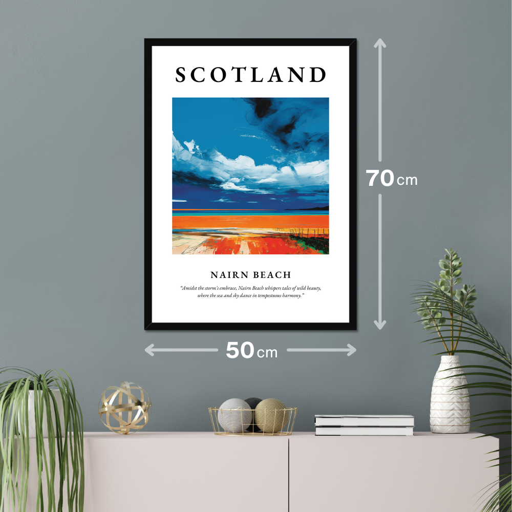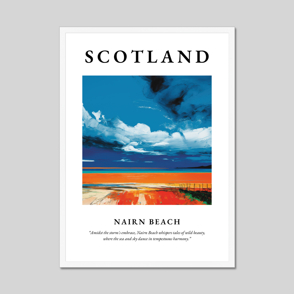 Immerse yourself in the enchanting allure of Scotland with our stunning framed poster print, a tribute to the breathtaking beauty of Nairn Beach. Measuring an impressive 50cm x 70cm, this large art piece promises to dominate any wall with its vibrant presence, bringing a touch of the Scottish coast into your home or office without breaking the bank.