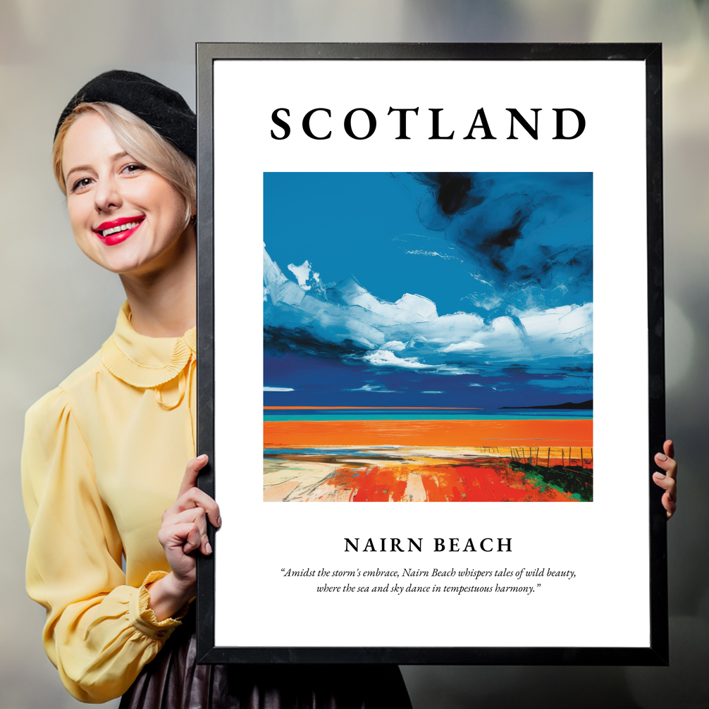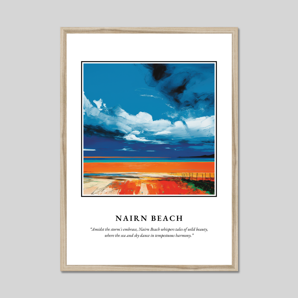 Underneath this striking image, the quote “Amidst the storm's embrace, Nairn Beach whispers tales of wild beauty, where the sea and sky dance in tempestuous harmony” evokes the mythical charm of this coastal haven. Available in a choice of black, white, or natural wood-effect frames, this piece offers versatility to fit any decor, while its size makes it a statement piece that draws attention and admiration from all who visit.