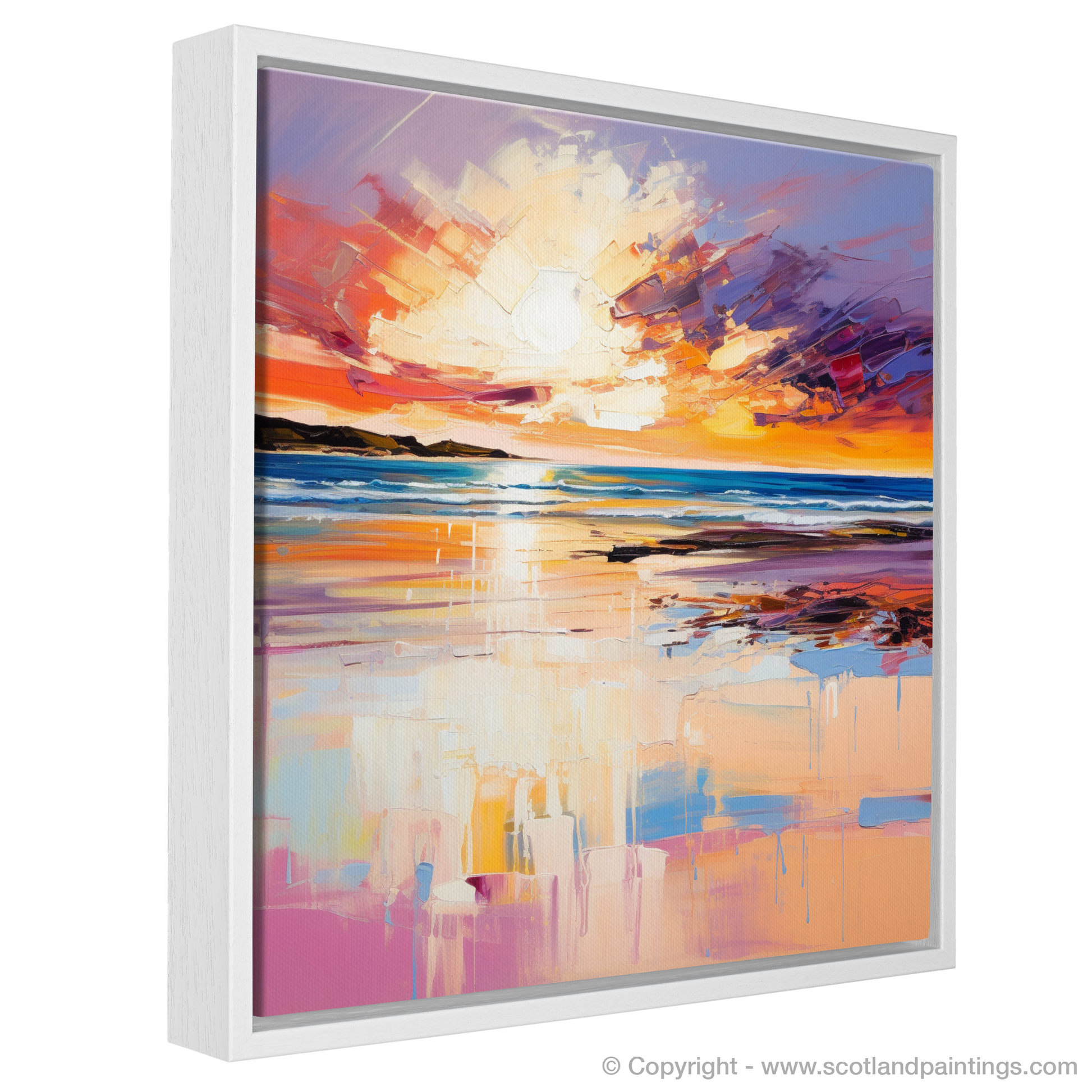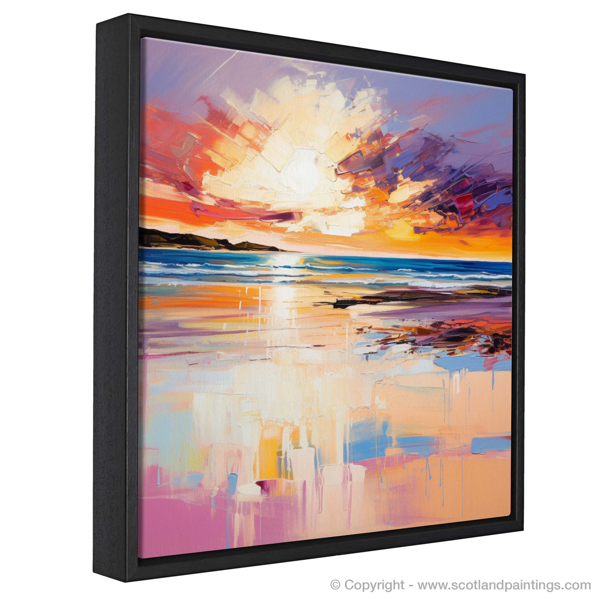 In a symphony of colour and light, this captivating print takes you on a sensory journey to the serene shores of Nairn Beach as the day bids farewell. The dynamic strokes and vivid palette evoke the essence of golden hour—when the sun dips into the horizon, casting its warm glow over the landscape and igniting the sky with hues of orange, cerise, and lilac. This artwork is an abstract impressionistic homage to Scotland's coastal splendour, masterfully capturing the reflective dance of fading light upon the water's surface.