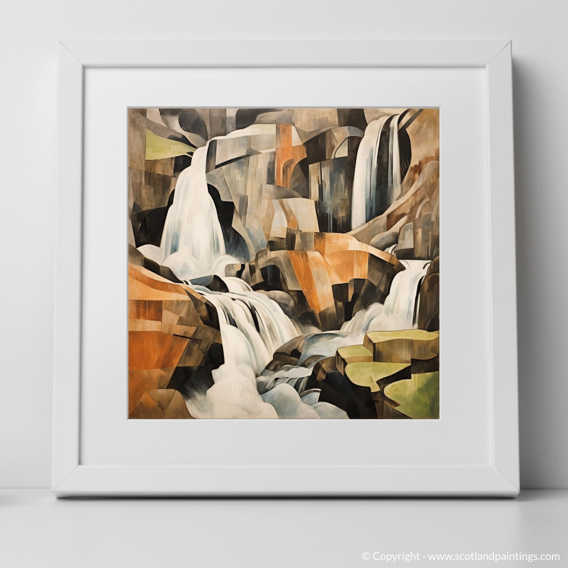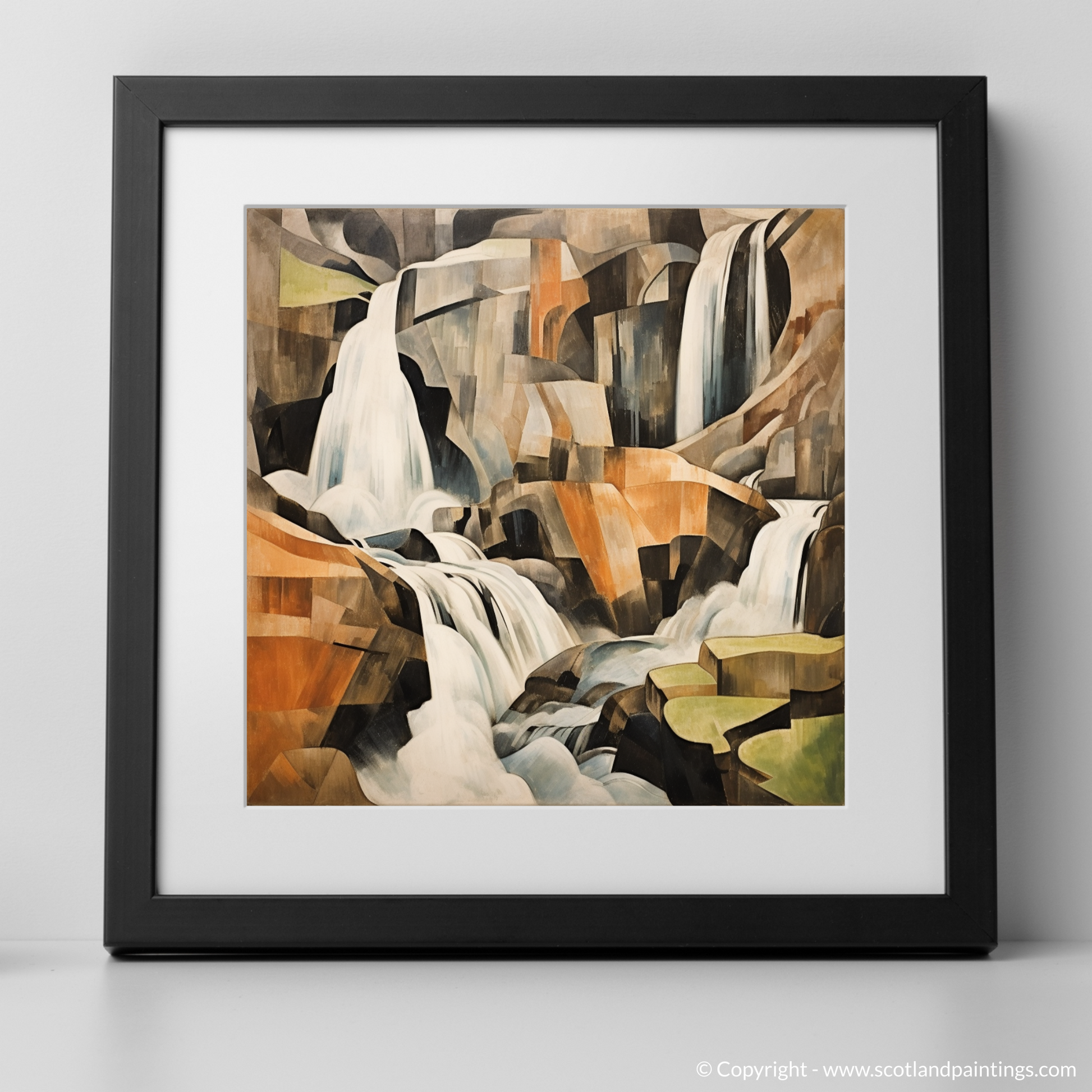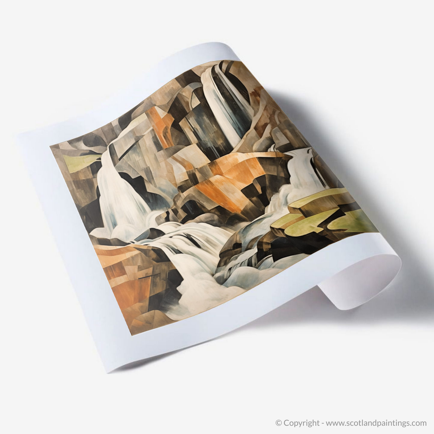 Immerse yourself in the abstract splendour of the Scottish Highlands with this captivating print. An homage to the breathtaking Plodda Falls, this Cubist interpretation deconstructs the fluidity of water and the stoicism of rock into an array of geometric shapes and intriguing forms. Cascading ribbons of azure and white water cut through a tessellation of earth-toned blocks, capturing the movement and vigor of the falls in a novel visual language.