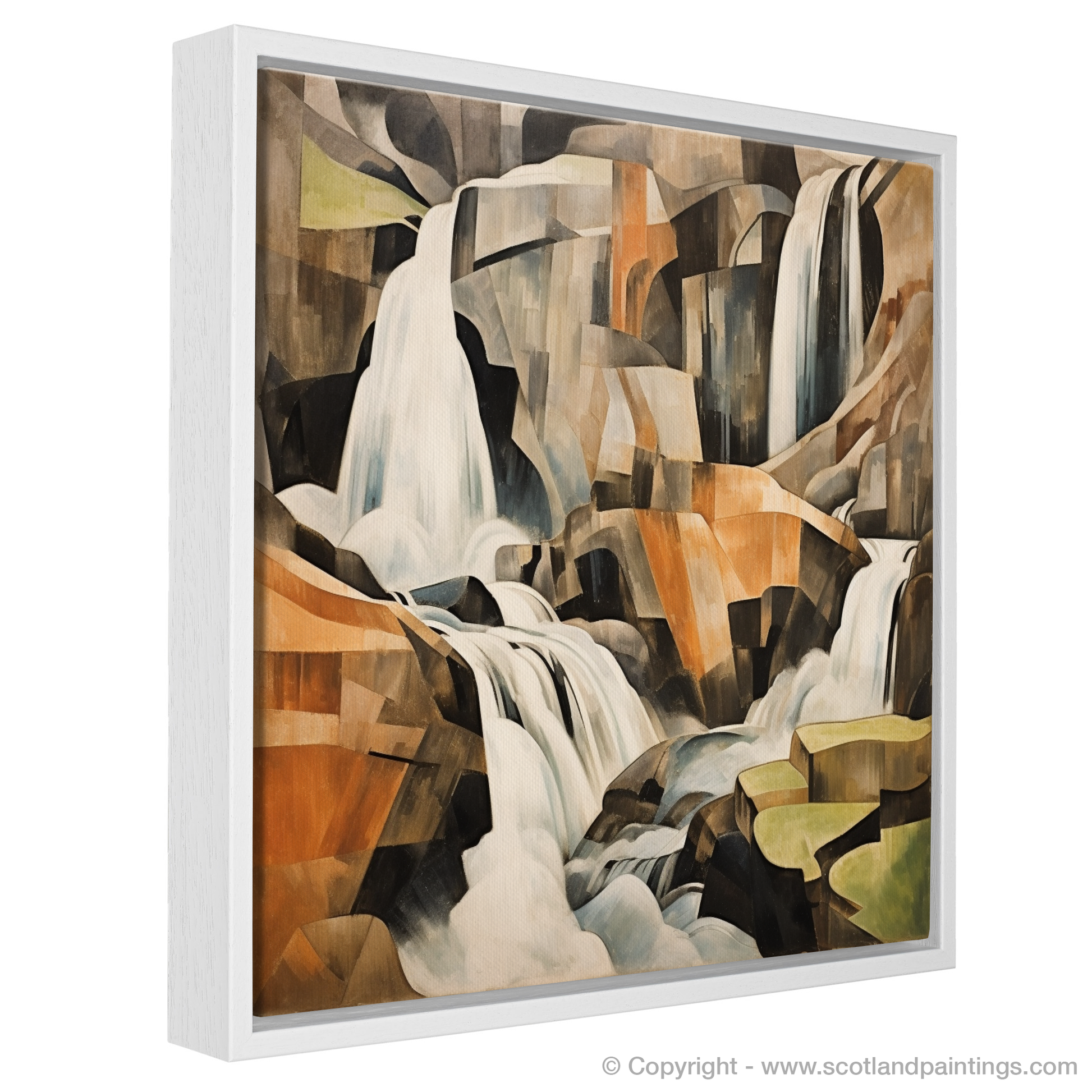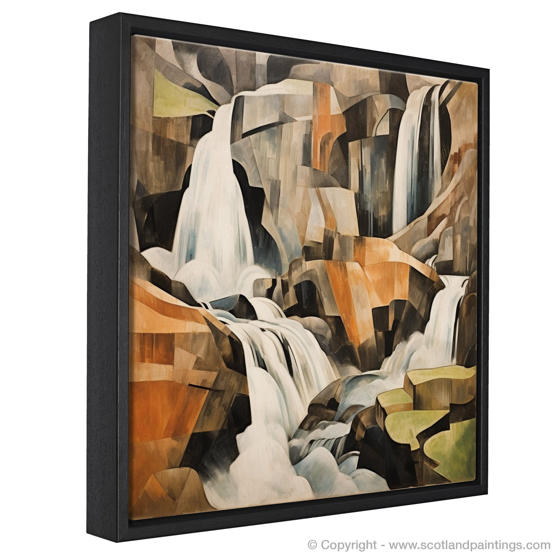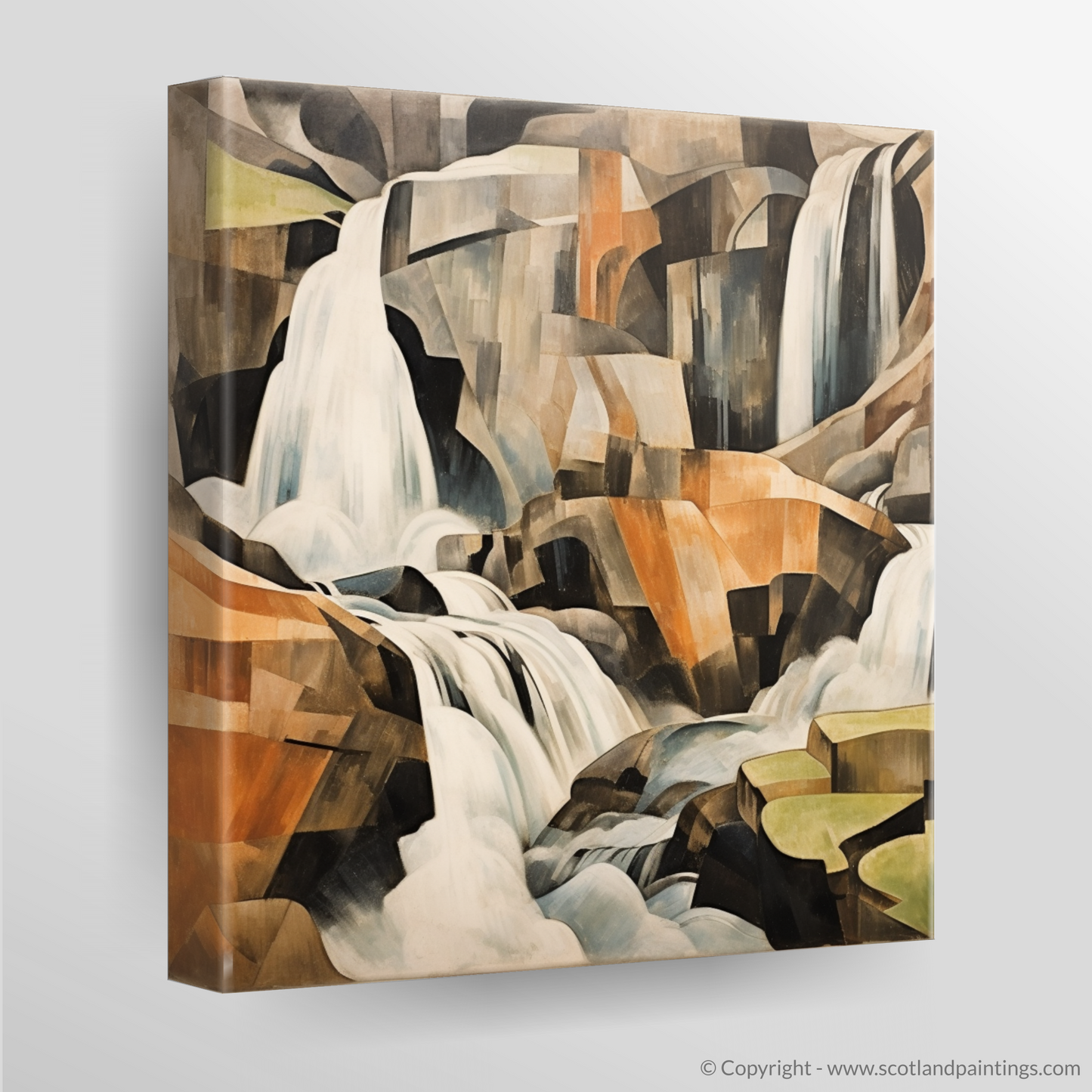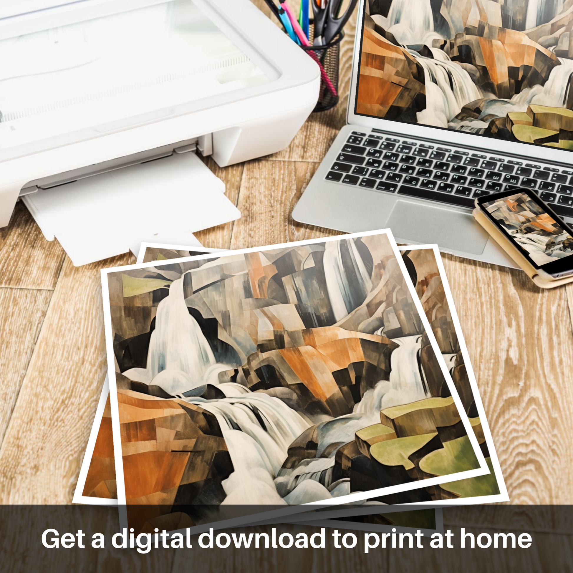 Immerse yourself in the abstract splendour of the Scottish Highlands with this captivating print. An homage to the breathtaking Plodda Falls, this Cubist interpretation deconstructs the fluidity of water and the stoicism of rock into an array of geometric shapes and intriguing forms. Cascading ribbons of azure and white water cut through a tessellation of earth-toned blocks, capturing the movement and vigor of the falls in a novel visual language.