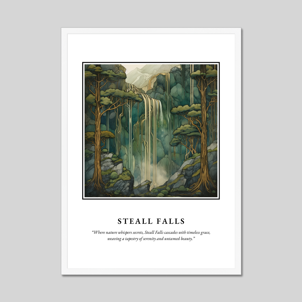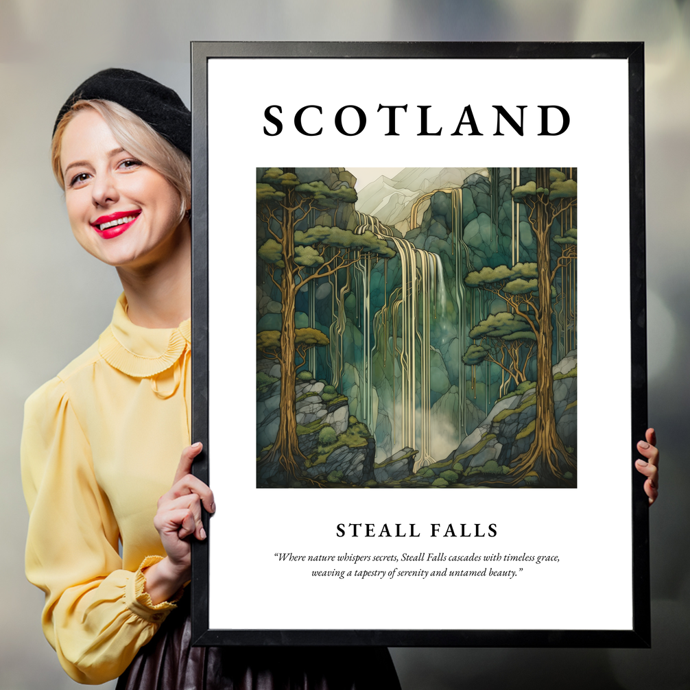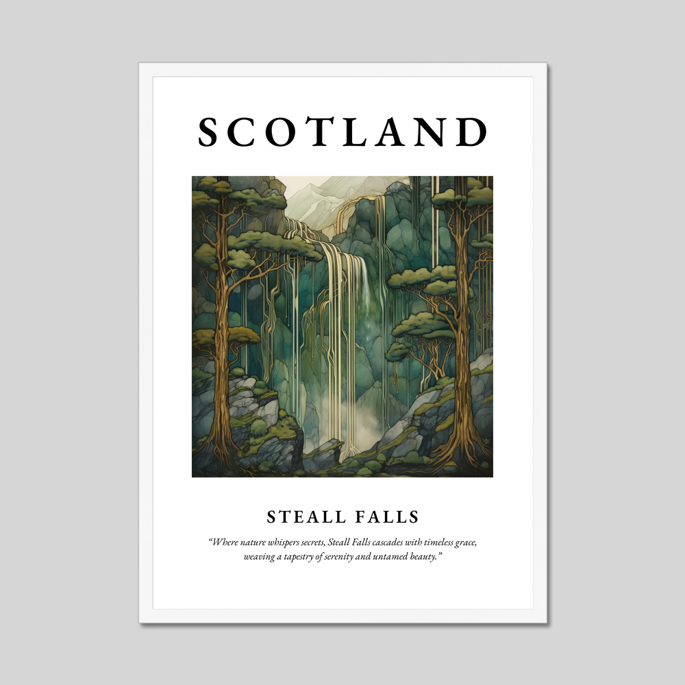 The poster boldly presents “SCOTLAND” at the top, drawing attention to your love for this stunning country. Beneath, the enchanting Art Nouveau style painting captures the ethereal beauty of Steall Falls, where nature's grace is rendered through a harmonious blend of flowing lines and serene palettes. The quote underneath, “Where nature whispers secrets, Steall Falls cascades with timeless grace, weaving a tapestry of serenity and untamed beauty,” perfectly encapsulates the artwork’s serene allure.