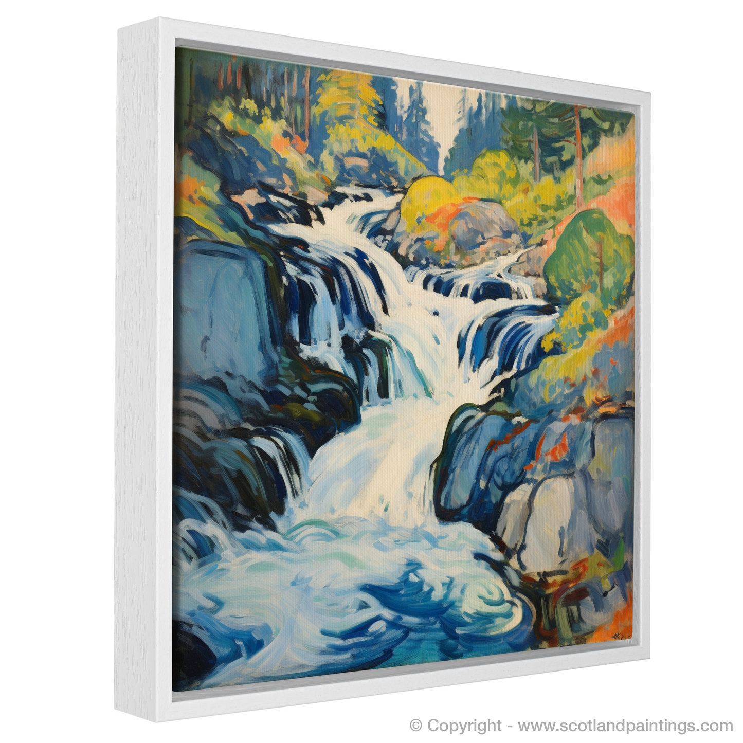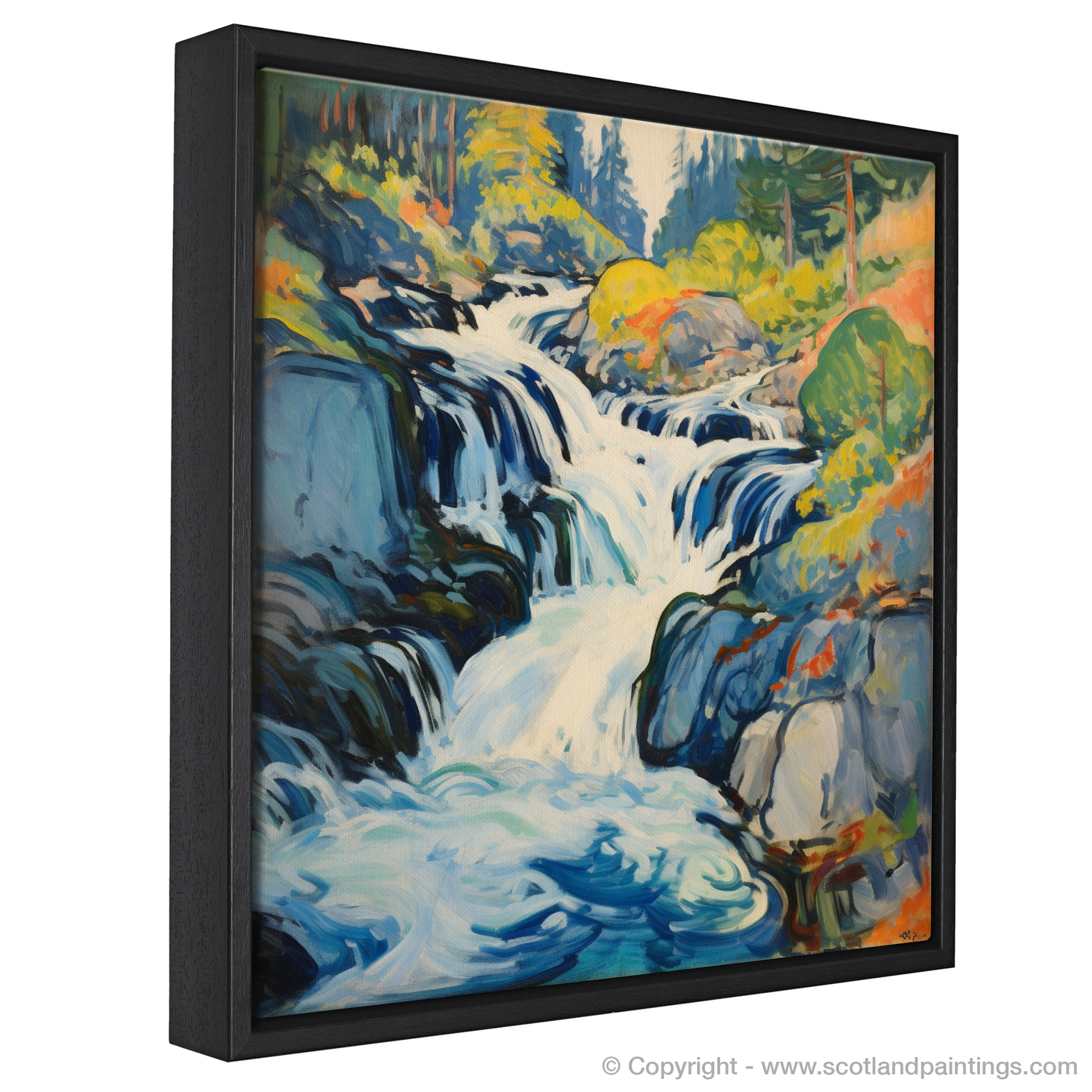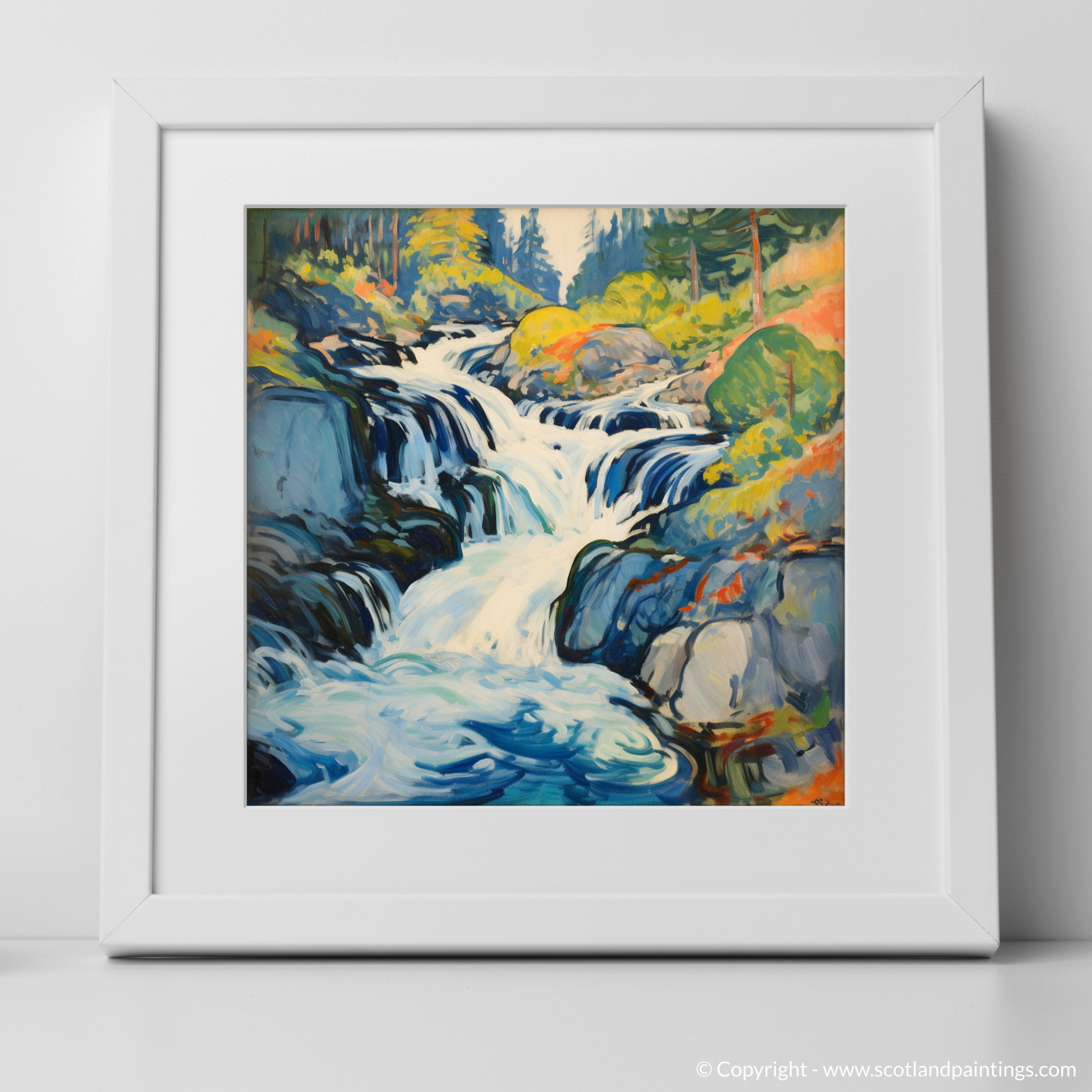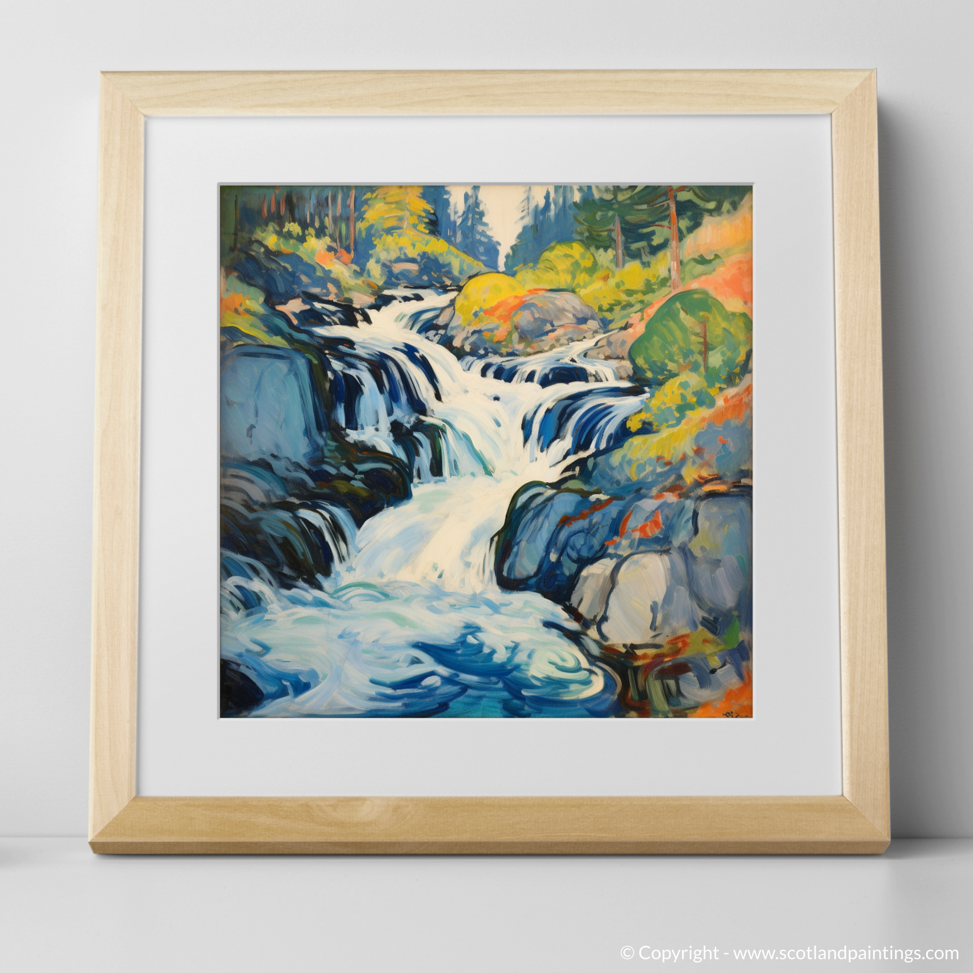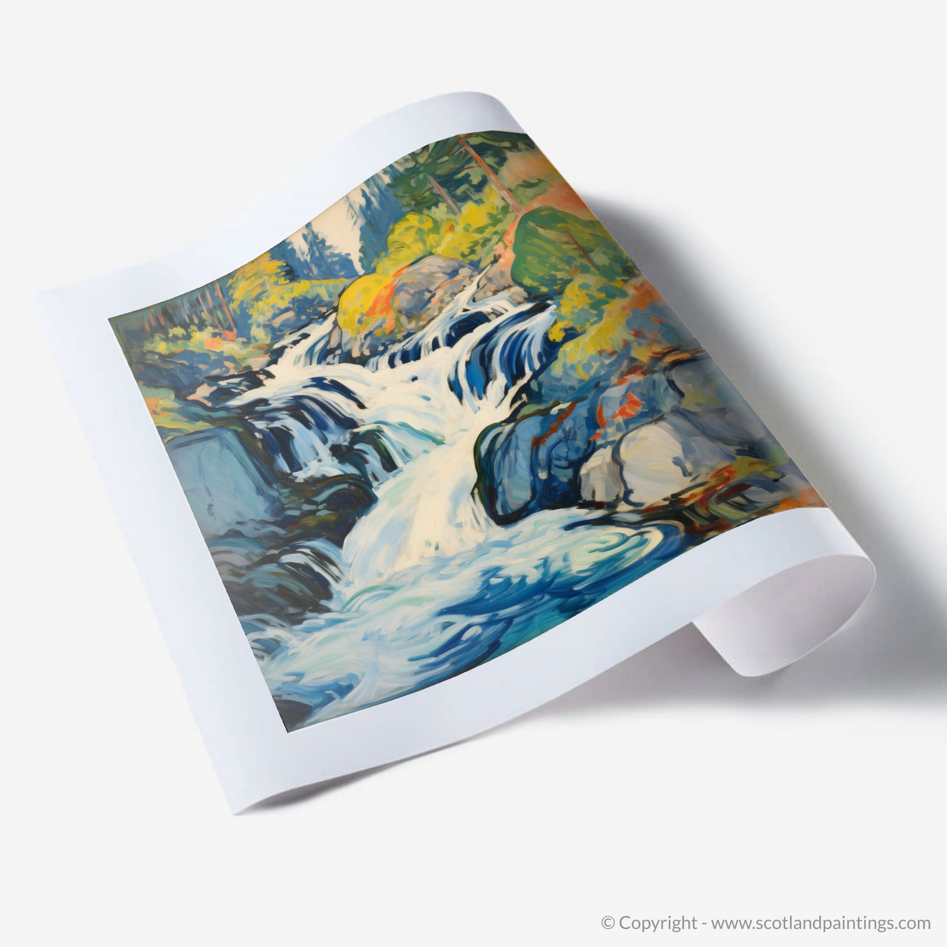 Capturing the raw beauty of the Scottish Highlands, this vibrant print brings the tumultuous energy of Plodda Falls directly into your space. Bold, expressive strokes and a vivid palette evoke the essence of Fauvism, rendering the natural scene with an almost dream-like quality. The cascading water is painted with dynamic whites and blues, contrasting starkly with the dark, imposing rocks that flank the falls. Hues of sunlit yellows, fiery oranges, and lush greens embellish the surrounding foliage, offering a sense of wildness and untamed nature.