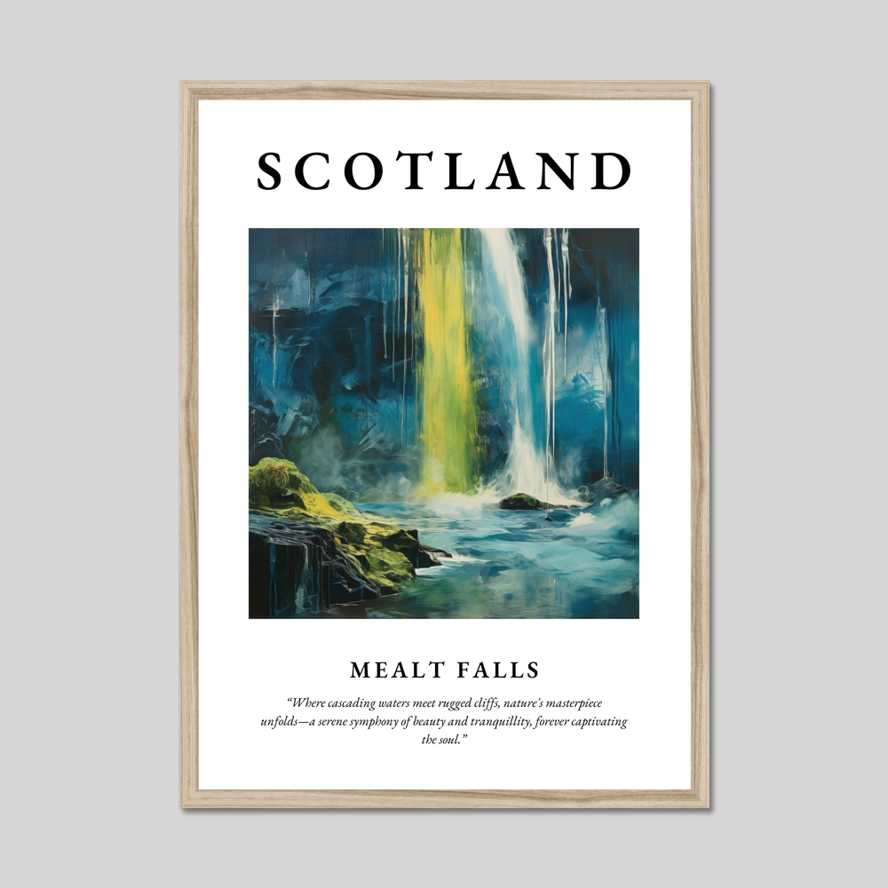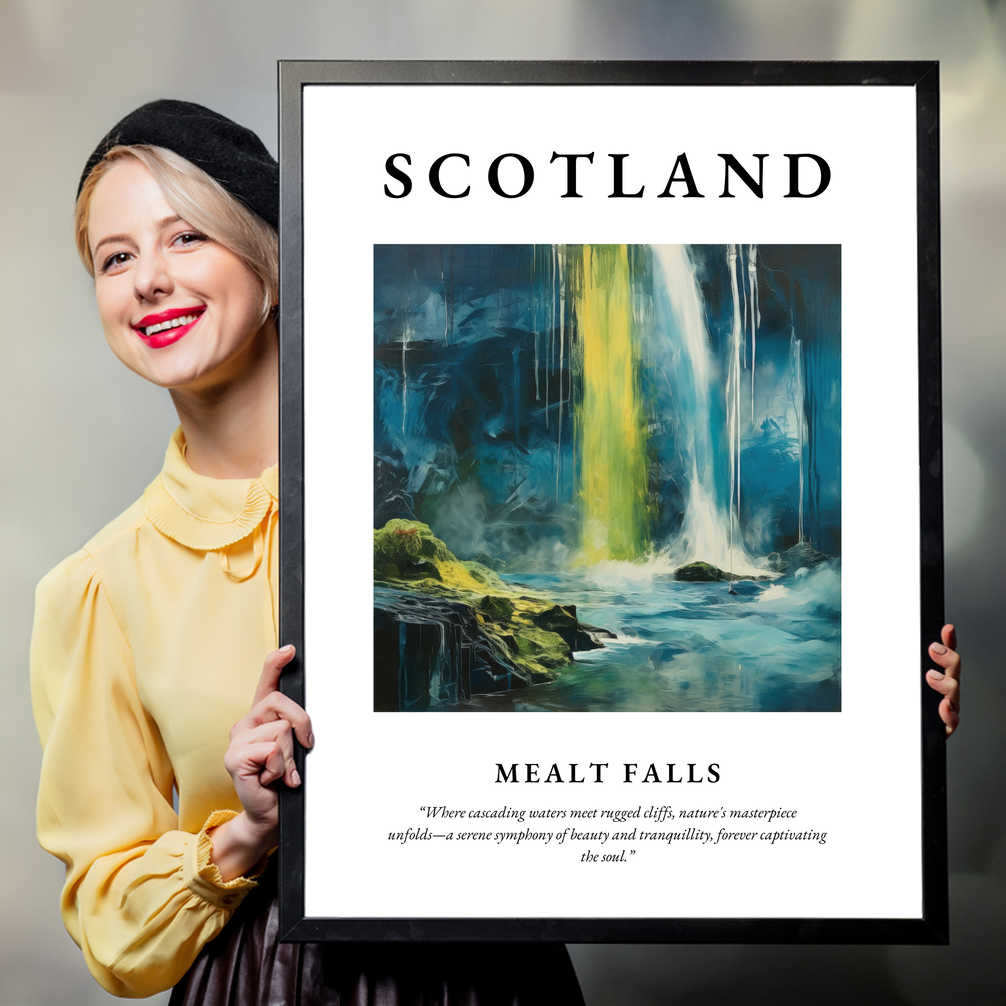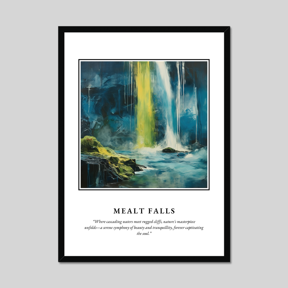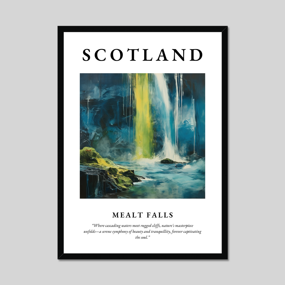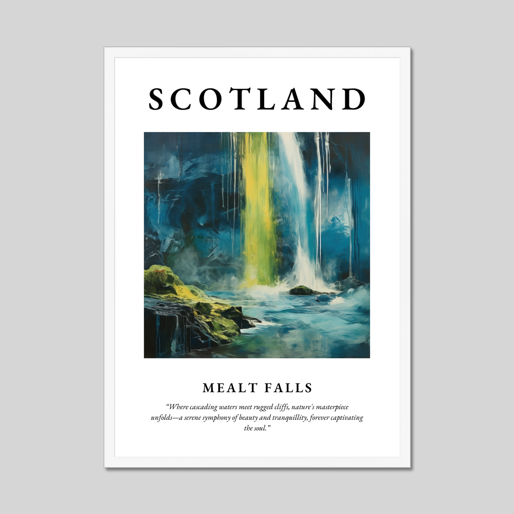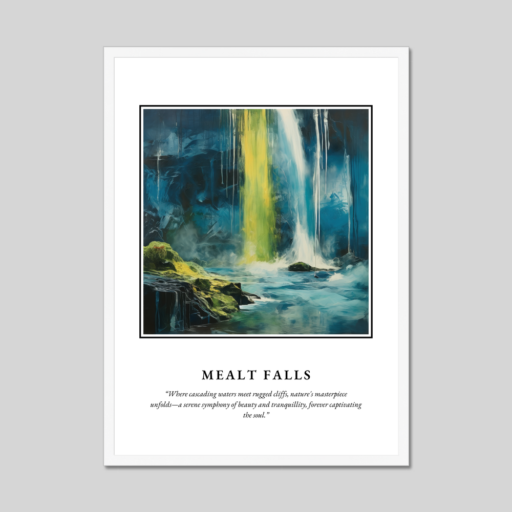 The accompanying quote, “Where cascading waters meet rugged cliffs, nature's masterpiece unfolds—a serene symphony of beauty and tranquillity, forever captivating the soul,” mirrors the painting’s spirit, inviting anyone who has visited Mealt Falls, or dreams of doing so, to recall the awe-inspiring landscape. Perfect for art lovers and admirers of Scottish landscapes alike, this poster stands as a testament to the sublime elegance of nature.