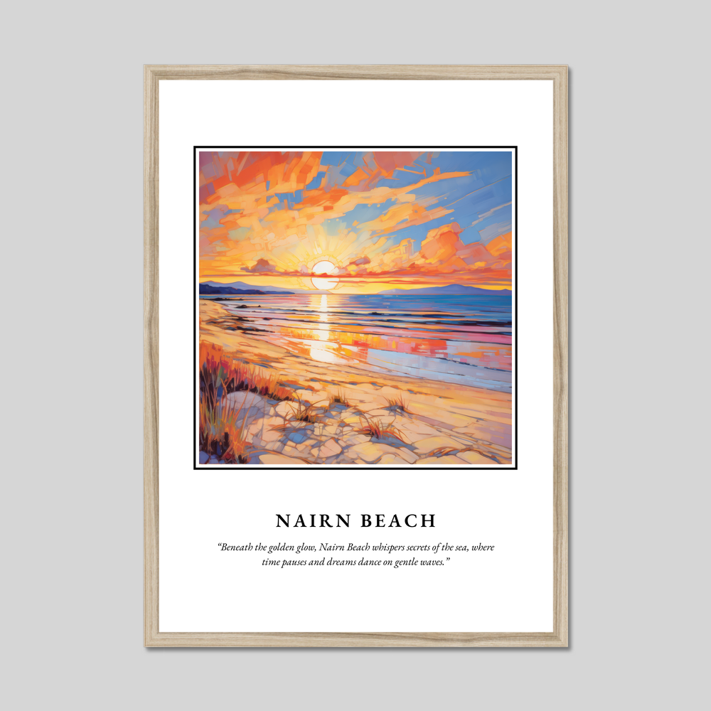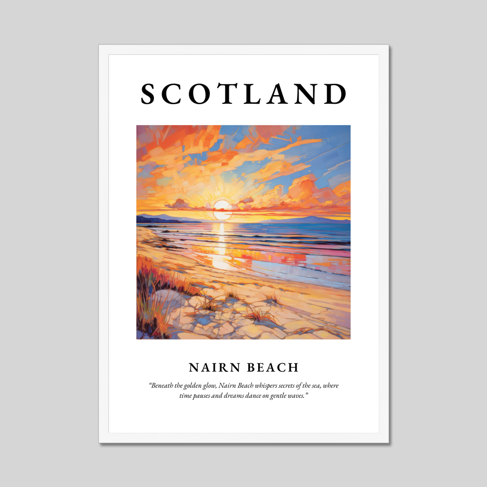 Transform your space with this stunning 50cm x 70cm framed poster print, available in elegant black, classic white, or natural wood-effect finishes. This captivating piece from our “Scottish Beaches” collection combines the majesty of the word “SCOTLAND” in bold lettering with an ethereal painting of Nairn Beach. Below the artwork, the quote “Beneath the golden glow, Nairn Beach whispers secrets of the sea, where time pauses and dreams dance on gentle waves” invites viewers into the serene mystery of this enchanting landscape.