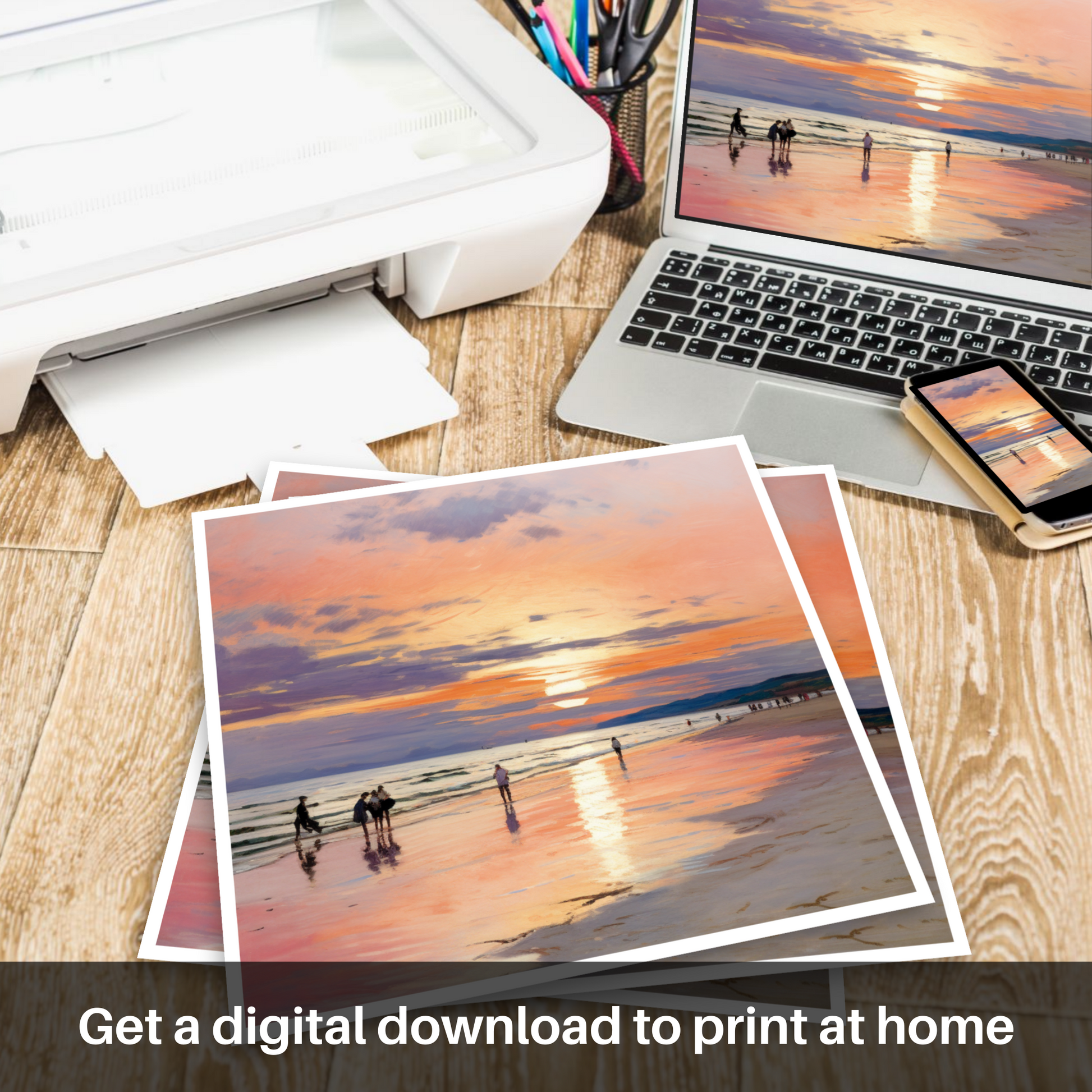 Allow your walls to whisper tales of the serene Scottish coast with our exquisite print capturing the transient beauty of Nairn Beach bathed in the warm glow of sunset. The delicate dance of light and colour in this Impressionist-inspired piece transforms the ordinary into the extraordinary, offering a glimpse of Scotland's natural elegance.