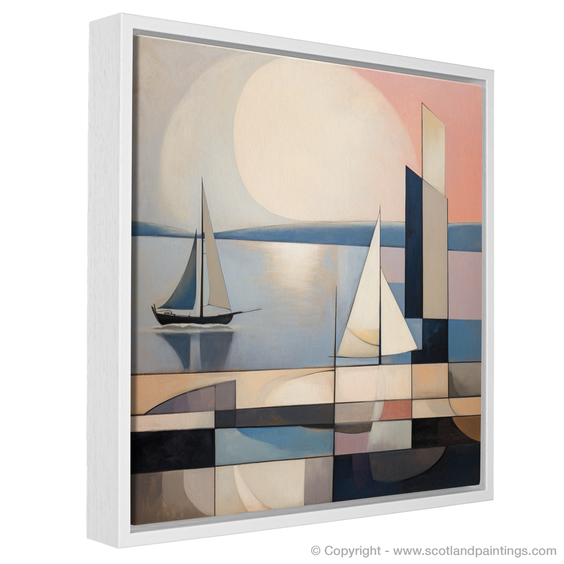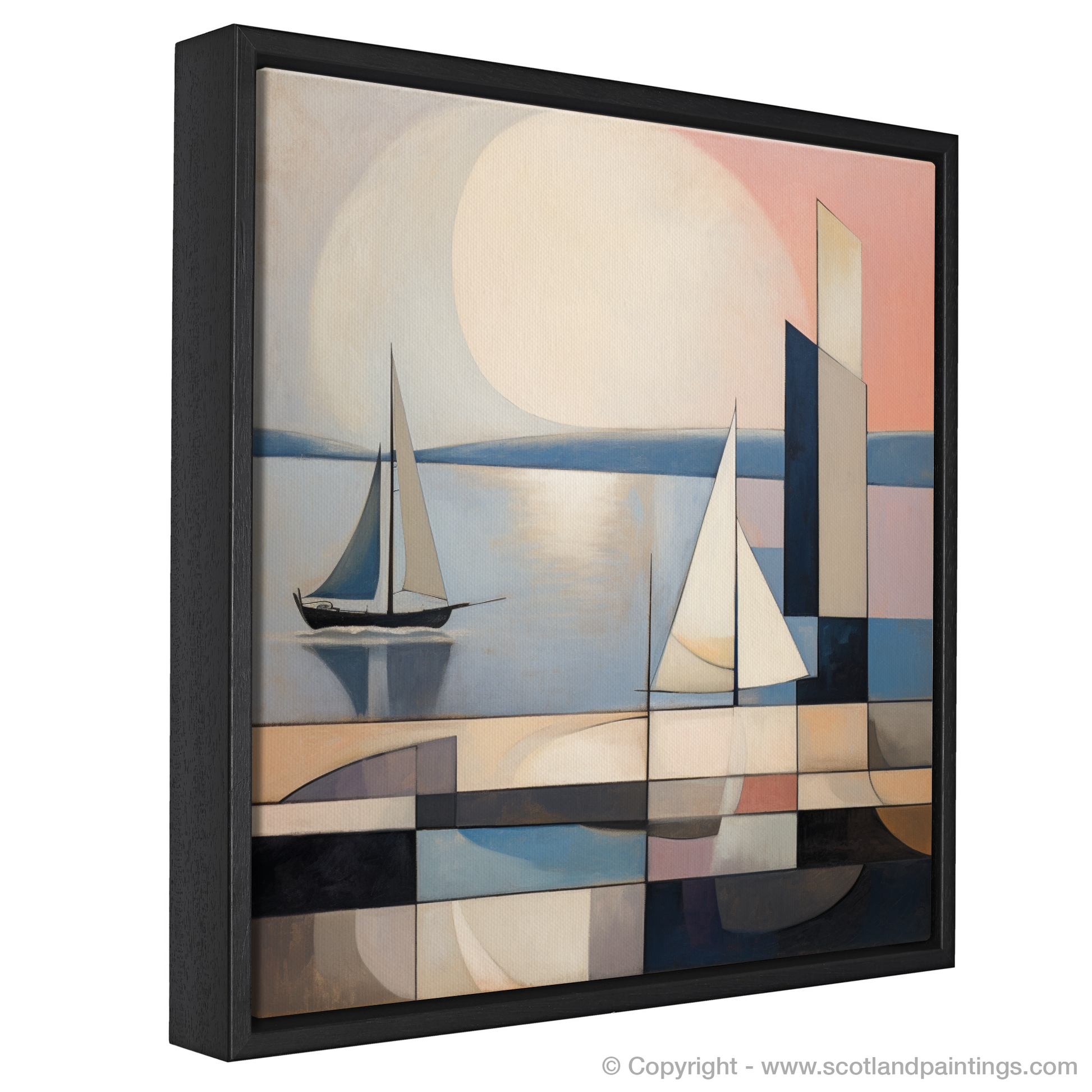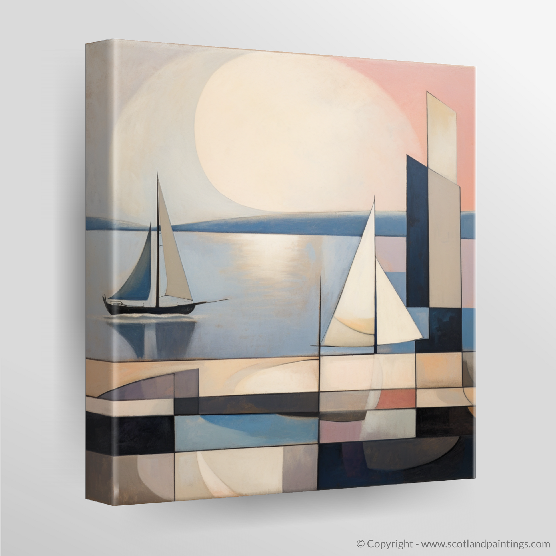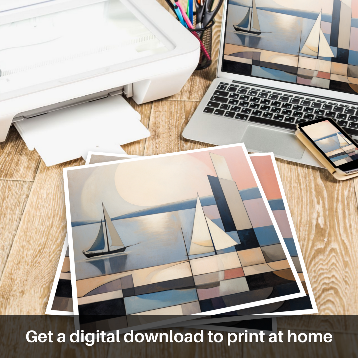 At the heart of the artwork, two sailboats with angular sails glide serenely across the still waters. Their reflections, distorted by the cubist lens, ripple gently upon the sea's surface, adding a sense of peaceful movement. The setting sun, reimagined as a giant orb that dominates the upper canvas, casts a dreamlike illumination that blurs the distinction between the tangible and the imagined.