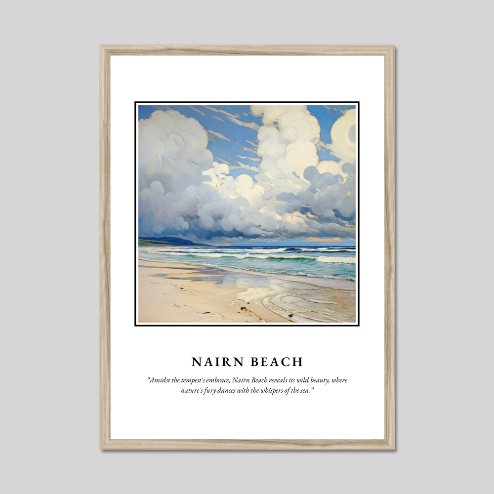 The poster is part of our exclusive “Scottish Beaches” collection, making it a perfect gift for anyone with fond memories of the Scottish coast, a deep appreciation for the Art Nouveau style, or simply a love for the wild allure of nature. The bold "SCOTLAND" emblazoned at the top sets the stage for the breathtaking painting below, where rolling waves meet expansive skies. Beneath, the evocative quote captures the essence of Nairn Beach: “Amidst the tempest's embrace, Nairn Beach reveals its wild beauty, where nature's fury dances with the whispers of the sea.”