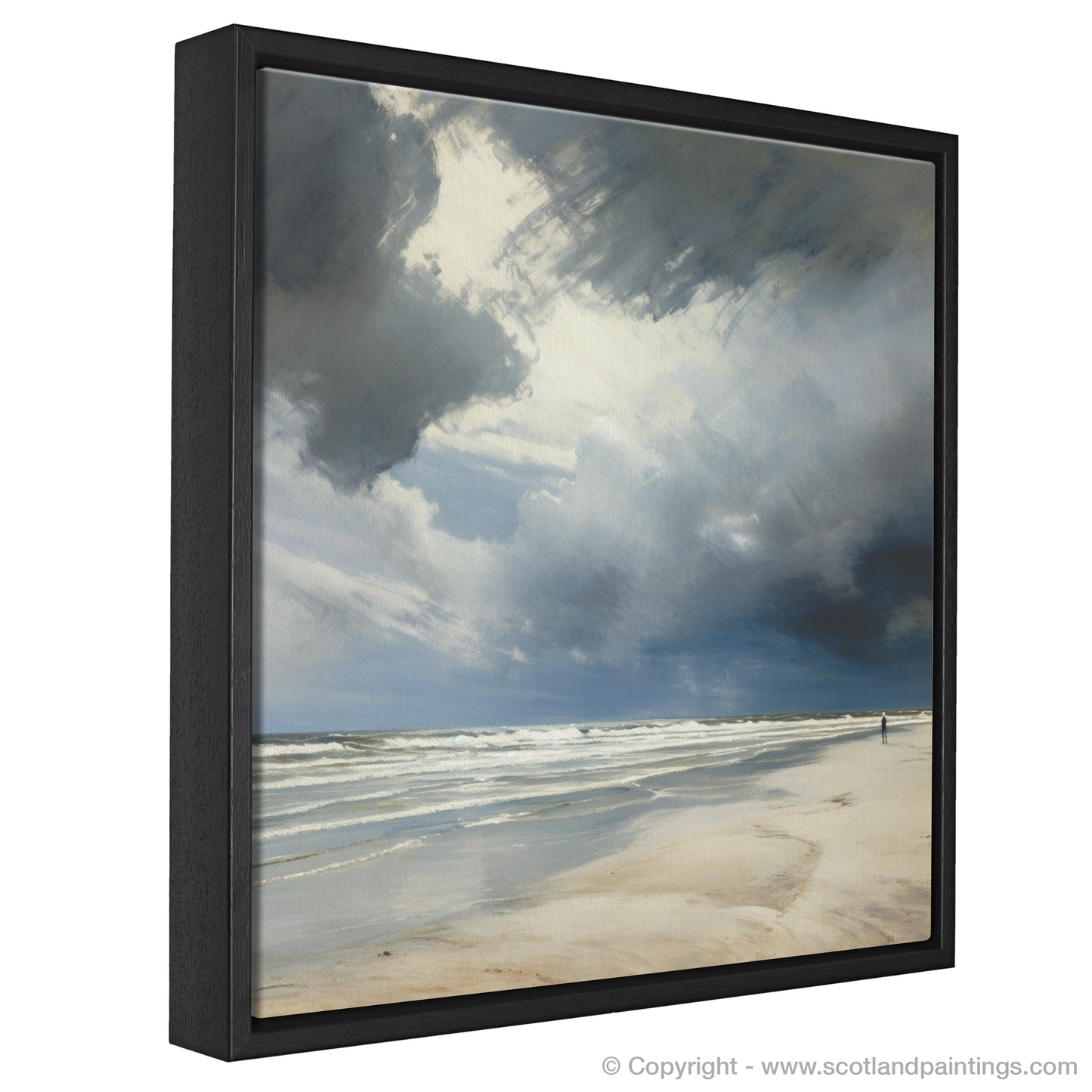 A solitary figure stands at the water's edge, dwarfed by the vastness of nature, adding a poignant touch to the composition, emphasizing the scale and grandeur of the Scottish beach under the theatrics of a gathering storm. Look closely, and you'll notice that the sand appears nearly luminescent, as though it still holds the echoes of sunlight, acting as the perfect contrast to the overall moody tone of the setting.