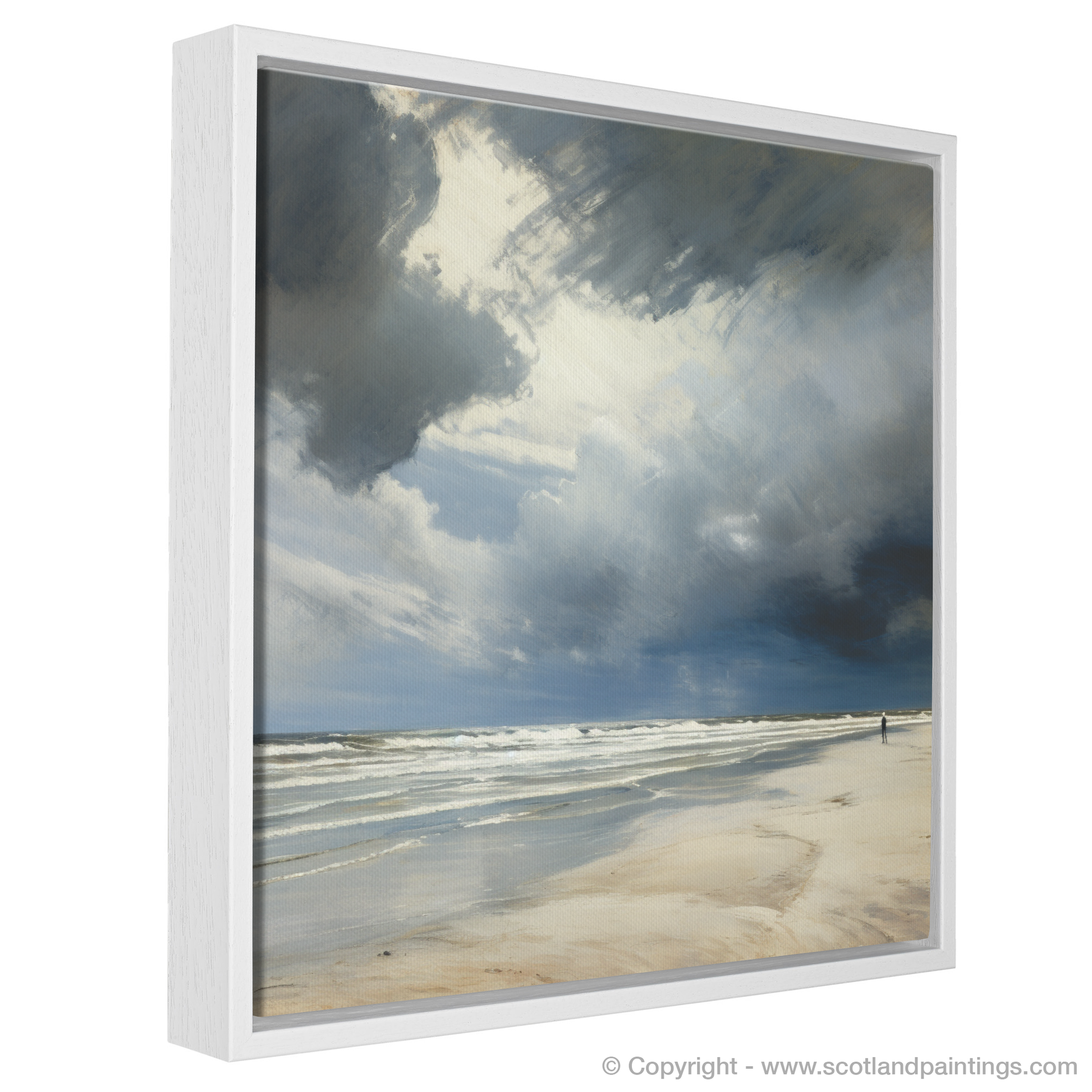 Capturing the brooding magnificence of Scotland's shoreline, this evocative print offers viewers a glimpse into the dramatic and atmospheric landscape synonymous with Nairn Beach. The piece masterfully depicts a stormy sky hanging heavily above the rolling waves, where tones of slate grey, cobalt, and hints of white blend seamlessly to create a tempestuous overhead panorama.