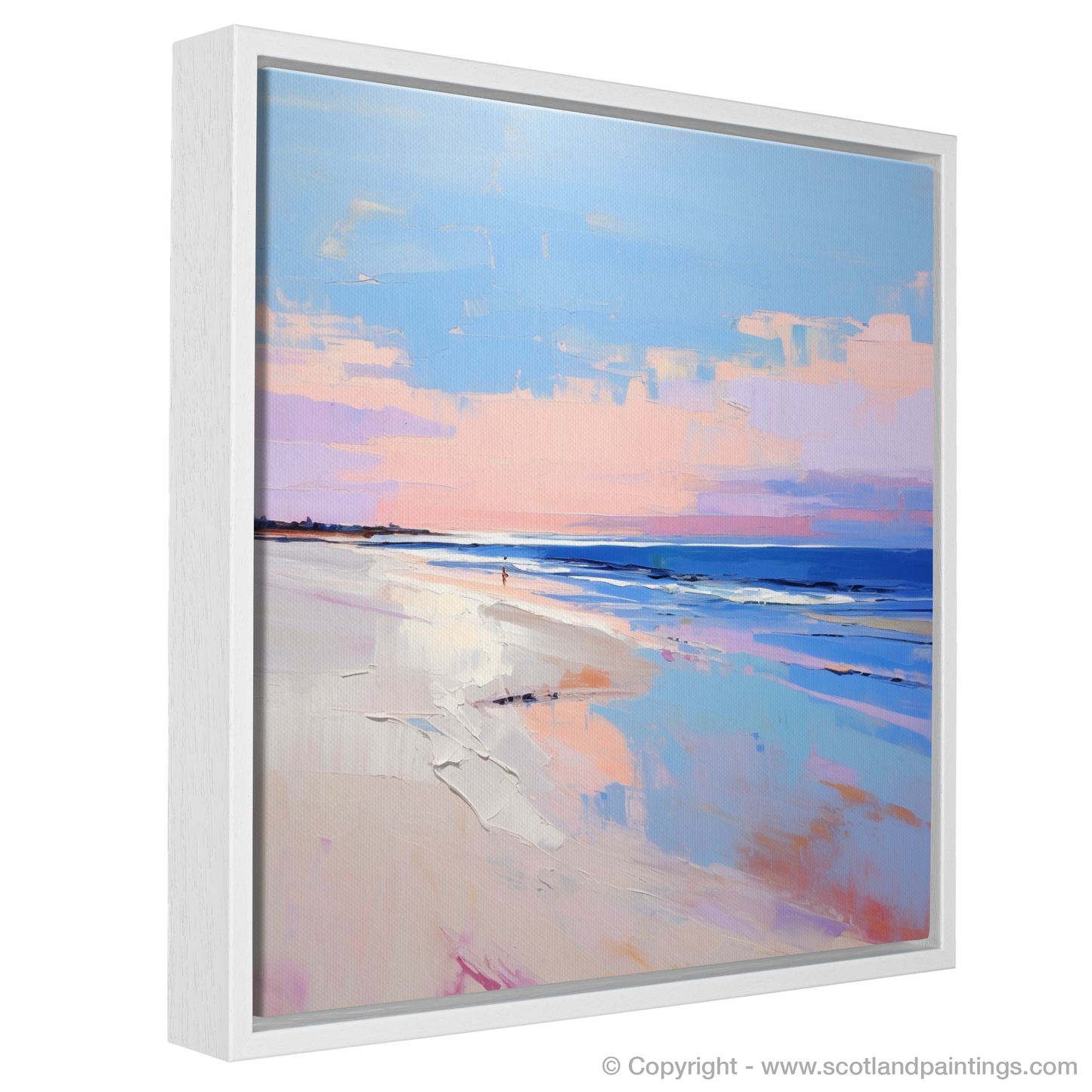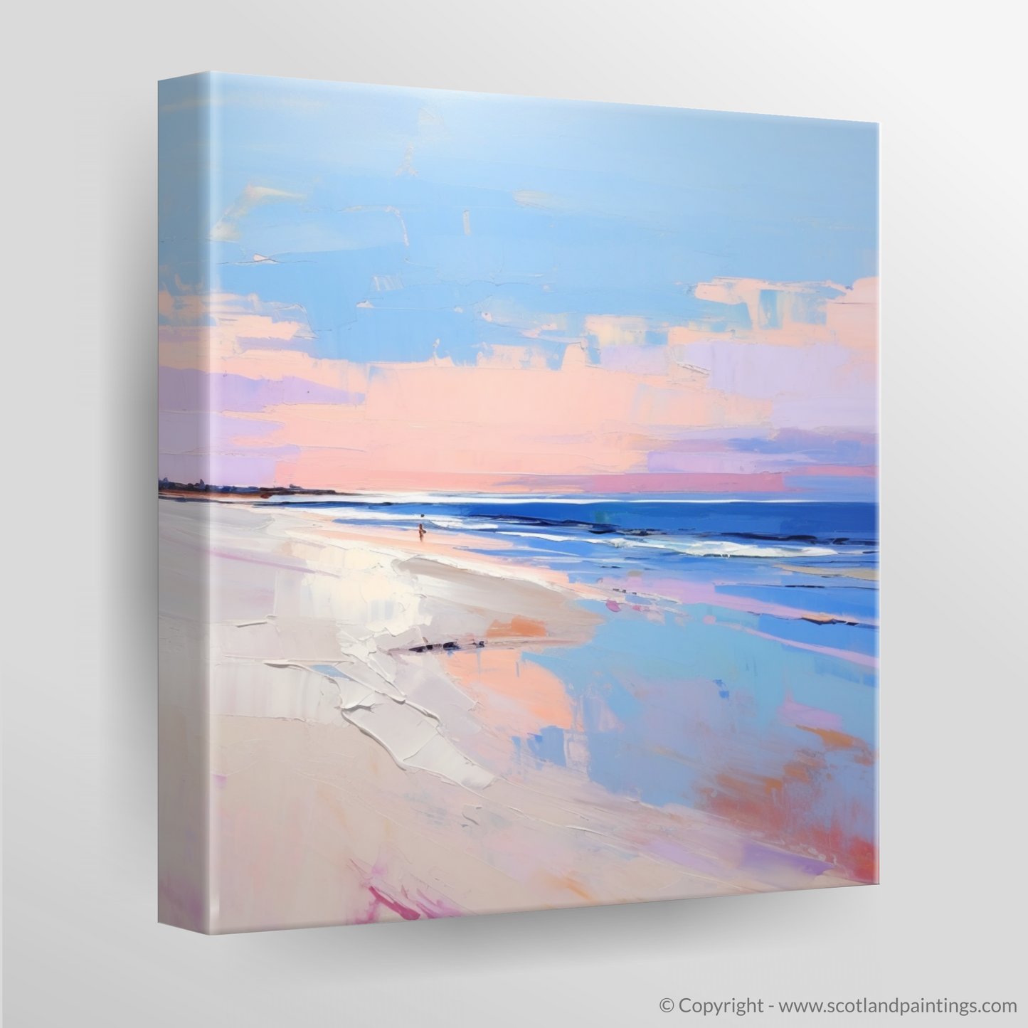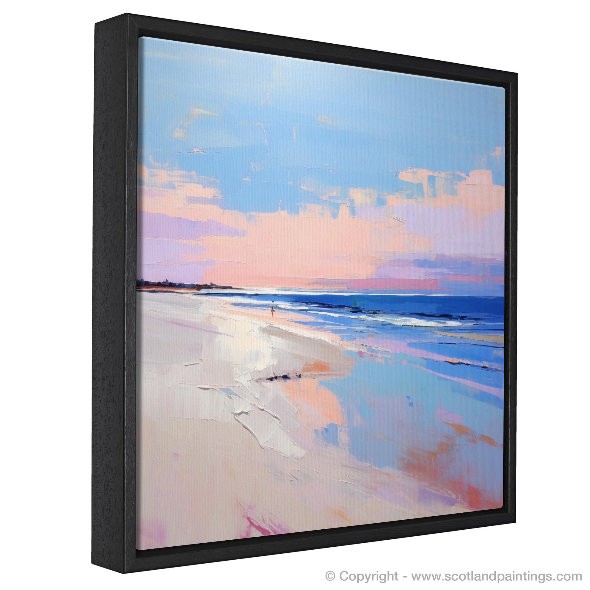 As the day wanes into twilight, the hues of Nairn Beach are perfectly captured in this evocative contemporary print. The tranquillity of a Scottish evening is distilled onto canvas, with soft pinks and warming lavenders melting into the horizon, interlacing with cool blues that mirror the gentle undulation of the waves. This piece expertly reflects the beauty of dusk as it swathes the beach in a choir of serene colours, inviting viewers to bask in the reflective glow of the water's surface.