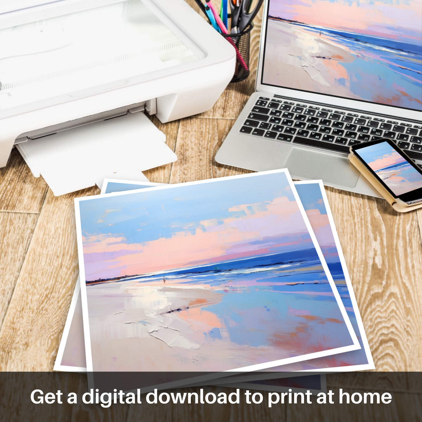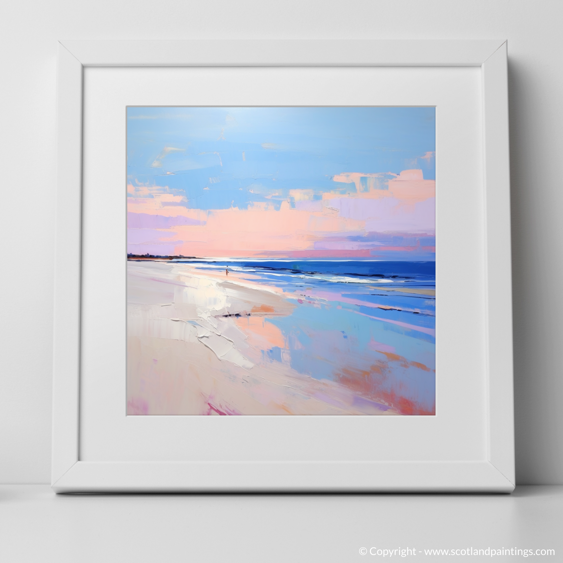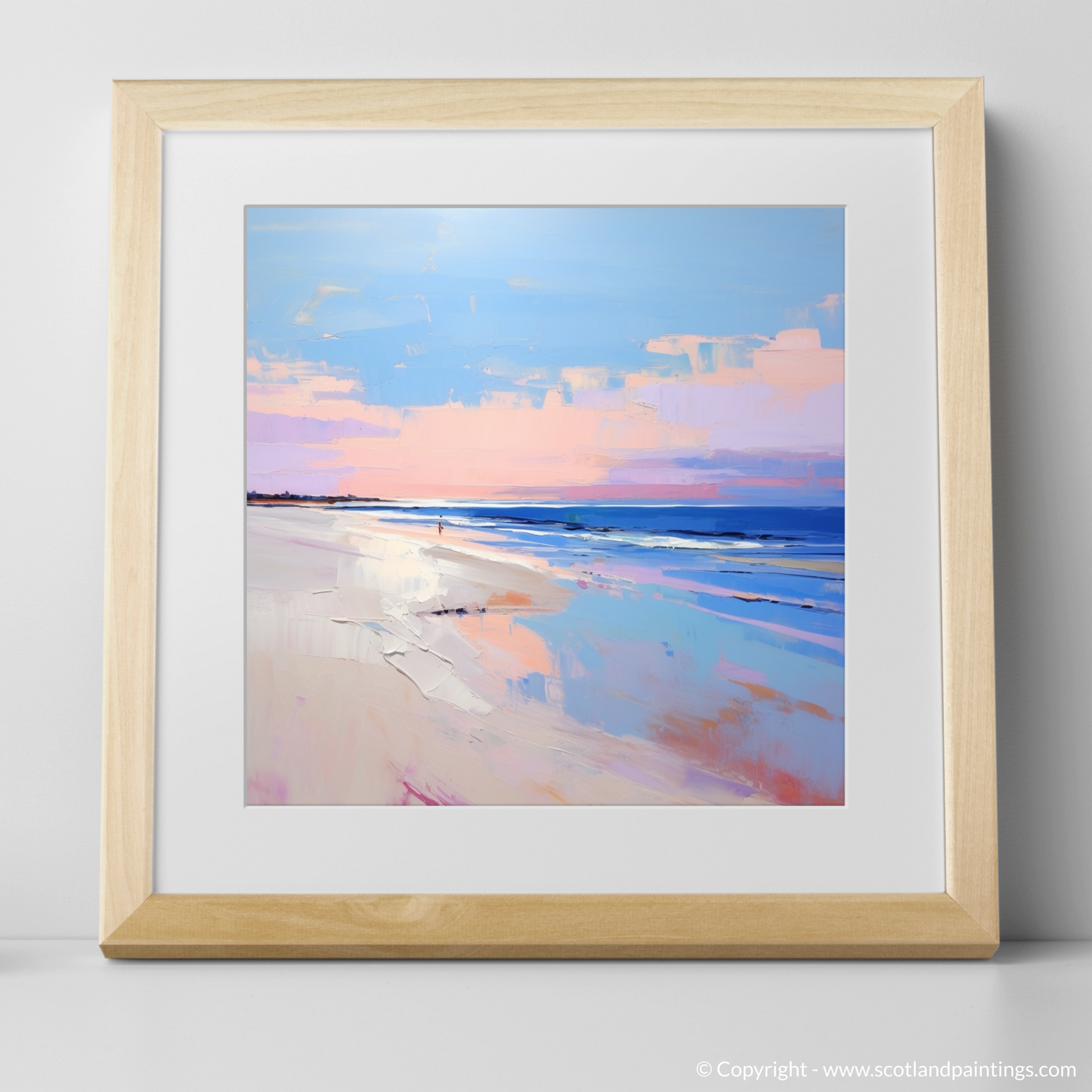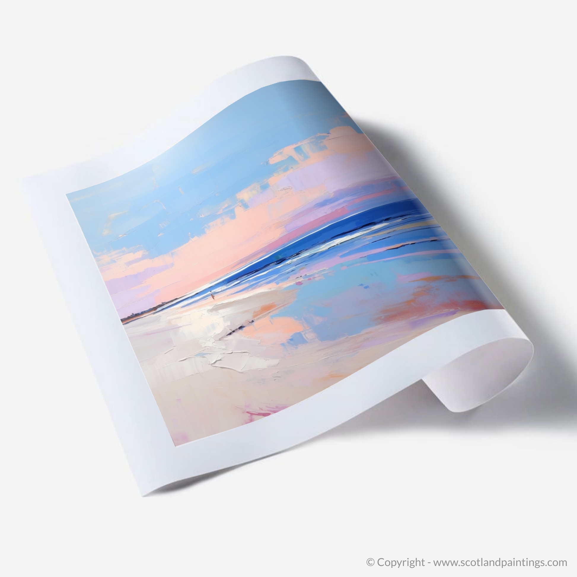 This print, a culmination of serene palettes and contemporary expression, belongs to our 'Scottish Beaches' collection. It is not just a visual treat but an echo of serenity for any space it graces, evoking the peaceful solitude of Nairn Beach at its most enchanting hour.