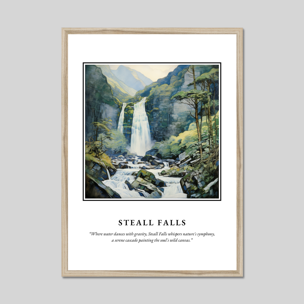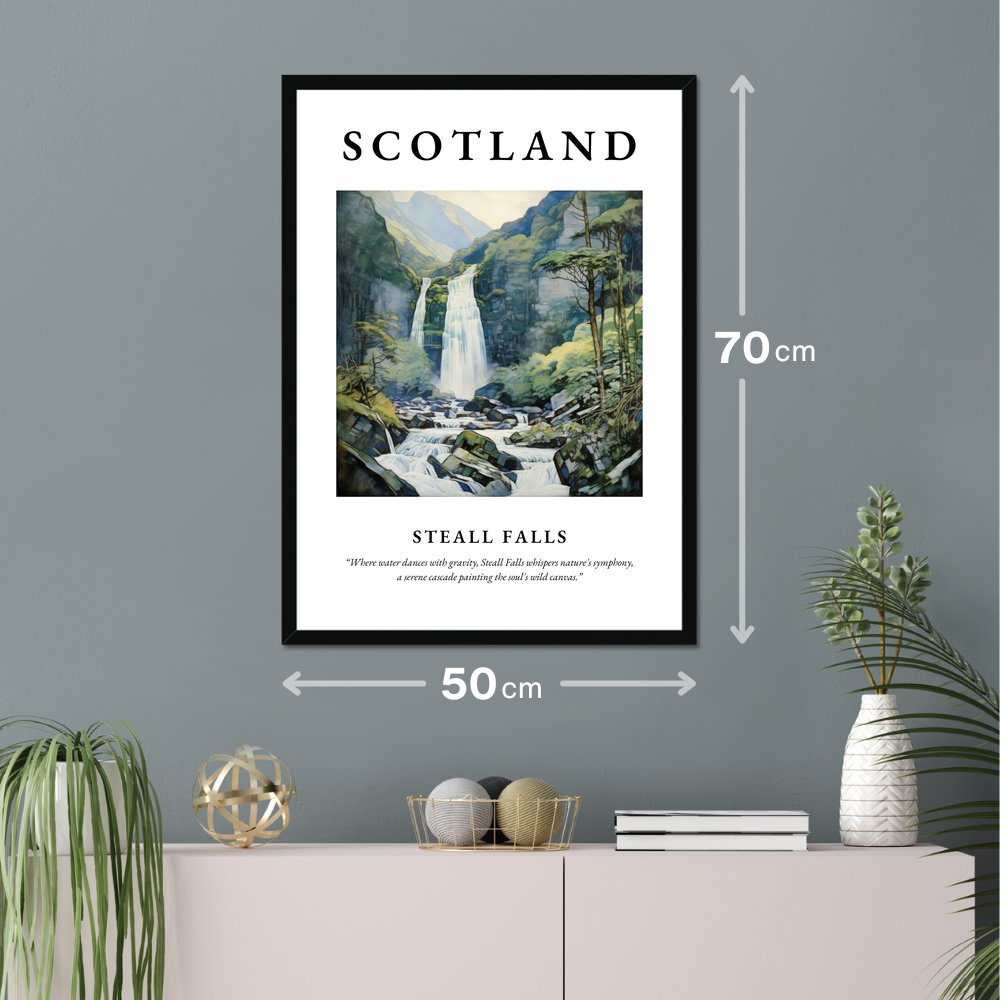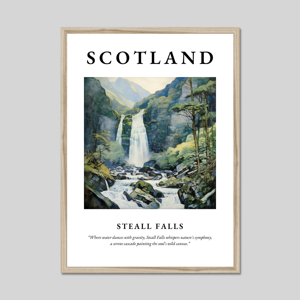 Immerse yourself in the enchanting allure of Scotland with our framed poster print, a stunning homage to the majestic Steall Falls. Measuring an impressive 50cm x 70cm, this piece not only transforms your space but invites the serene beauty of Scottish landscapes into your home. Available in black, white, or natural wood-effect frames, it harmoniously complements any interior décor.
