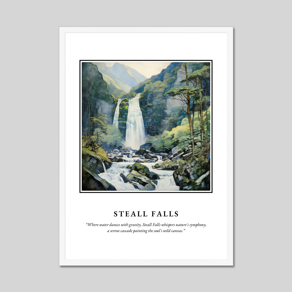 Steall Falls, nestled in Glen Nevis near Fort William, is Scotland's second highest waterfall and a cherished natural wonder. Known for its breathtaking surroundings, the Falls are a haven for walkers and adventurers alike. The gentle roar of the water as it plummets 120 metres into the lush valley below creates an ambience unlike any other—a spirit captured beautifully in our poster.