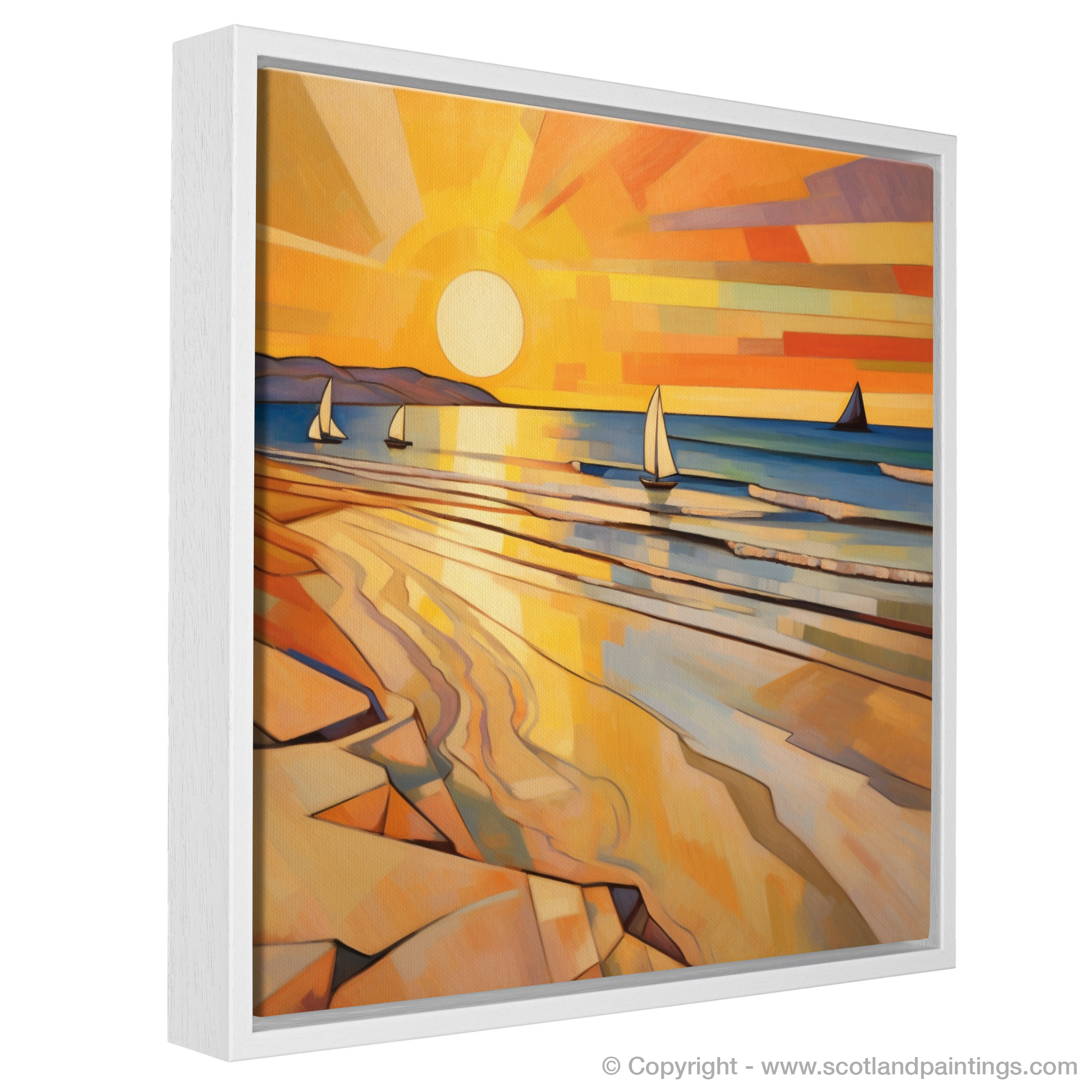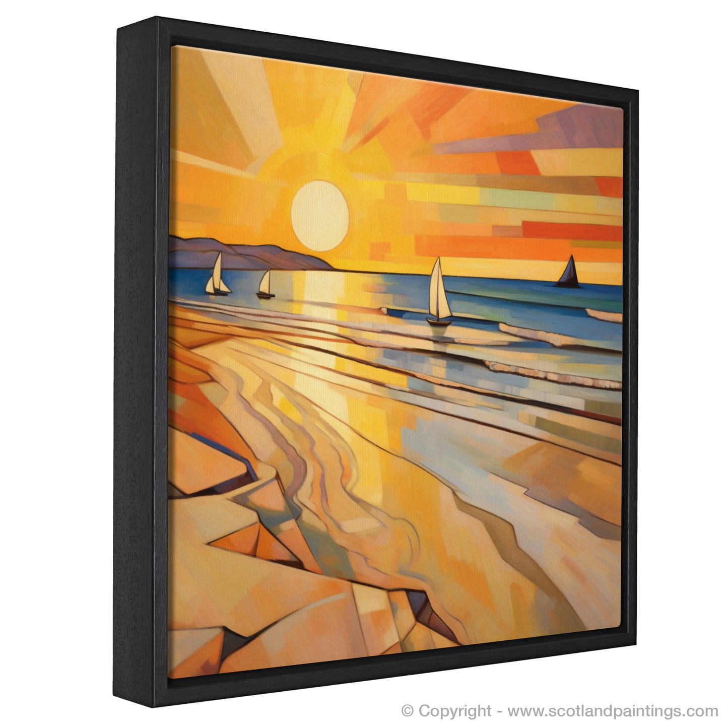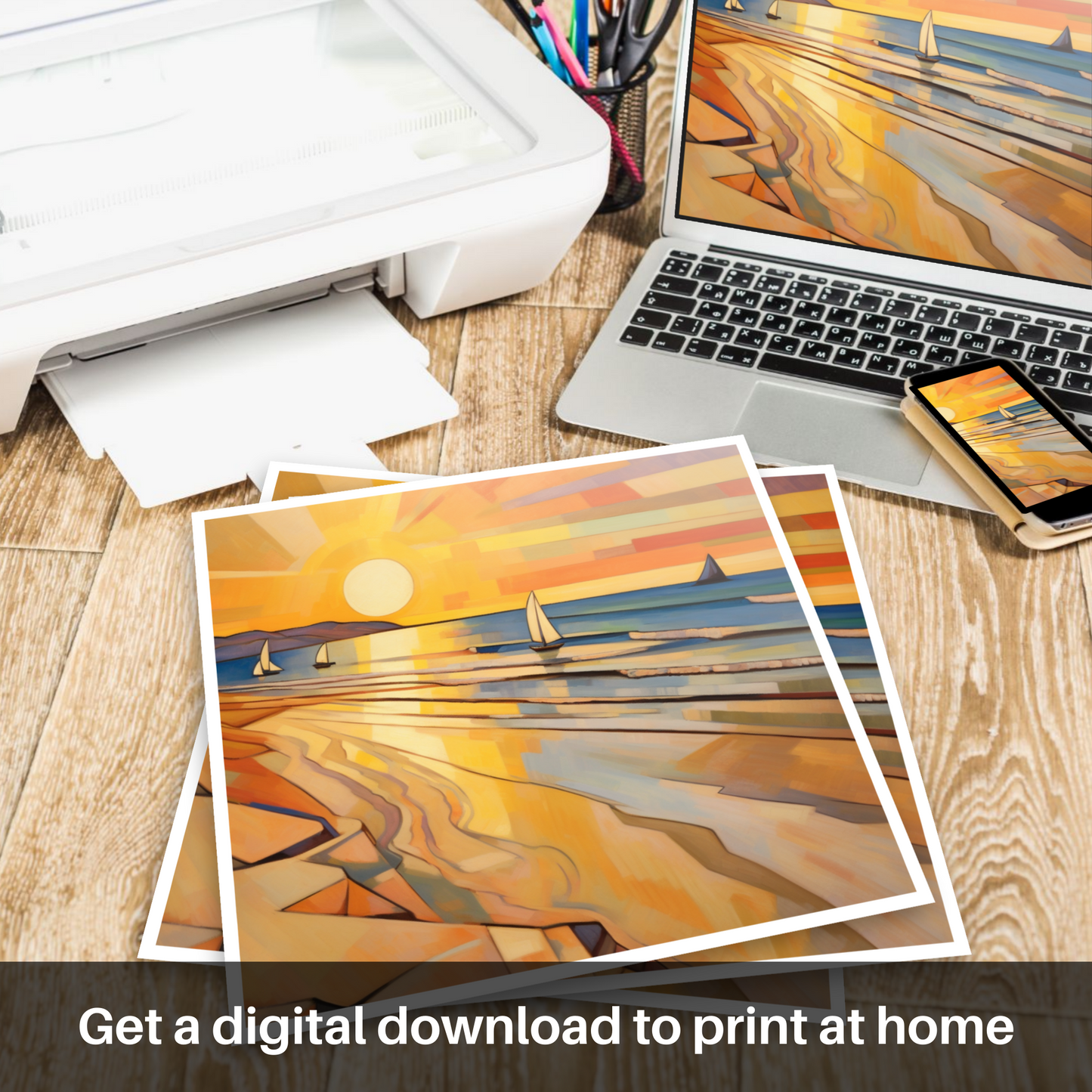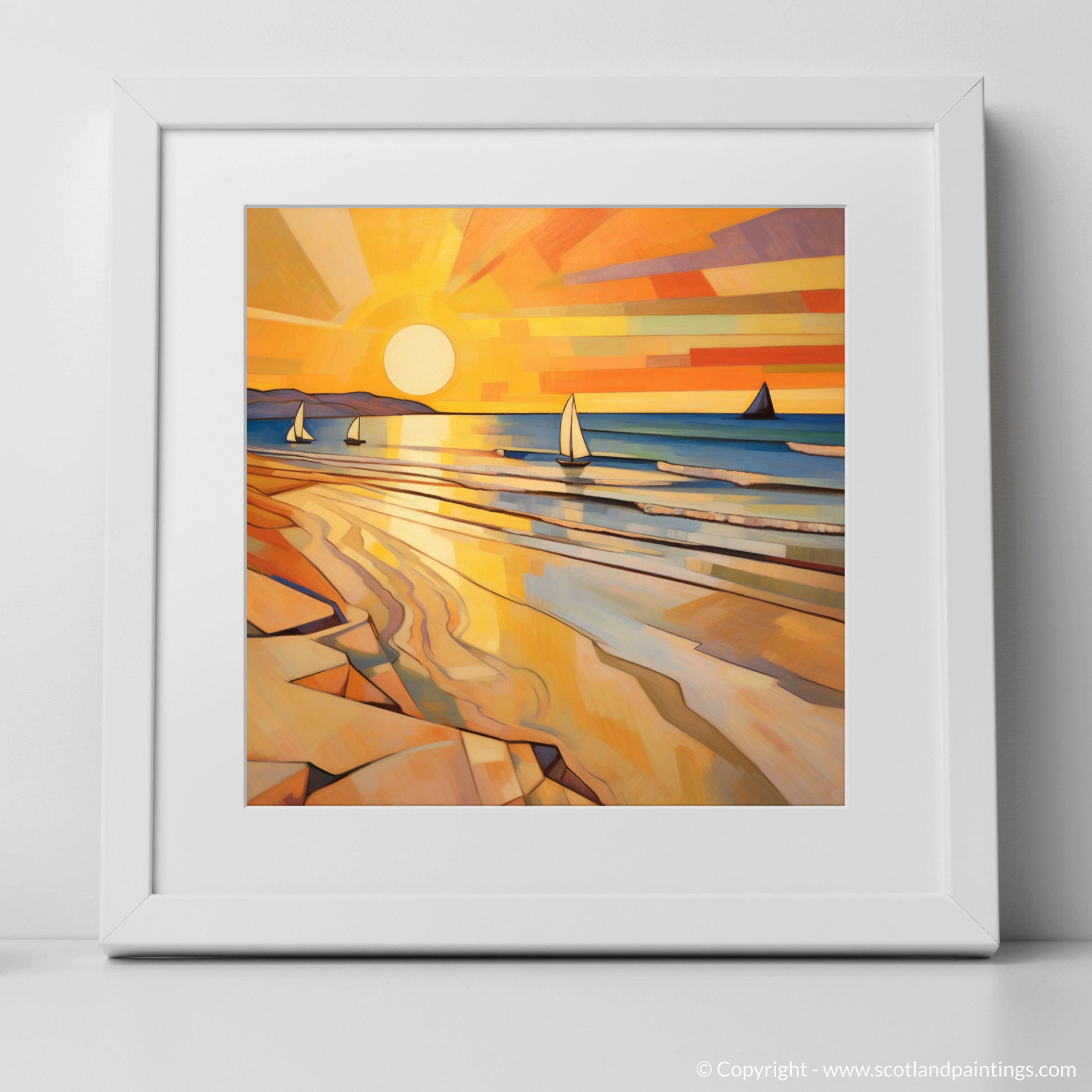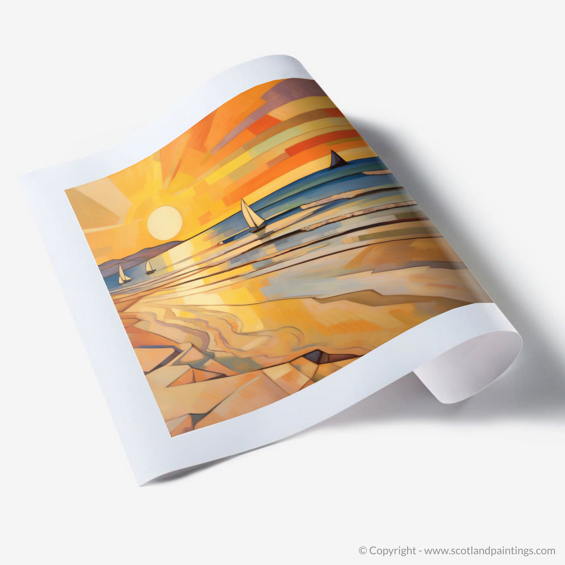 Immerse yourself in the fractured beauty of Nairn Beach as captured at the tranquil moment of sunset, with this distinctive cubist-inspired print that weaves together the Scottish shoreline in bold, geometric abstraction. Bask in the warmth emanating from the golden hues of the horizon, where a spectacular sun dips into the cool, serene blues of the sea, delineating a dazzling dance of light across the water's surface.