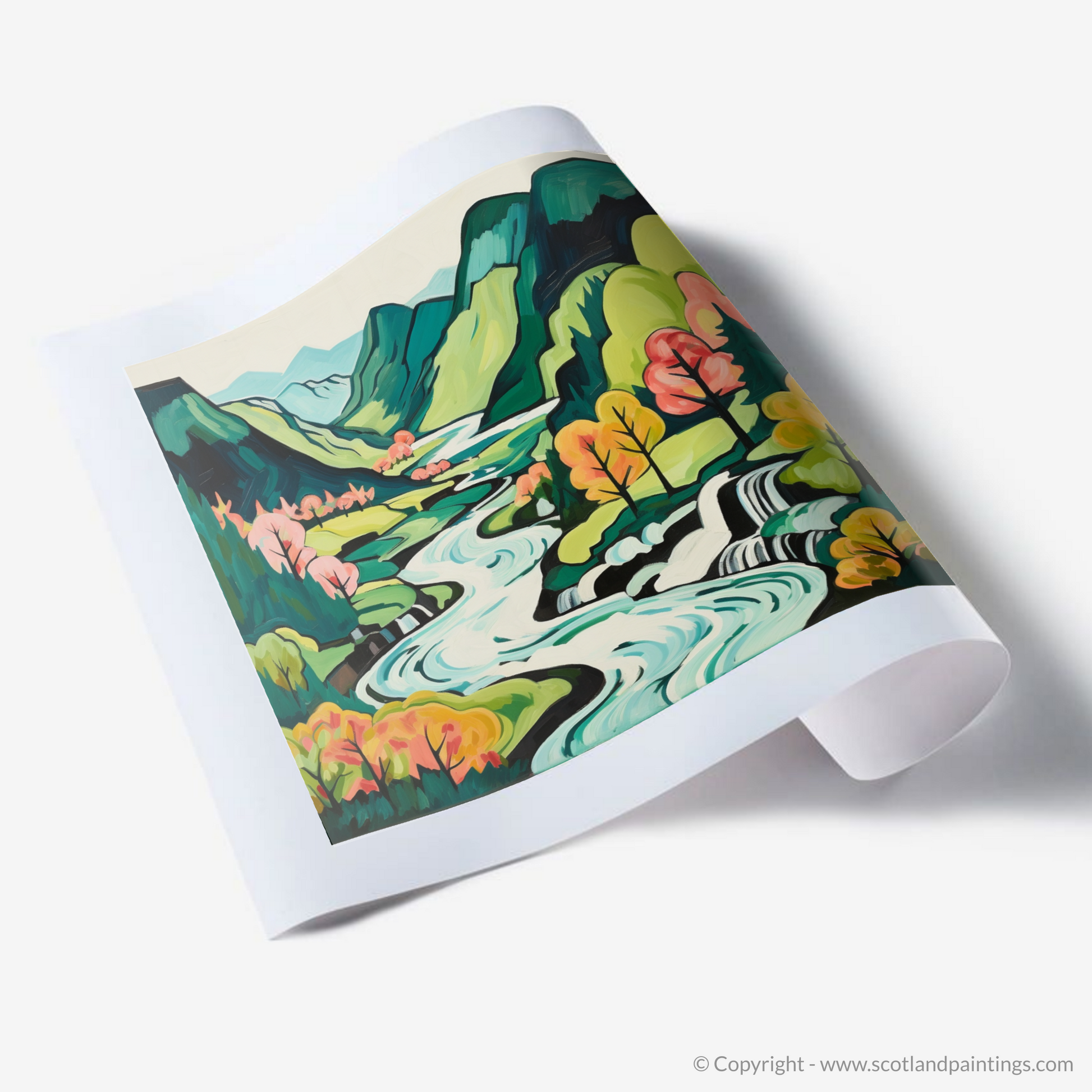 Step into a world of unbridled imagination with this enchanting depiction of Steall Falls, set within the verdant embrace of Glen Nevis. This captivating print presents the viewer with a playful and vibrant interpretation of one of Scotland's natural wonders, as seen through the lens of Naive Art.