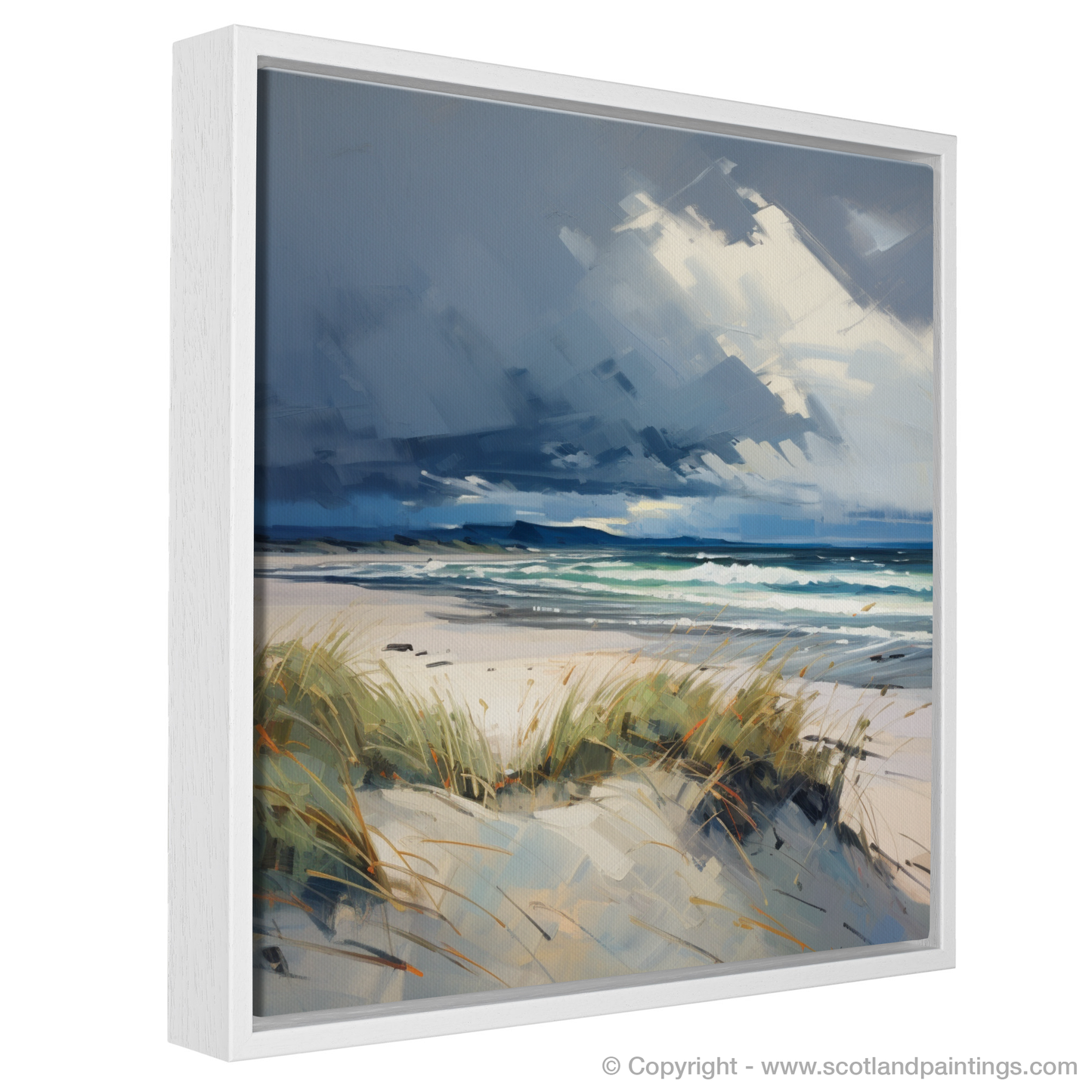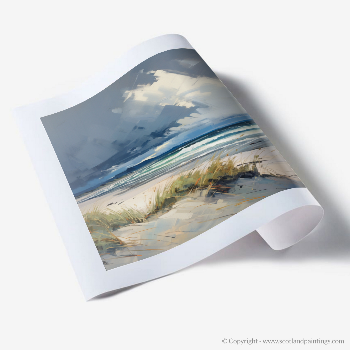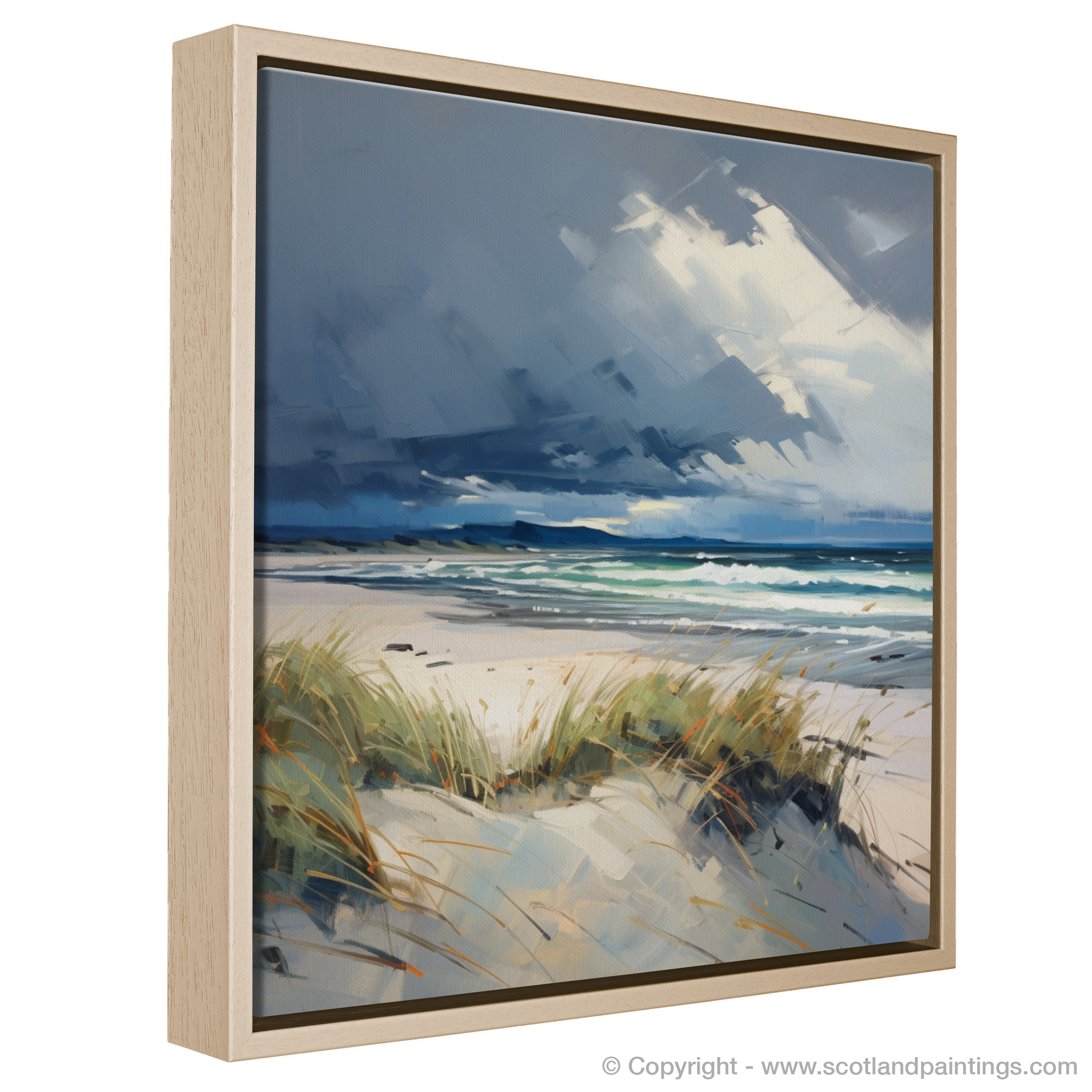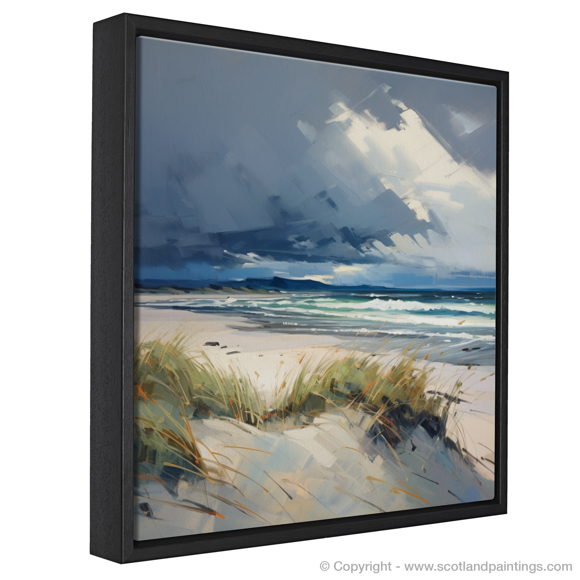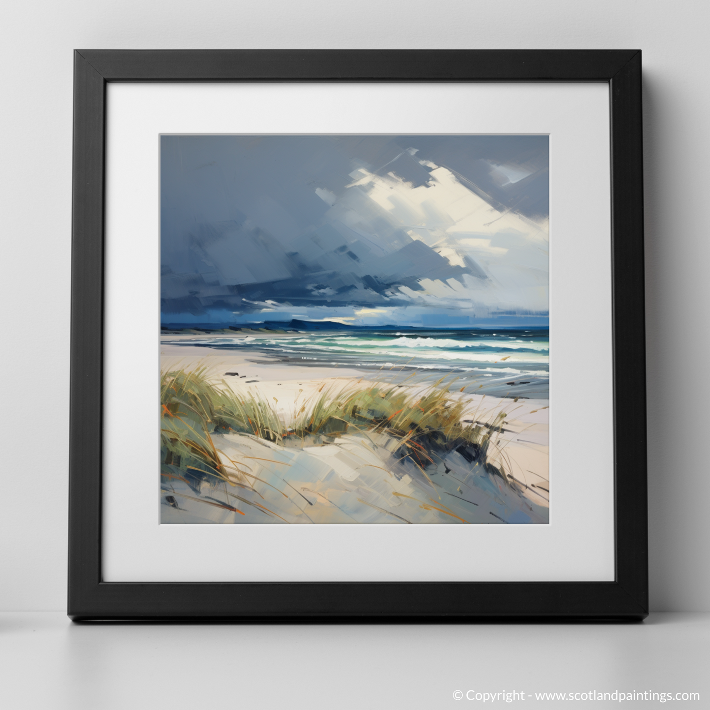 This piece offers a window to the wild Scottish shore, a moment of serenity amidst the brewing turmoil above, embodying the untamed spirit and natural splendour that characterises the Scottish Beaches collection. Whether it becomes a focal point in a room or a subtle nod to nature's drama, this print is sure to evoke the stirring sensations of a coastal storm viewed from a safe, serene vantage point.