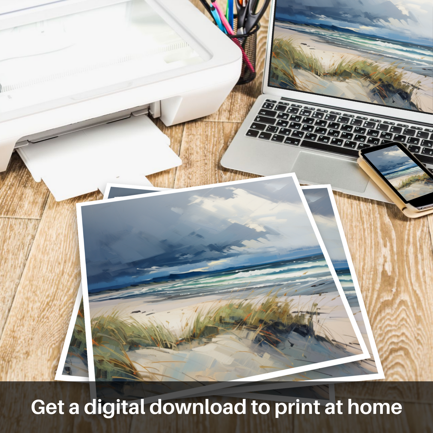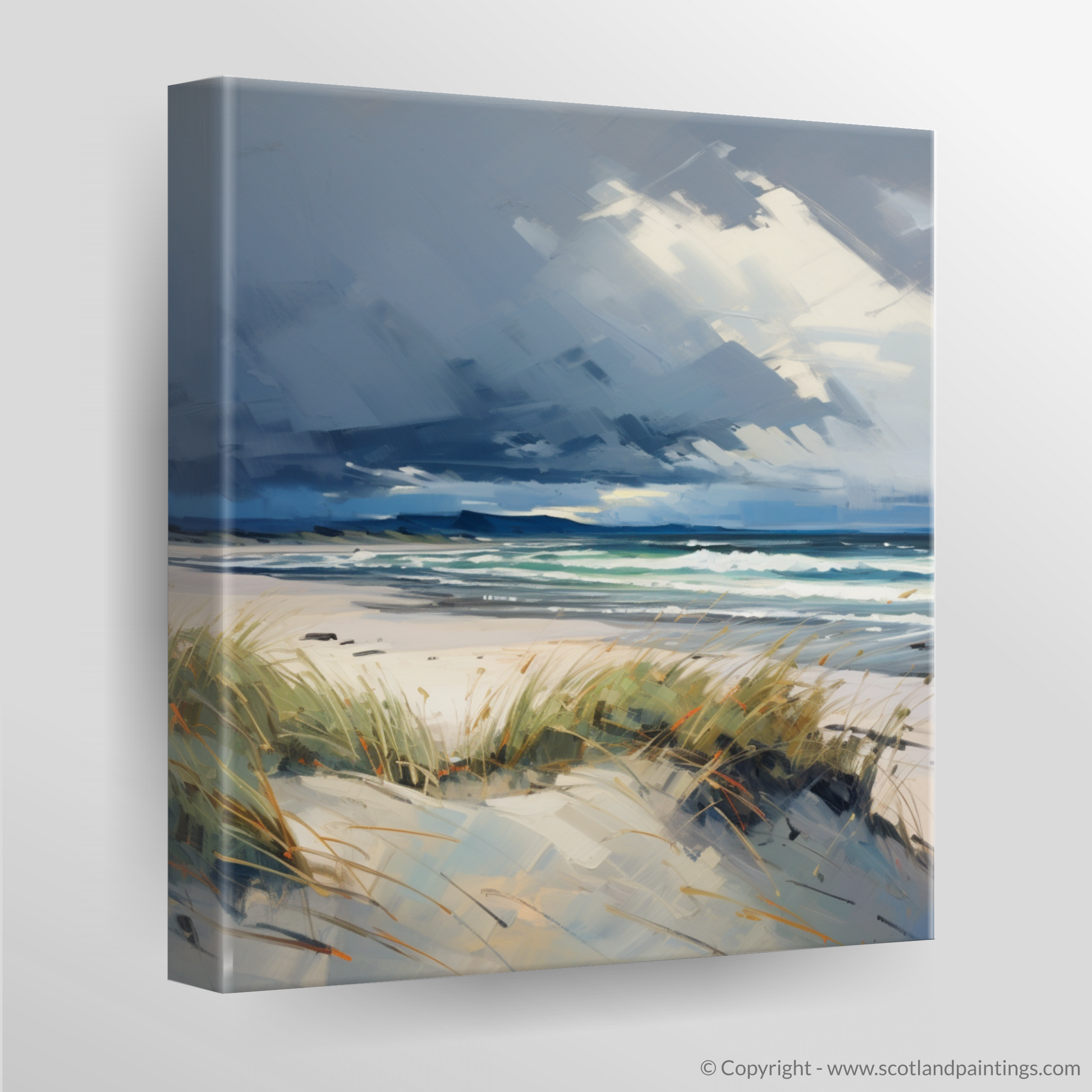Captured in a swirl of moody hues and vivacious brushstrokes, this Impressionist-inspired print beckons viewers to the rugged yet ethereal beauty of Nairn Beach under the spell of an impending storm. The dynamic sky, a brooding symphony of greys and whites, looms over the tranquil seascape, a testament to the capricious nature of the Scottish coastline.