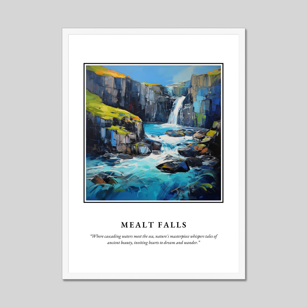 Immerse yourself in the enchanting beauty of Scotland with this captivating framed poster print of Mealt Falls, crafted in the charming Naive Art style. Measuring an impressive 50cm x 70cm, this striking piece captures the rugged majesty of one of Scotland's most iconic natural landmarks. The vibrant portrayal of Mealt Falls, with its cascading waters, exudes a sense of timeless wonder, inviting viewers to pause and dream.