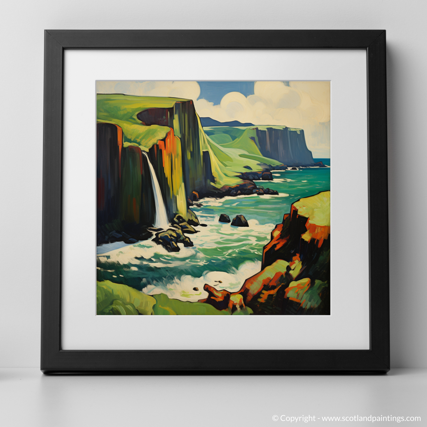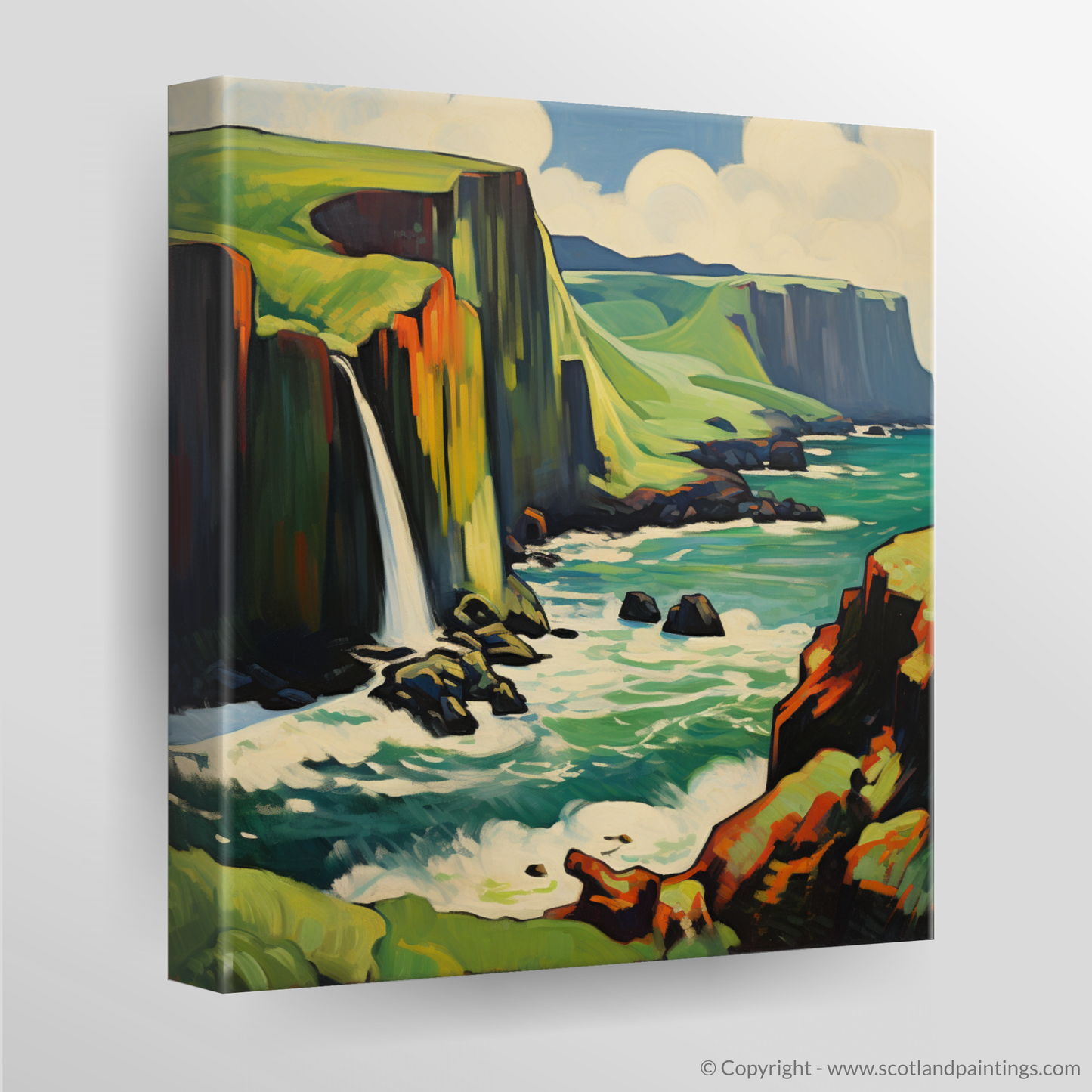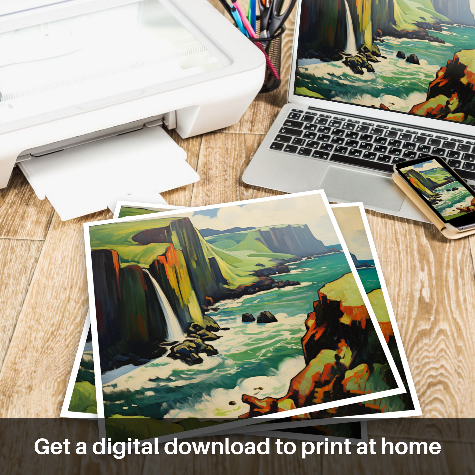 Allow the vibrancy of the Scottish isles to cascade into your space with this stirring rendition of the Mealt Falls on the Isle of Skye, brought to life through the bold and unrestrained lens of Fauvism. This piece captures the raw energy of the landscape, with the falls tumbling fiercely into the sea below.